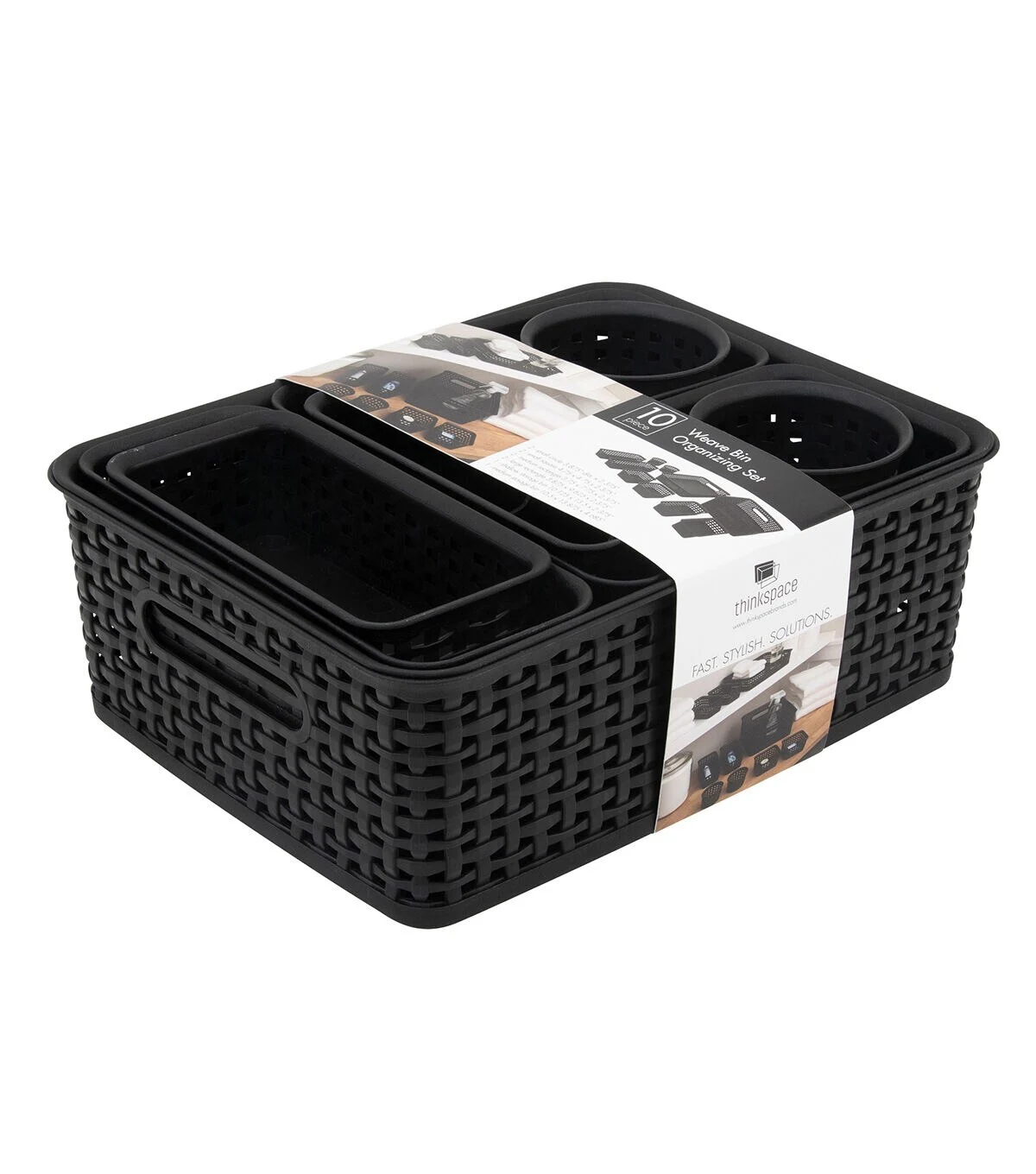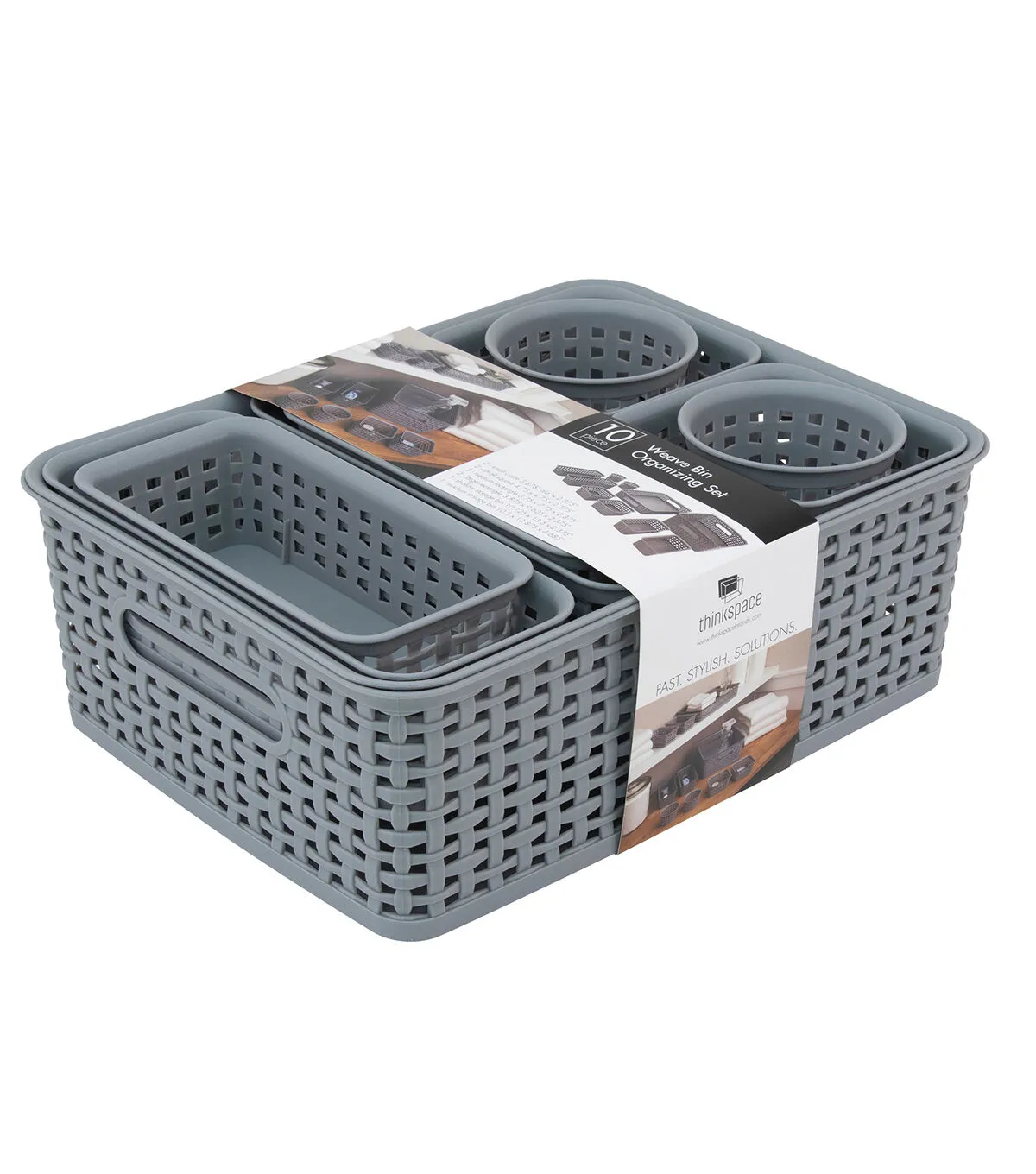 Make clutter disappear with the 10 Pack Weave Bins. This set of 10 weave bins comes in different shapes and sizes to help you utilize your space. You can use the bins separately or nest them to fit your needs. Keep yourself organized at home or in the office with the 10 Pack Weave Bin set.