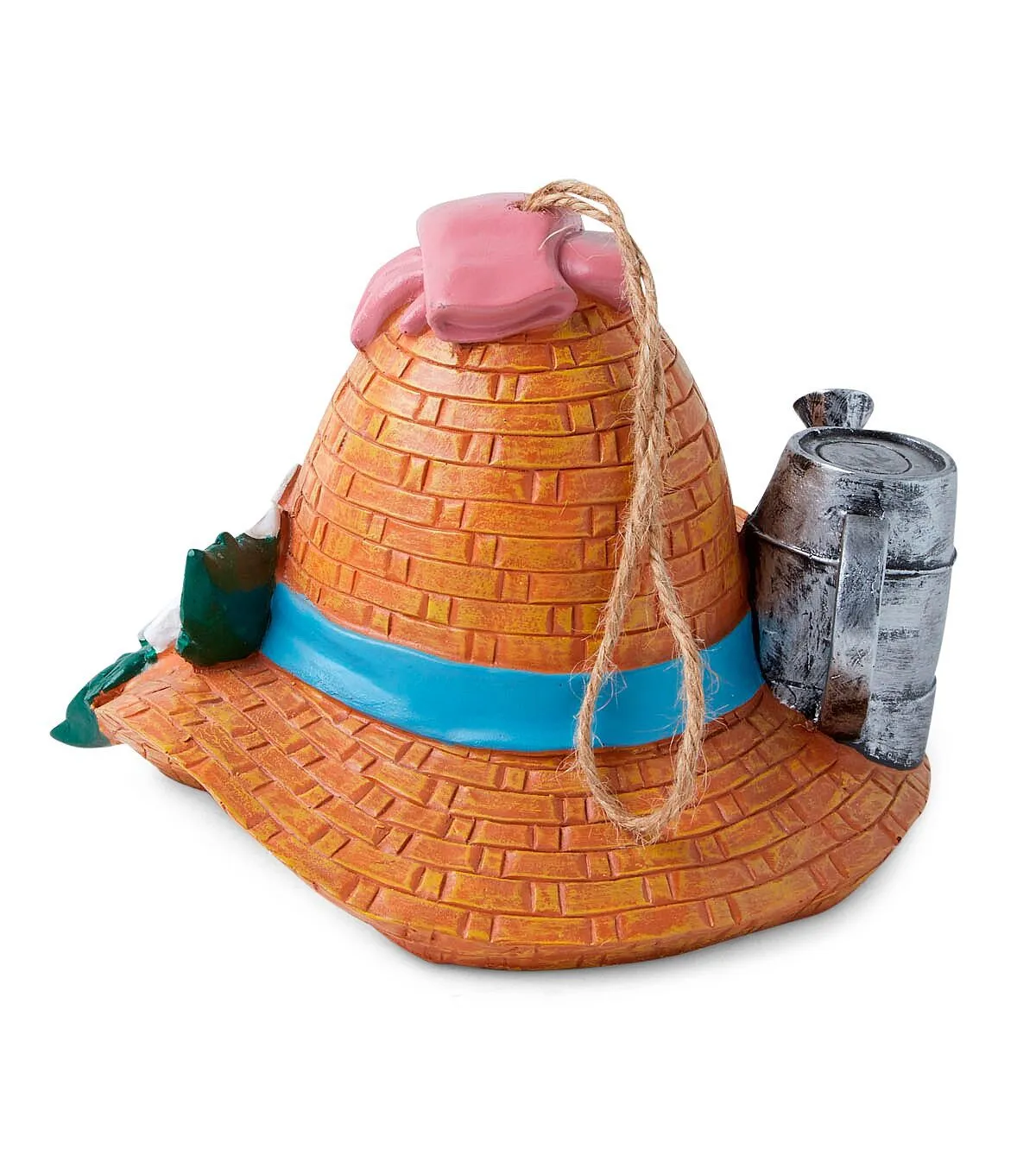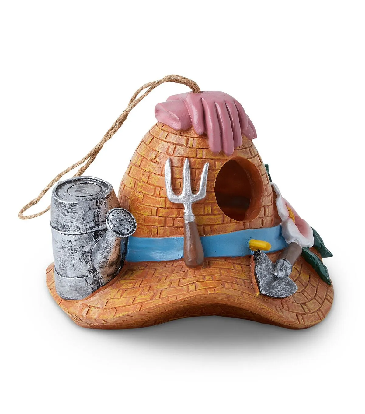 Attract beautiful birds to your patio or front yard using the Spring Brown Sun Hat Gardening Supplies Birdhouse by Place & Time. This birdhouse is shaped like a sun hat and designed with accents resembling a watering can, gardening gloves and other gardening tools for added visual charm. You can also add it to the gift basket of a loved one.
