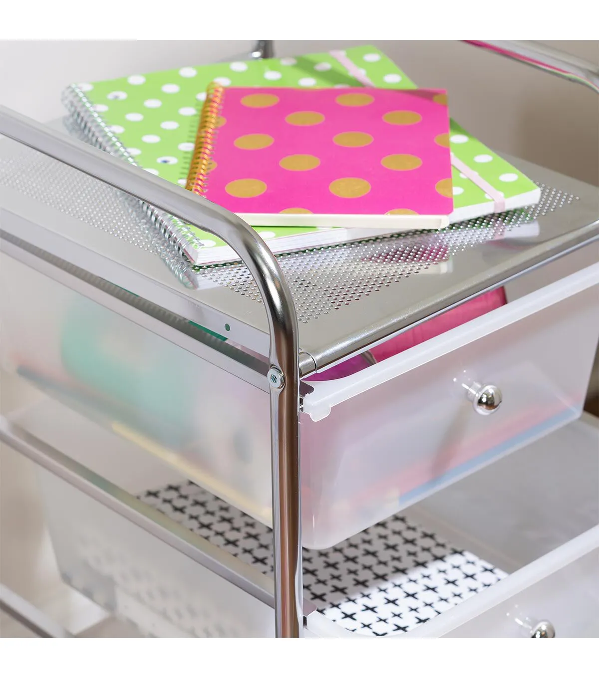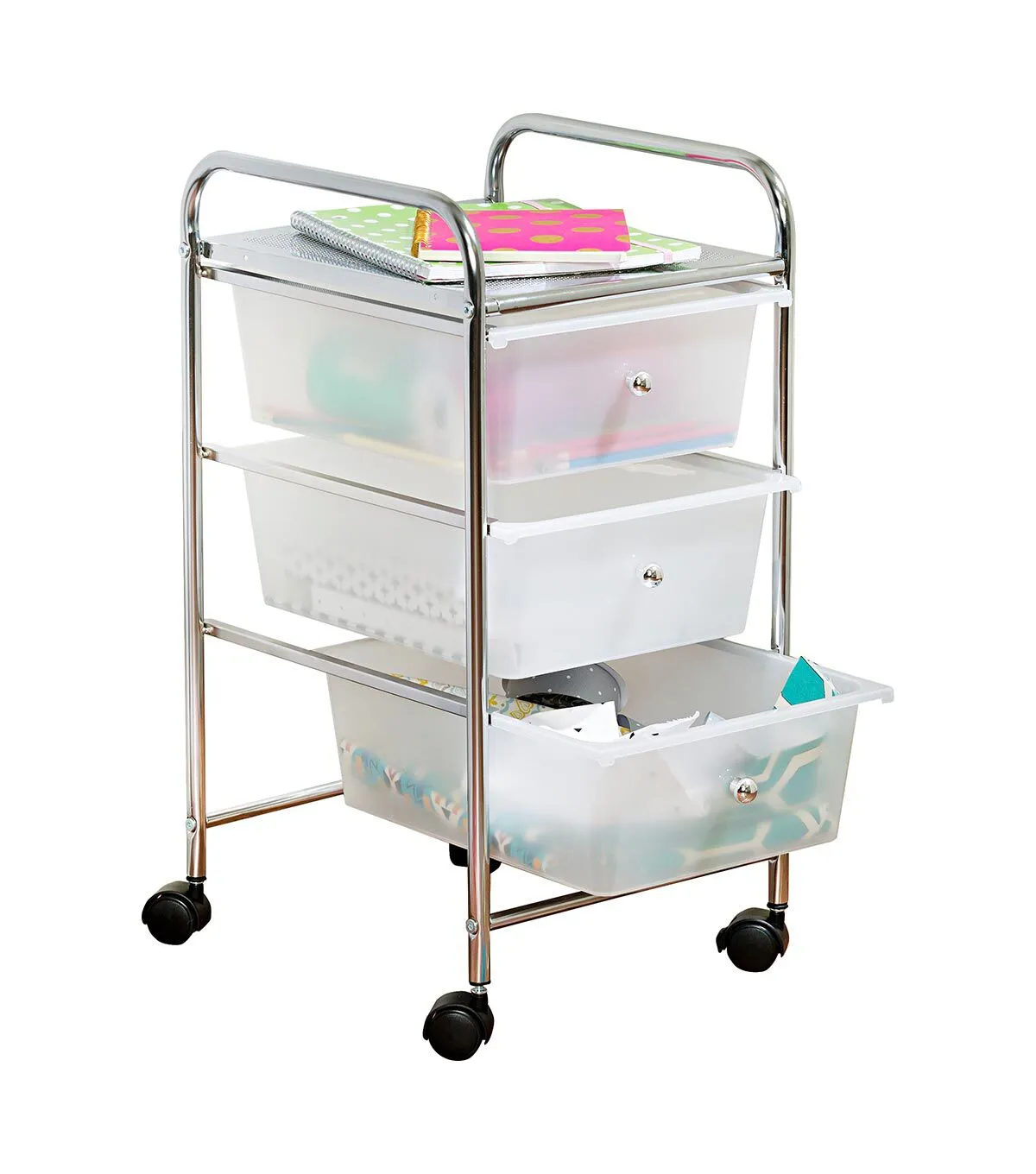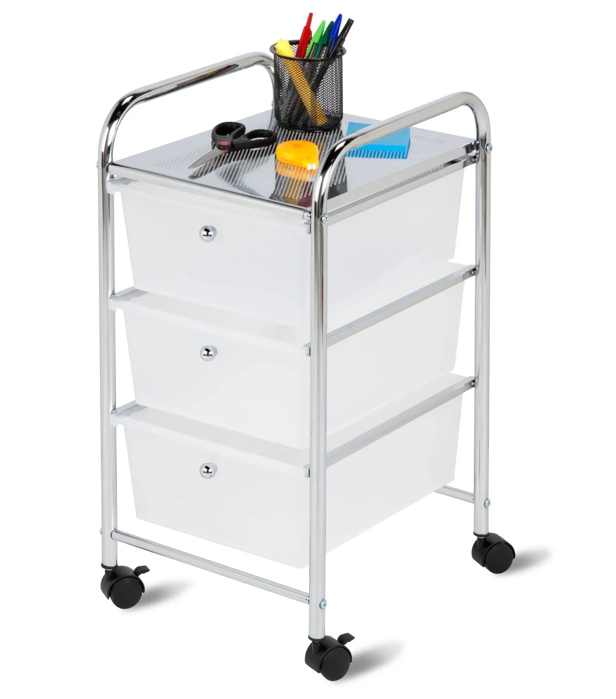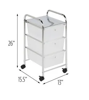 It's Friday morning, and instead of eating at the kitchen table you're working from it. All you need is your laptop, your coffee, and this 3-Drawer Plastic Cart on Wheels to make WFH day your most productive day of the week. When it comes to home office storage ideas, you know this personal caddy has more gusto than Jim on presentation day. Unlike cheap plastic drawer units, the rolling bin is sturdy enough to hold 11 pounds on its top plate and slick enough to wheel around your house without scuffing the floors. And if you're not the desk-job type, try using these small plastic storage drawers to store craft supplies, sewing essentials or your artistic muse..Plastic drawer storage unit with steel chrome-plated design.Small storage unit for home office organization ideas and more.Holds 11 pounds on top plate and 4.4 pounds per drawer.Cart includes four wheels with two locking casters.Rolling storage bin will not scuff or damage floors.Dimensions: 12.6" D x 14.37" W x 24.8" H.CRTN09670