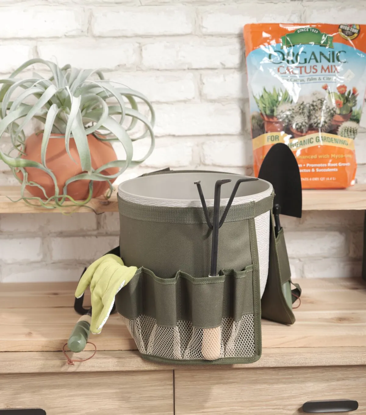 Keep your gardening tools handy with the Spring Green Gardening Tool Bucket Storage Bag by Place & Time. This storage bag in a green hue is designed with multiple pockets in various sizes and comes with handles for ease of carrying. You can also add it to the gift basket of a friend who loves gardening.