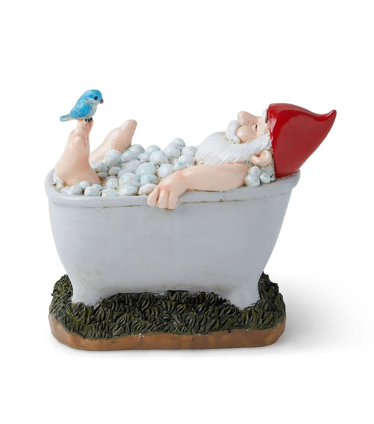 Add a touch of whimsy to your garden decor with the Spring Gnome in Bubble Bath Outdoor Garden Statue by Place & Time. It is shaped like a gnome in a bubble bath with a blue bird perched on this foot. You can place it next to the flower bed or a tree. It will also look wonderful on the porch or balcony.