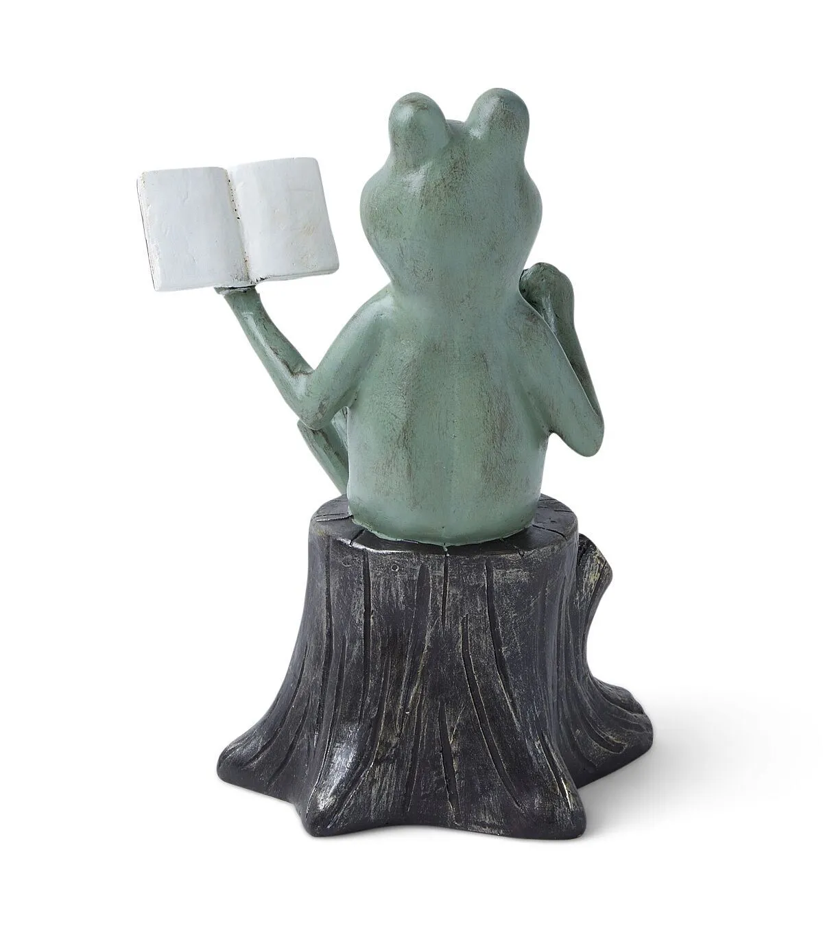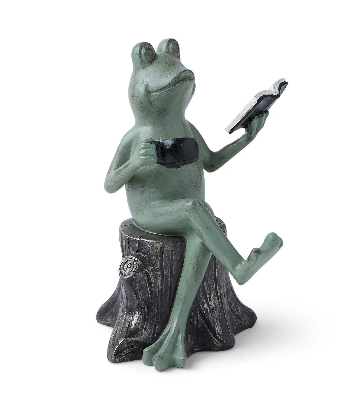 The Spring Reading Frog on Stump Outdoor Garden Statue by Place & Time is sure to add an interesting twist to your garden decor. This statue resembles a frog sitting on a stump. It holds a book in one hand and a mug in the other. You can display it among your favorite blooms. Team it with other statuaries, sold separately, for added visual appeal.