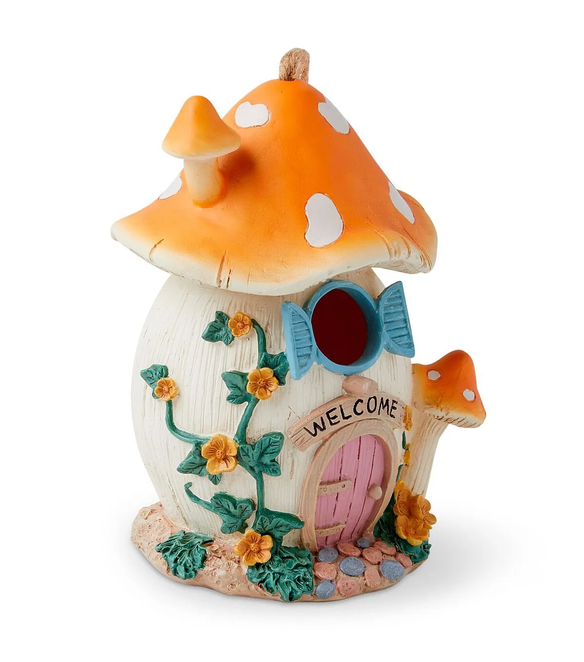 The Spring Yellow Mushroom Fairy Birdhouse by Place & Time is perfect for your patio or garden. This mushroom fairy birdhouse flaunts lovely shades and comes trimmed with accents resembling flowers and vines. Team it with a bird feeder and have your feathered friends visiting you every day. You can also hang it on the front porch using the string loop on top.