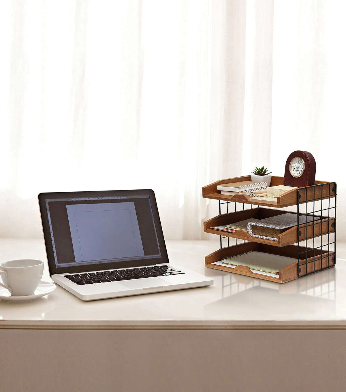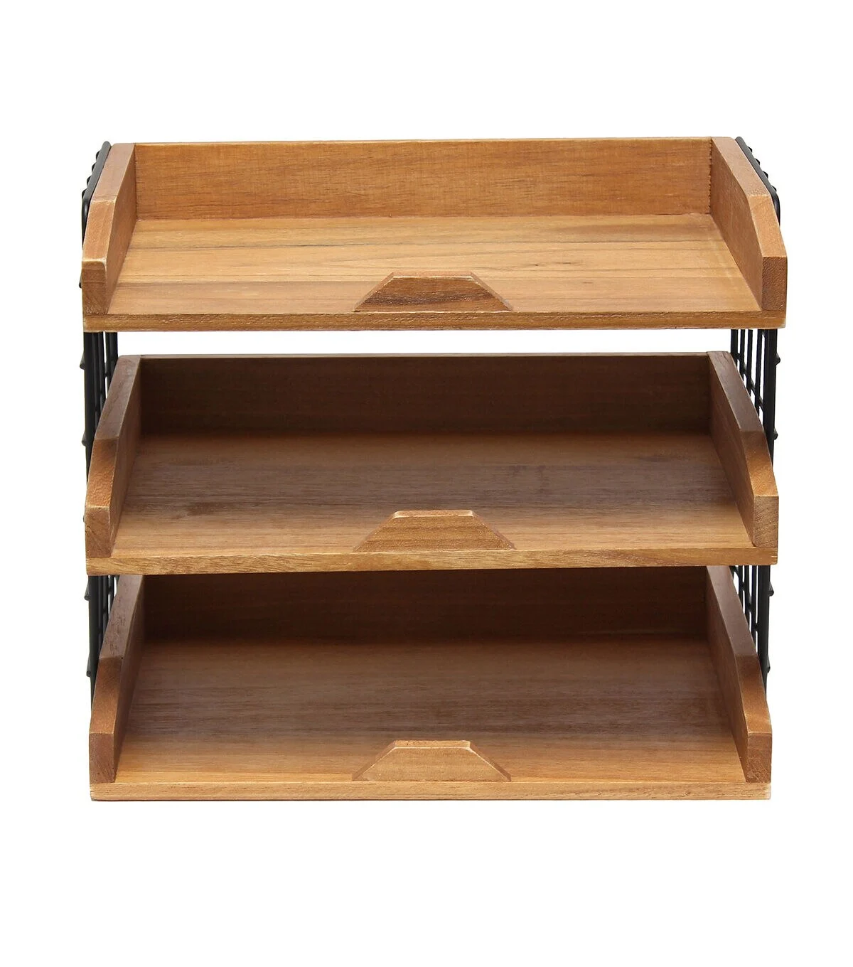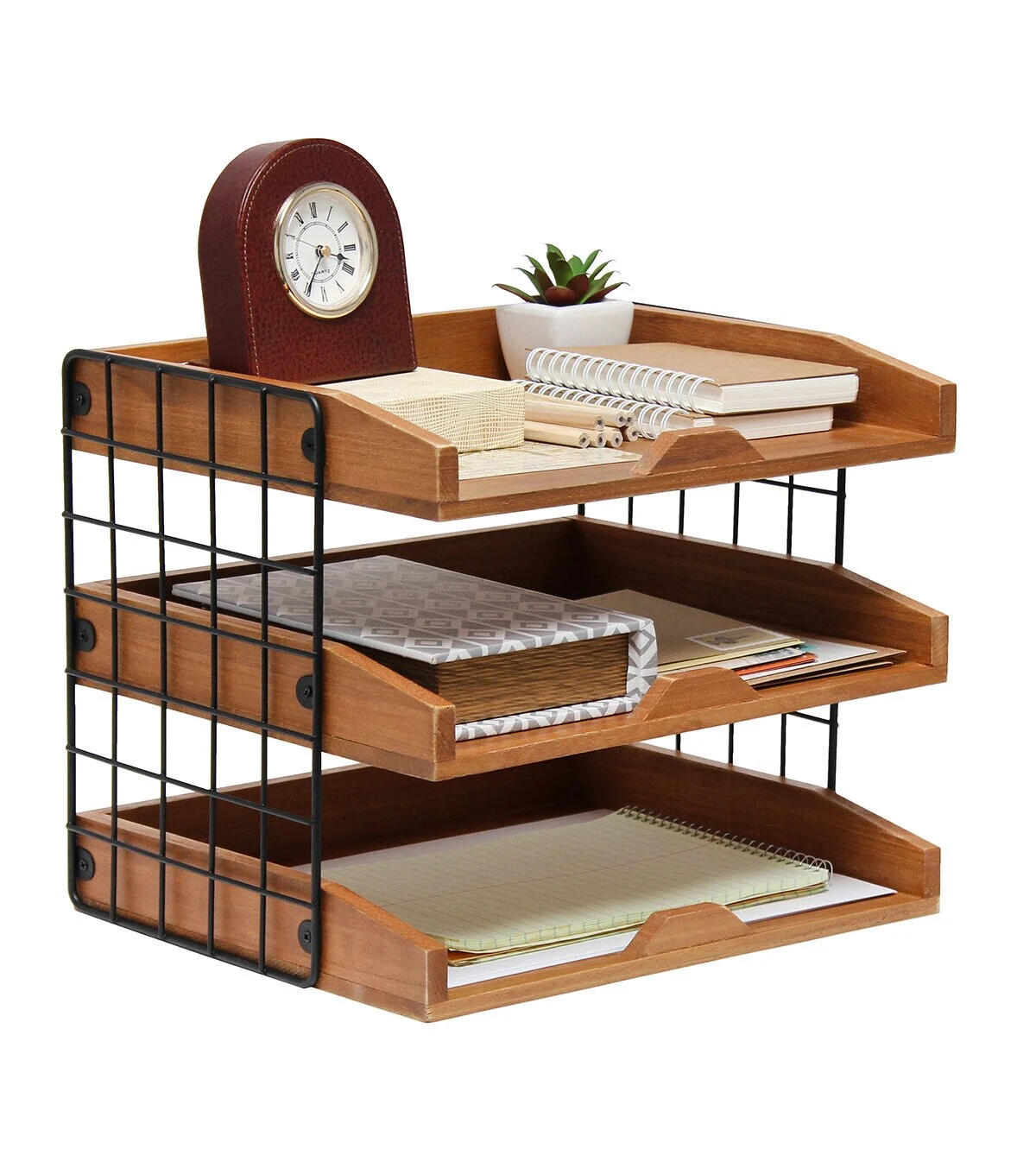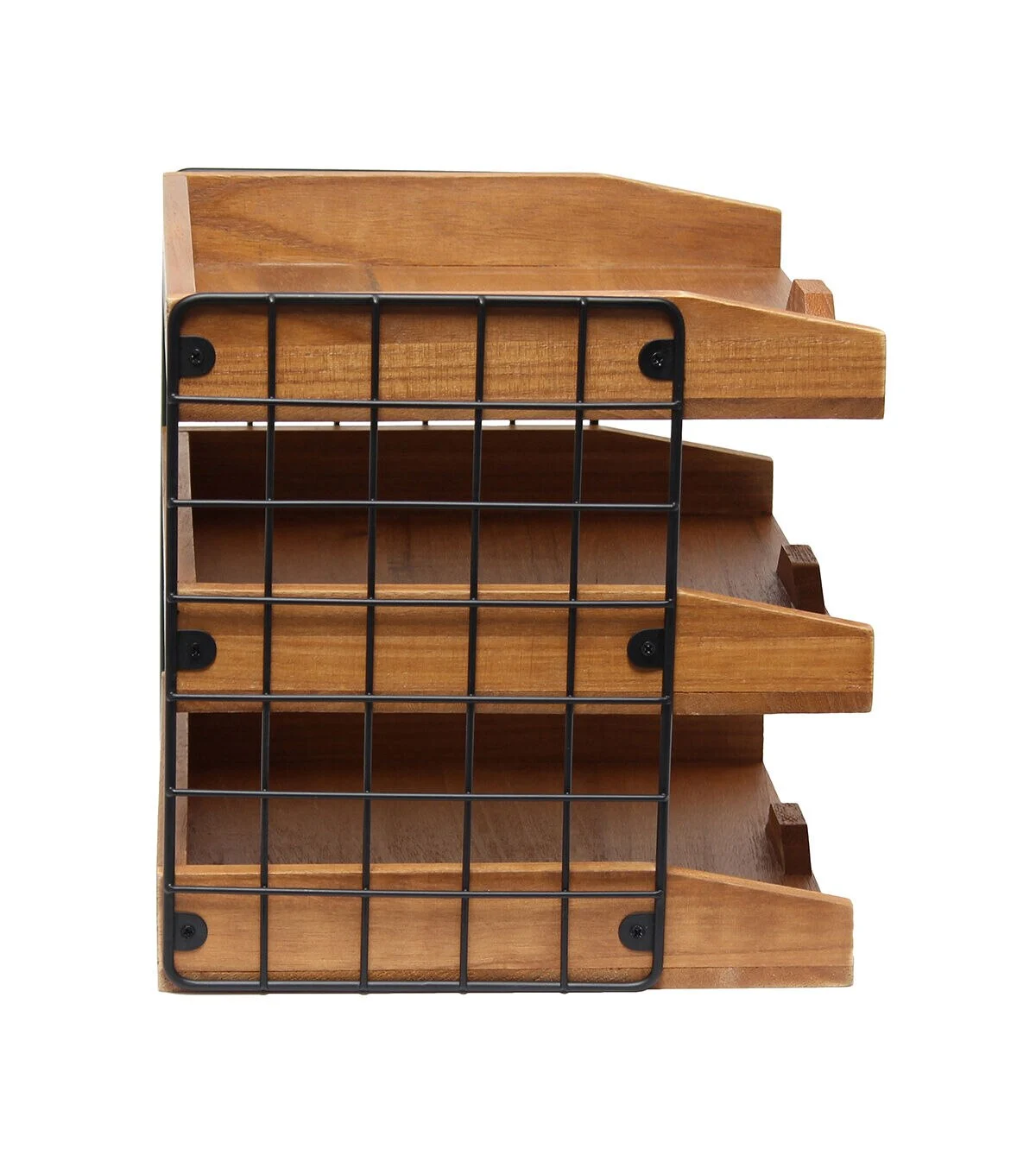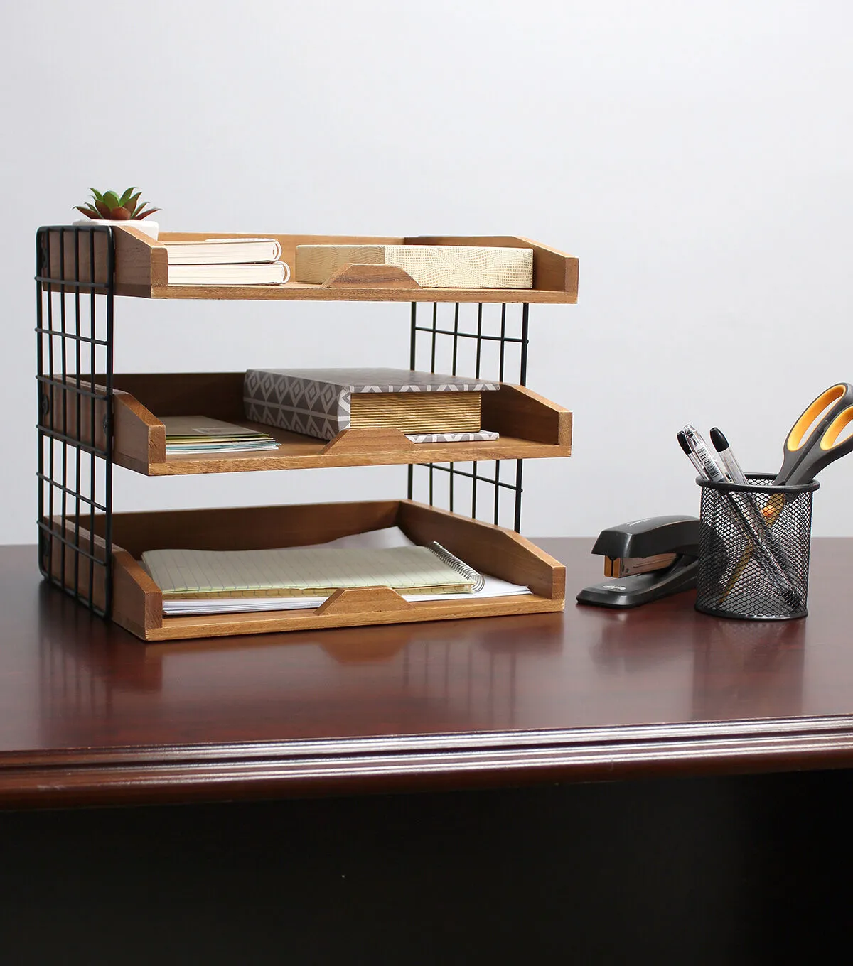 Perfect for storing your paper, notes, mail, folders or other documents in this charming desktop metal and wood organizer. It features 3 wooden trays accented with black metal accents. Each tray can hold standard 8.5x11 paper. Perfect to add a touch of rustic chic to your home office!