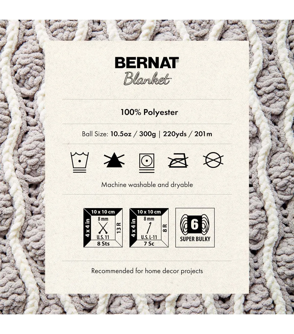 A luxurious, soft and cozy yarn, Bernat Blanket is a chenille-style yarn that’s perfect for home decor projects. From blankets, to crochet baskets, Blanket is ideal for a wide range of projects. Its super bulky weight stitches up quickly, making it a great choice for afghans and blankets. Available in a wide range of solid and variegate shades to compliment your home decor. Economical big ball size for larger projects. Conveniently machine washable and dryable.