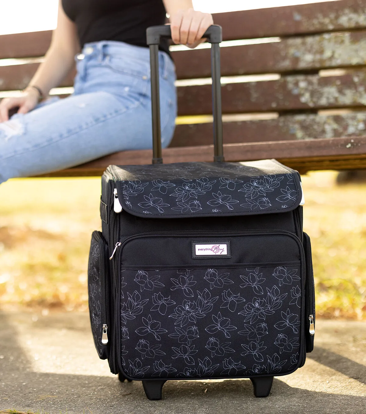 The Everything Mary Collapsible Rolling Craft Bag is the ultimate storage solution for any storage need you may have. This rolling organizer cart is constructed with durable polyester and features premium zippers, piping, and an Everything Mary emblem. 17 total storage spaces are built into this scrapbook storage case for all of your tools, sewing notions, or other supplies. The main compartment on this rolling craft organizer is perfect for scrapbooking IRIS boxes, paper, crafts, containers, and so much more! This scrapbook rolling tote features a telescoping locking handle and a durable wheelset for secure craft storage. The Everything Mary Collapsible Rolling Craft Bag was made with crafters in mind.