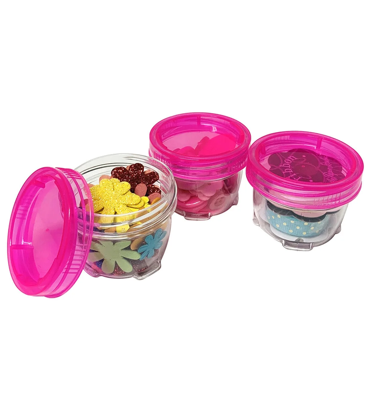 The Everything Mary Stackable Jars with Pink Lids is perfect for storing knick-knacks, sewing supplies and craft supplies. These stackable jars are made of durable plastic, and feature screw on lids to keep the contents secure. You can either lock them in place or use each one individually. The pack consists of three jars.