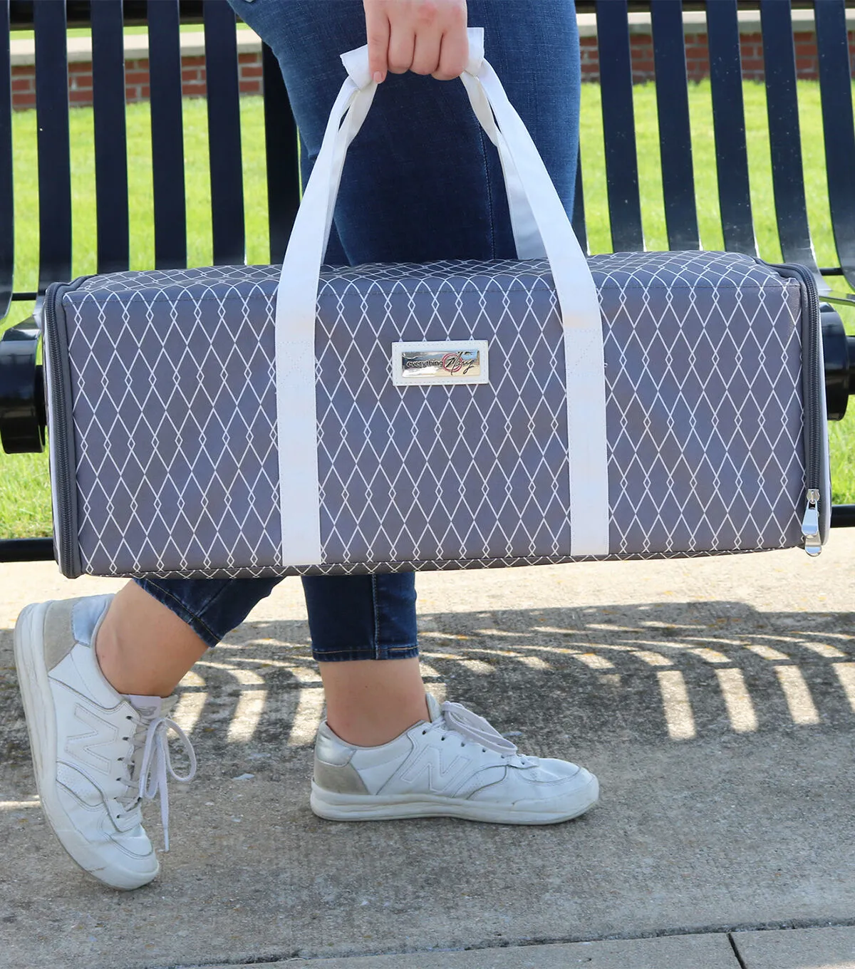 The Deluxe Collapsible Die-Cut Machine Carrying Case by Everything Mary is the best carrying case for storing your die-cut machine. Our organizer case is compatible with the most popular machines from Circuit and Silhouette and will ensure your machines make it to its next destination quick and easily. This scrapbook case features several different storage pockets for your pens, tools, markers, supplies, ink. This organization bag is super stylish, versatile, and is collapsible. Our Die-Cut Machine Carrying Case comes in two fantastic and elegant prints. Attention to detail is at a premium, with this bag being uniquely designed for the die-cut machine user. This bag is collapsible and lays flat, making for easy stowing away when not in use. This bag is constructed with high quality polyester and is accented with a chrome Everything Mary Logo and premium zippers. A velcro-enclosed handle makes this bag easy to travel to and from with. Customers who purchase from Everything Mary continue to be impressed with the quality of the products we create and are excited to use our storage in their craft and sewing rooms. Our Die-Cut Machine Carrying Case comes in two fantastic and elegant prints. Attention to detail is at a premium, with this bag being uniquely designed for the die-cut machine user. This bag is collapsible and lays flat, making for easy stowing away when not in use. This bag is constructed with high quality polyester and is accented with a chrome Everything Mary Logo and premium zippers. A velcro-enclosed handle makes this bag easy to travel to and from with.
