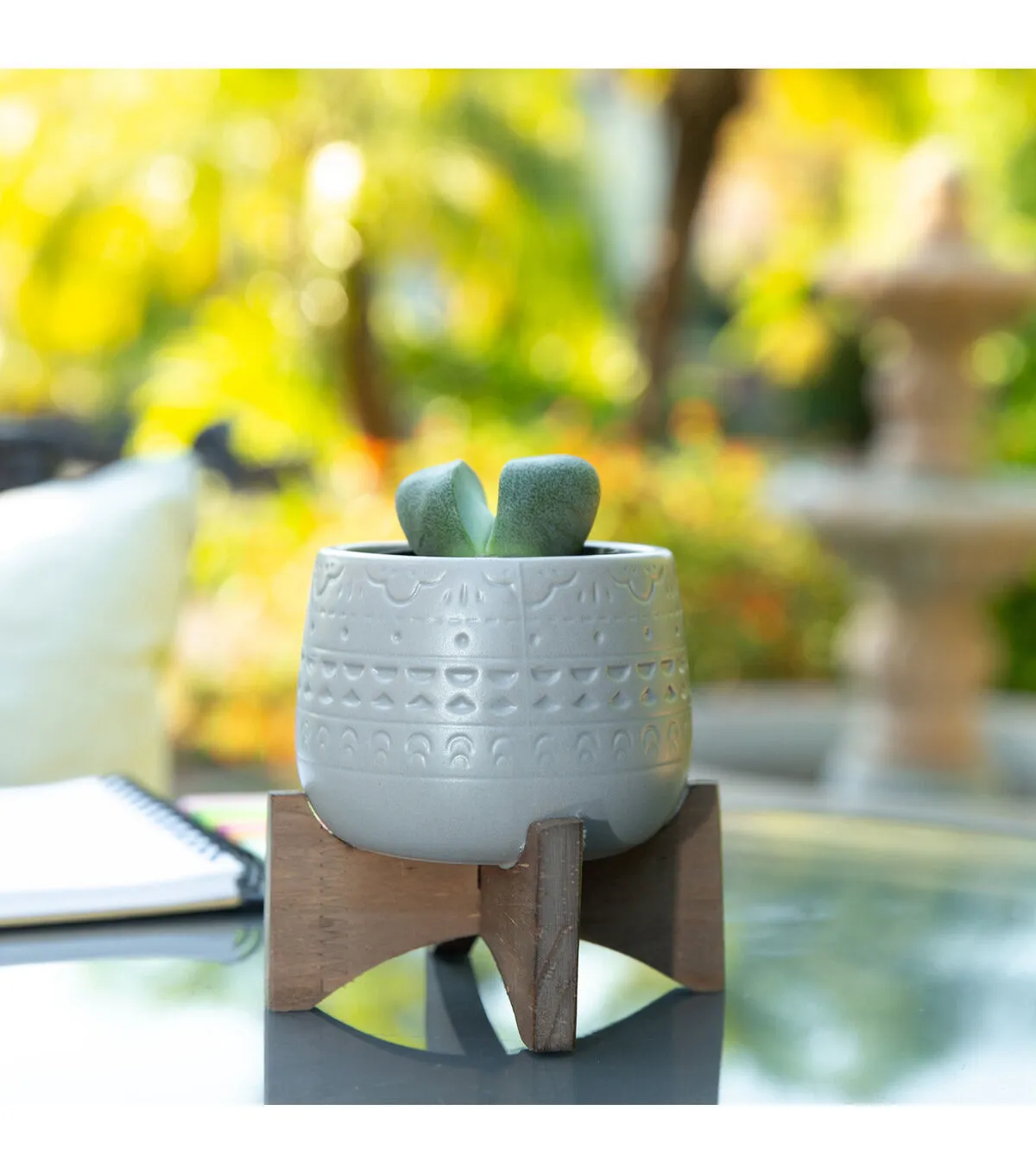 Stand by me! Place this 3.5�� Mayan Ceramic Planter on a Wood Stand anywhere in your home to create an indoor oasis. Handcrafted by Artisans, our 4.75��x4.75��x4.5�� ceramic planter on a wood stand will help upgrade your plant game in style. Made of ceramic and painted light gray with a matte finish, this tabletop planter will add a bit of chic nature to your living space.The perfect planter for planting succulents, terrariums, and indoor house plants. Buy a few at a time, so you can start your own little garden indoors!Handcrafted by ArtisansMeasurement: 4.75��x4.75��x4.5��Color: Light GrayMaterial: Ceramic, Wood**No Drainage Hole. Indoor Use Only!*