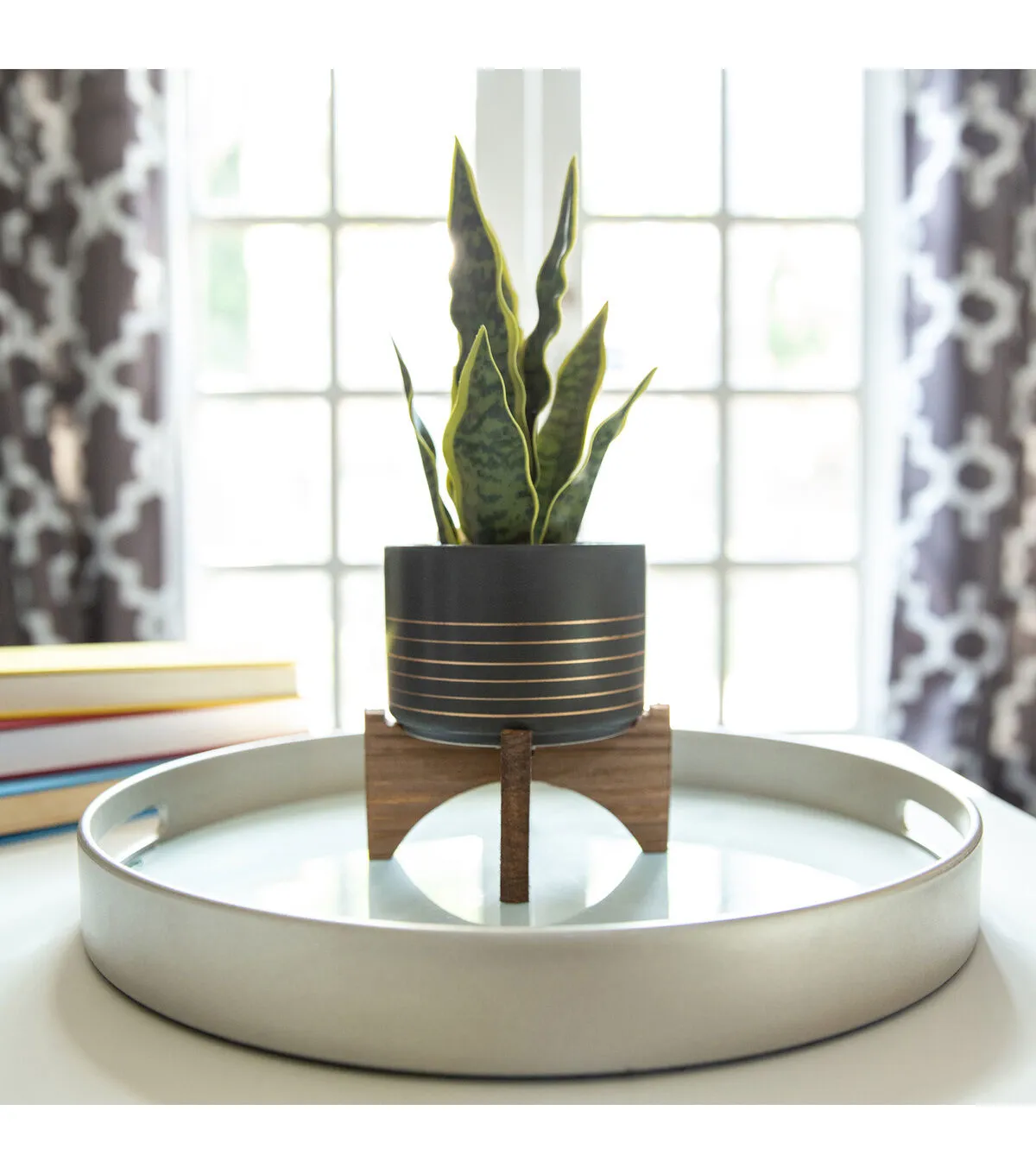 Stand by me! Place this 4.75�� Black with Gold Lines Ceramic Planter on a Wood Stand anywhere in your home to create an indoor oasis. Handcrafted by Artisans, our 5.5��x5.5��x5.75�� ceramic planter on a wood stand will help upgrade your plant game in style. Made of ceramic and painted black with gold lines, this tabletop planter will add a bit of chic nature to your living space.The perfect planter for planting succulents, terrariums, and indoor house plants. Buy a few at a time, so you can start your own little garden indoors!Handcrafted by ArtisansMeasurement: 5.5��x5.5��x5.75�� Color: Black/GoldMaterial: Ceramic, Wood**No Drainage Hole. Indoor Use Only!*