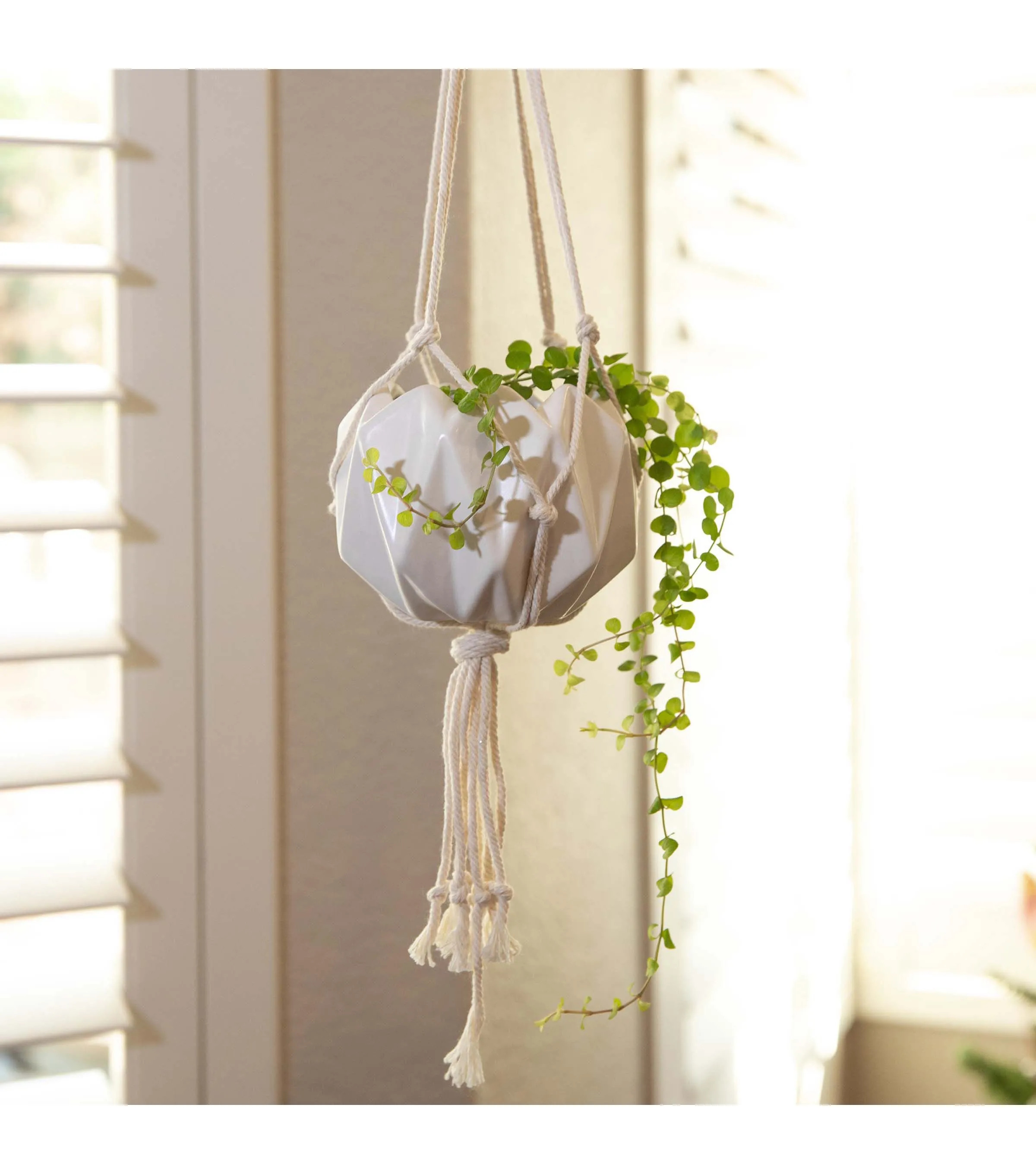 Hang with me! Hang this Geometric Ceramic Planter anywhere in your home to create an indoor floating oasis. Handcrafted by Artisans, our macram茅 hanging planter will help elevate your plant game in a modern style. Made of ceramic with geometric patterns and painted matte white, this 5"x5"x4" hanging planter will add a bit of chic nature to your living space. Buy a few at a time, so you can start your own floating garden indoors! Handcrafted by ArtisansMeasurement: 5��x5��x4�� Color: Matte WhiteMaterial: Ceramic, Rope **No Drainage Hole. Indoor Use Only!**