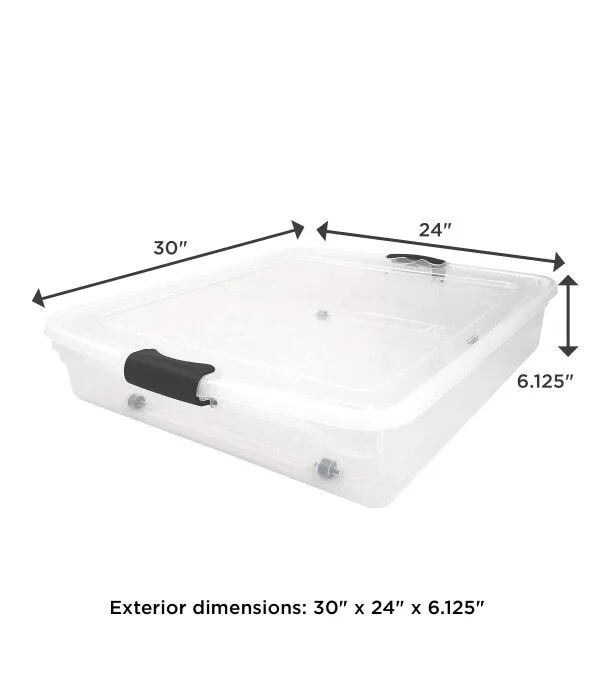 Keep your knickknacks organized with the Plastic Underbed Storage Container with Latching Handles - Clear & Gray. This durable plastic container is designed with large, gray ergonomic latching handles. You can use it to store holiday ornaments, clothes, small toys and more. It will fit under most full or queen beds.