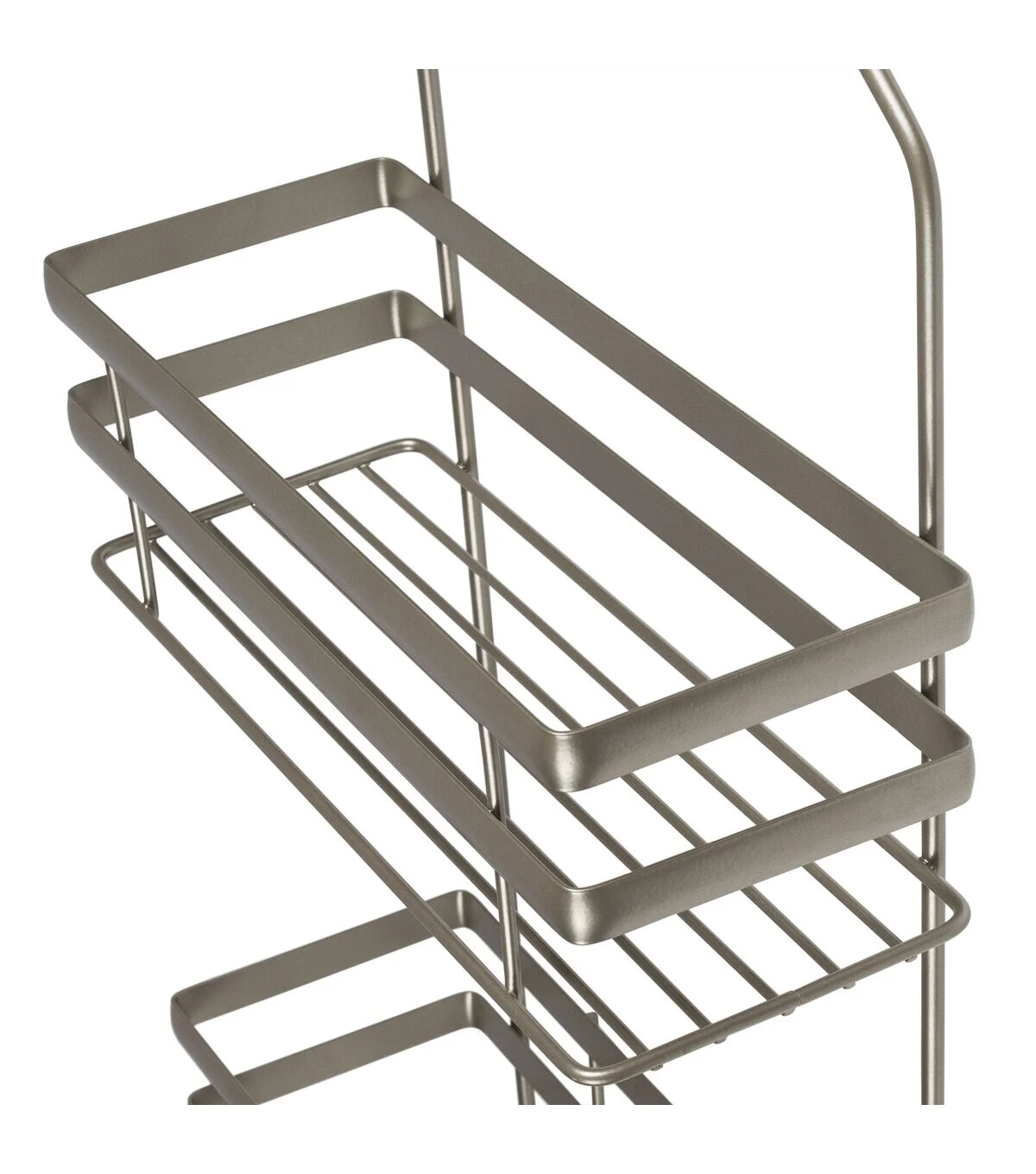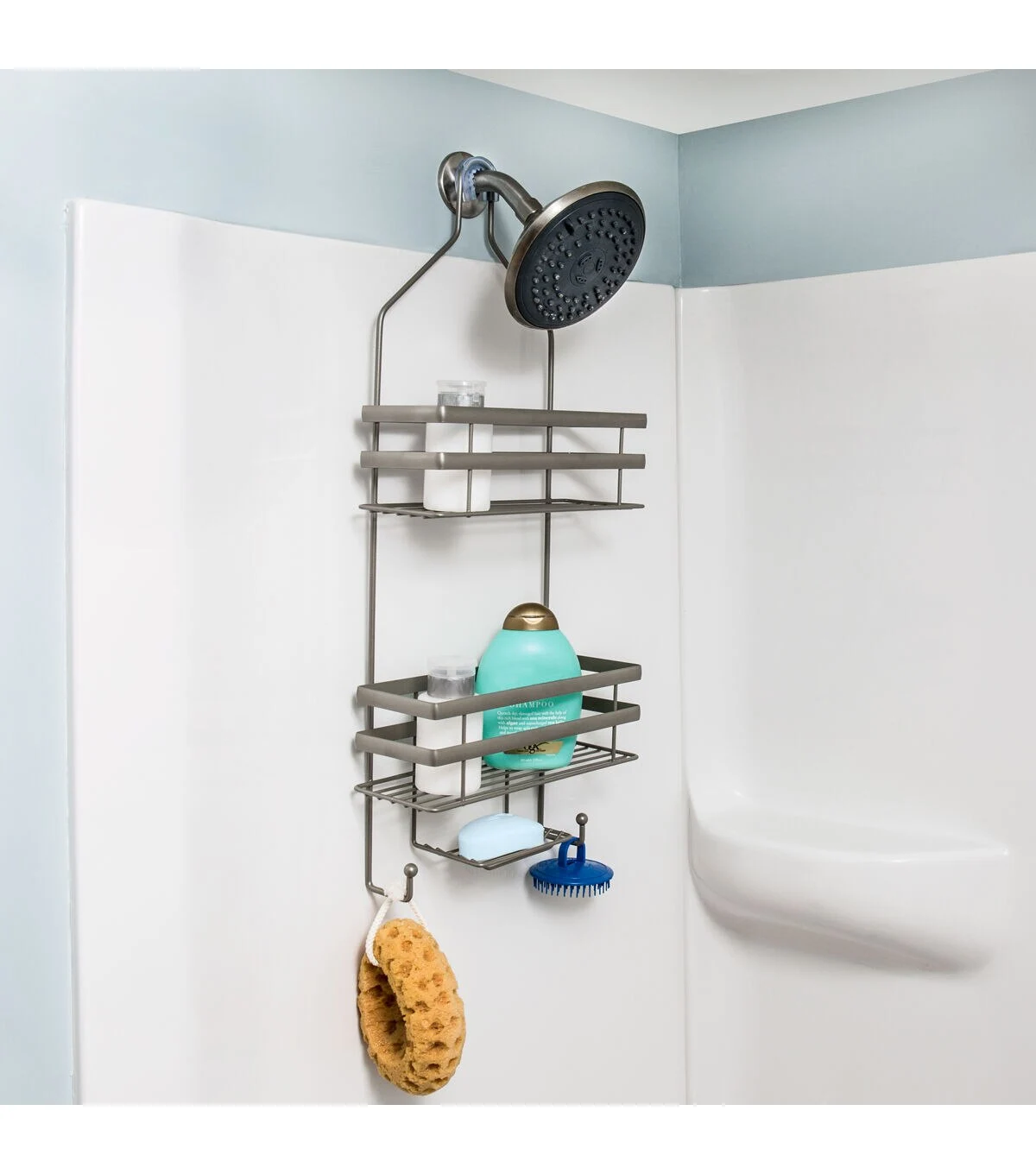 The shower caddy of all shower caddies, this bathroom organizer securely fits on almost any shower head and provides the ultimate shower storage, which eliminates the need for shower shelves or a standing corner shower caddy. Its hooks and soap tray give you plenty of space for all your shower accessories and its suction cups keep it firmly in place.