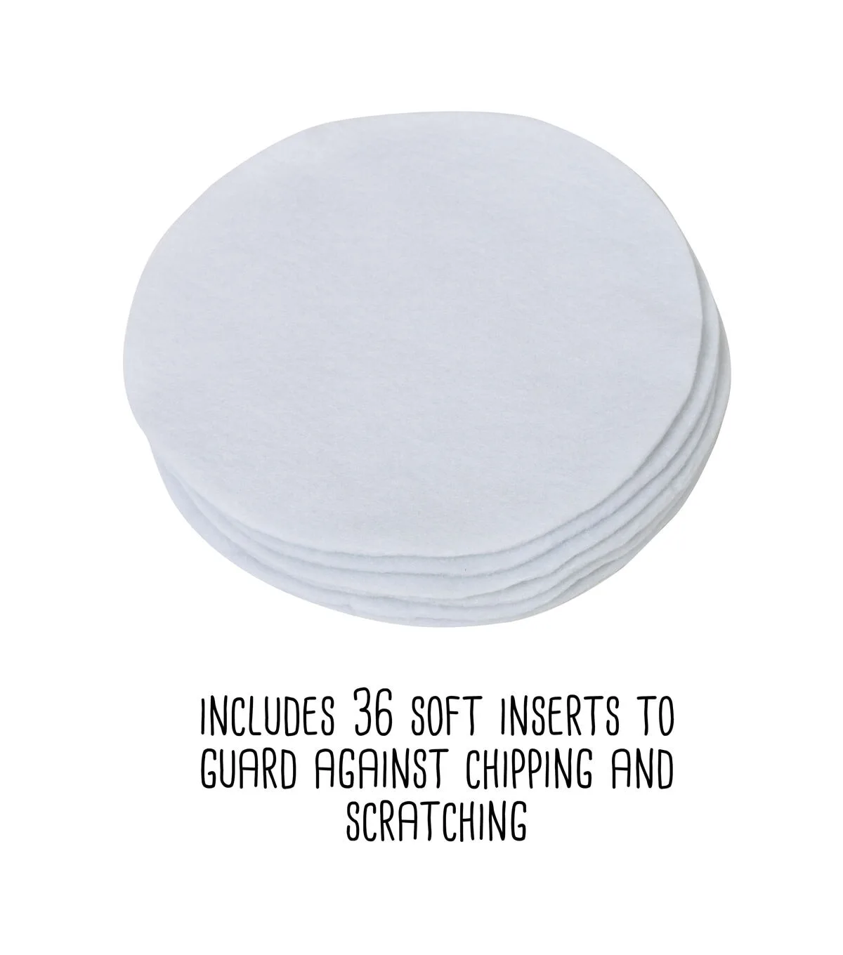 - Includes 36 soft inserts to guard against chipping and scratching