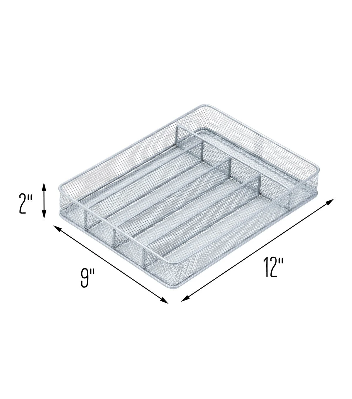 Your kitchen drawers can become quite disorganized, but not for long. This 5-compartment drawer organizer fits all your standard silverware neatly in its own place. The mesh construction is easy to clean and the low 2-inch height profile makes it fit most standard sized drawers. Its versatility allows it to also serve as an office drawer organizer or even a makeup drawer organizer.