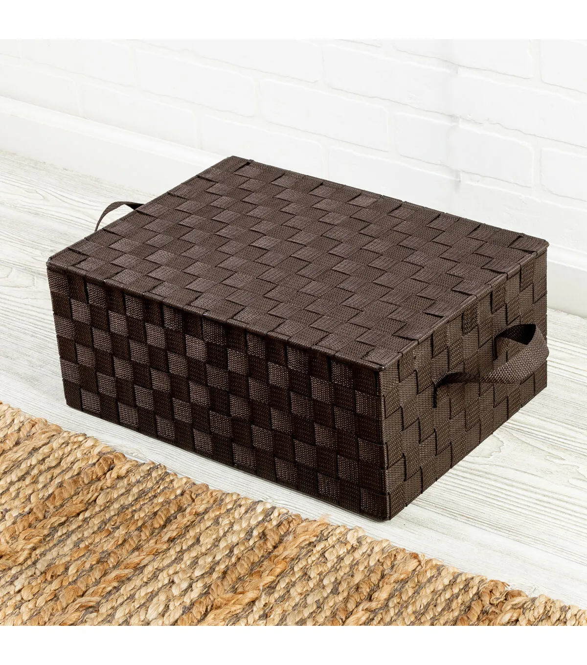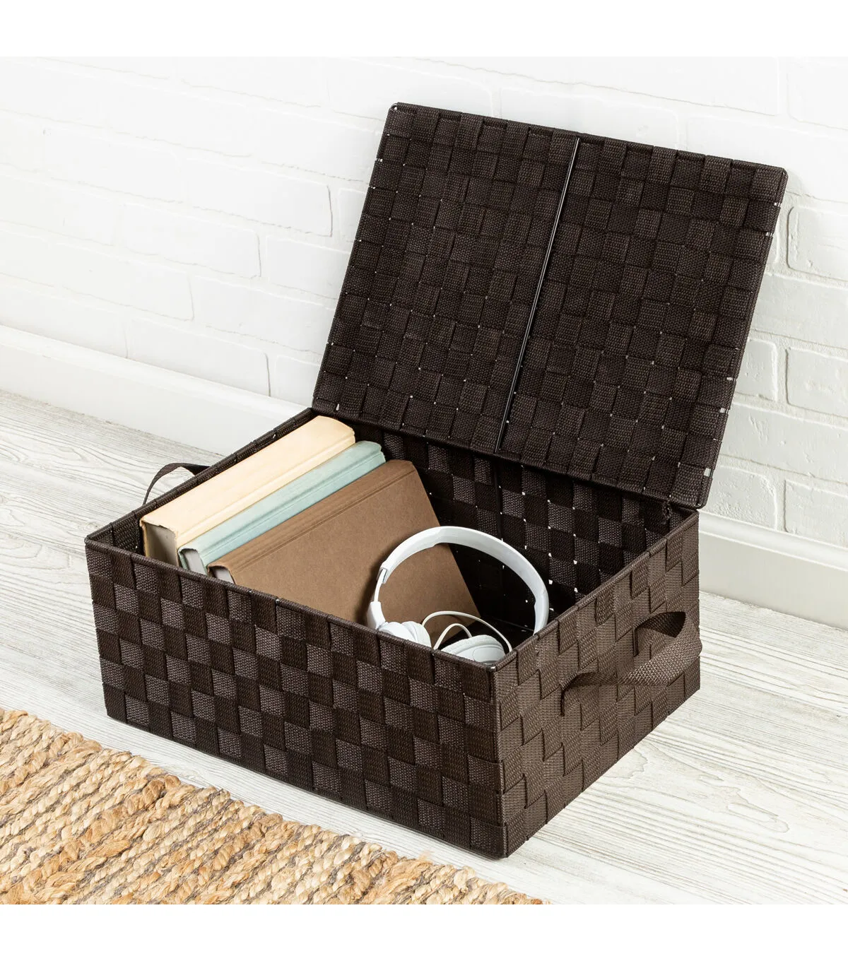 Clear the clutter with this hinged-lid storage box in contemporary woven strapping. Measuring 17 inches long x 12 inches wide and 7 inches high, this storage solution provides ample space for stashing odds and ends. The durable woven strapping will stand the test of time and add a unique look to your home or office. Coordinates with other pieces in Honey-Can-Do's collection of double woven products.