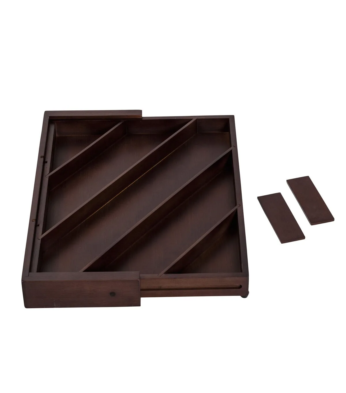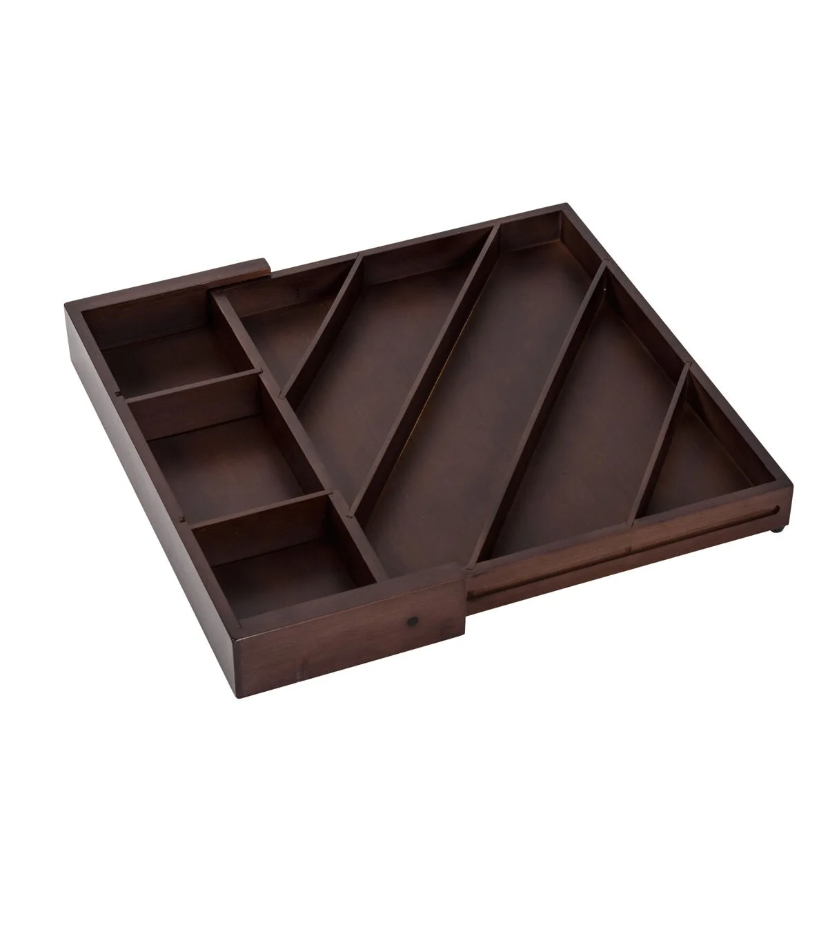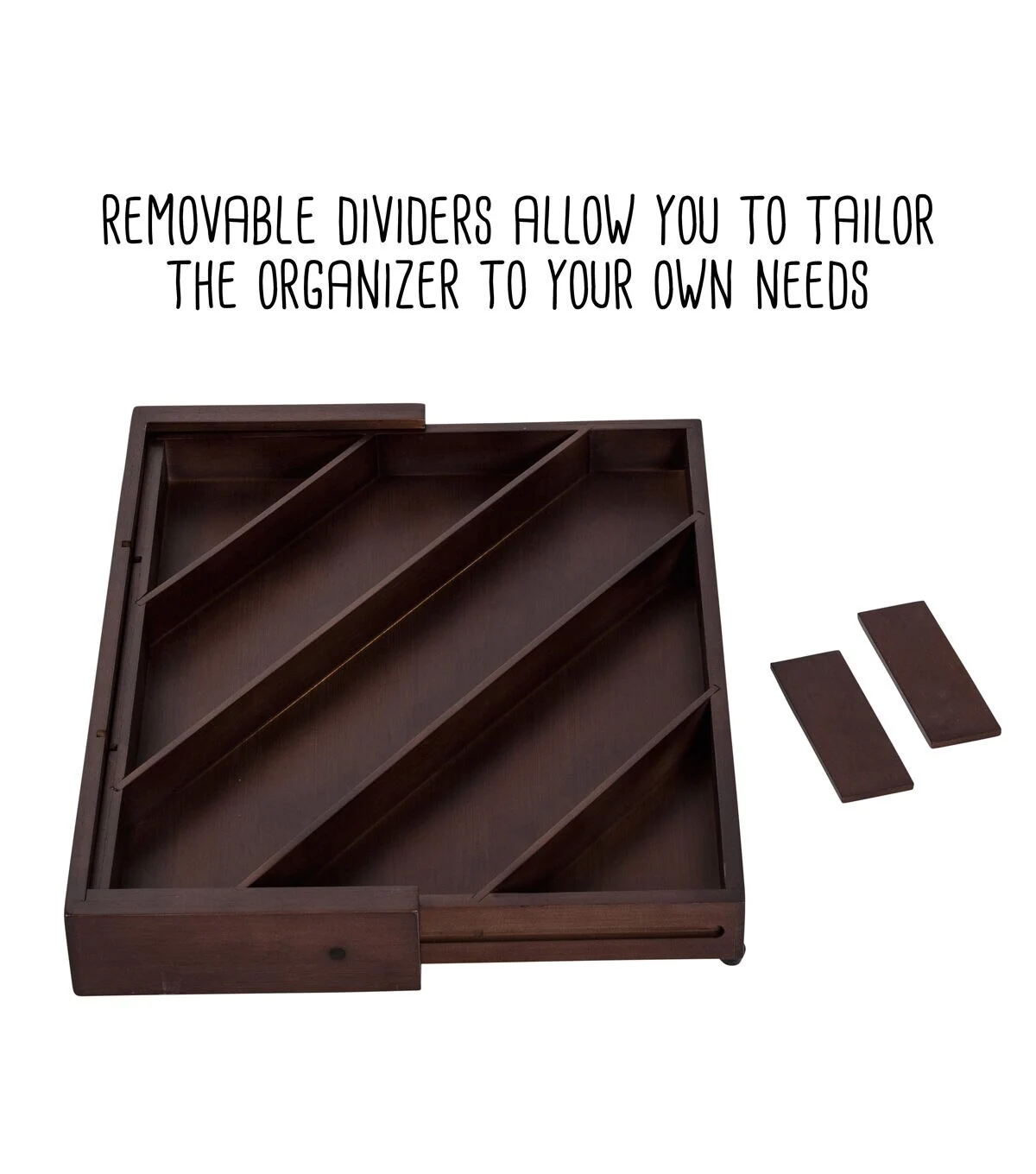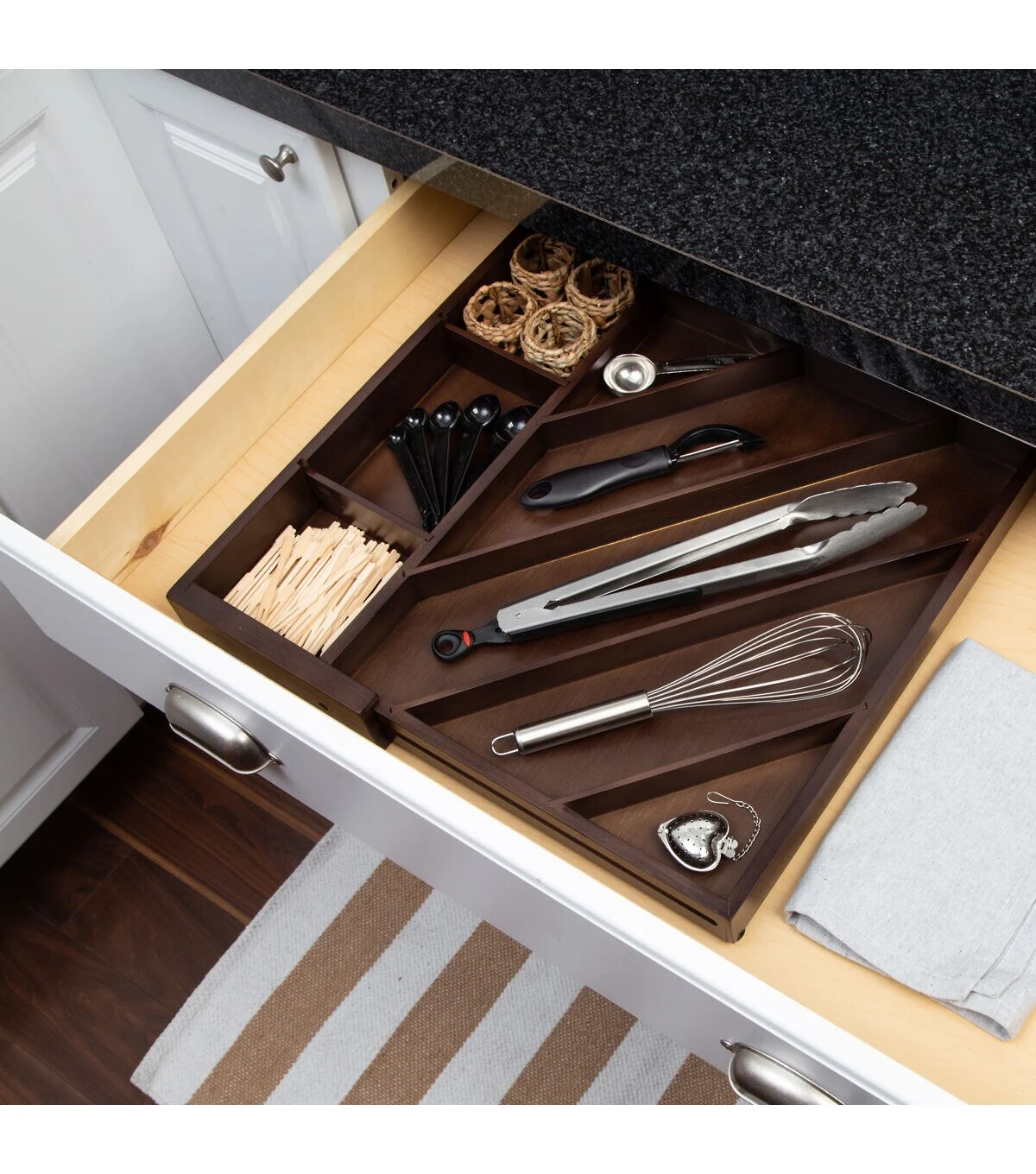 With this expandable bamboo drawer organizer, it only takes a few minutes to take your kitchen drawers from disastrous to disciplined—and keep them that way! Simply empty a drawer, expand your divider to the right size, and pop it in! Instead of one open and unorganized space, you now have anywhere from 5 to 8 compartments to organize everything from utensils to kitchen gadgets. The diagonal design of this adjustable drawer tray makes the most out of every inch of drawer space. At the same time, the two removable dividers on the side compartment allow you to tailor the organizer to your own needs. The strong bamboo build holds up to metal clambering, making it a particularly great knife drawer organizer or silverware tray. Outside the kitchen this bamboo beauty is fantastic for organizing office drawers, bathroom vanity drawers, or any other slide-outs that can use a quick—and long-lasting—clean up.