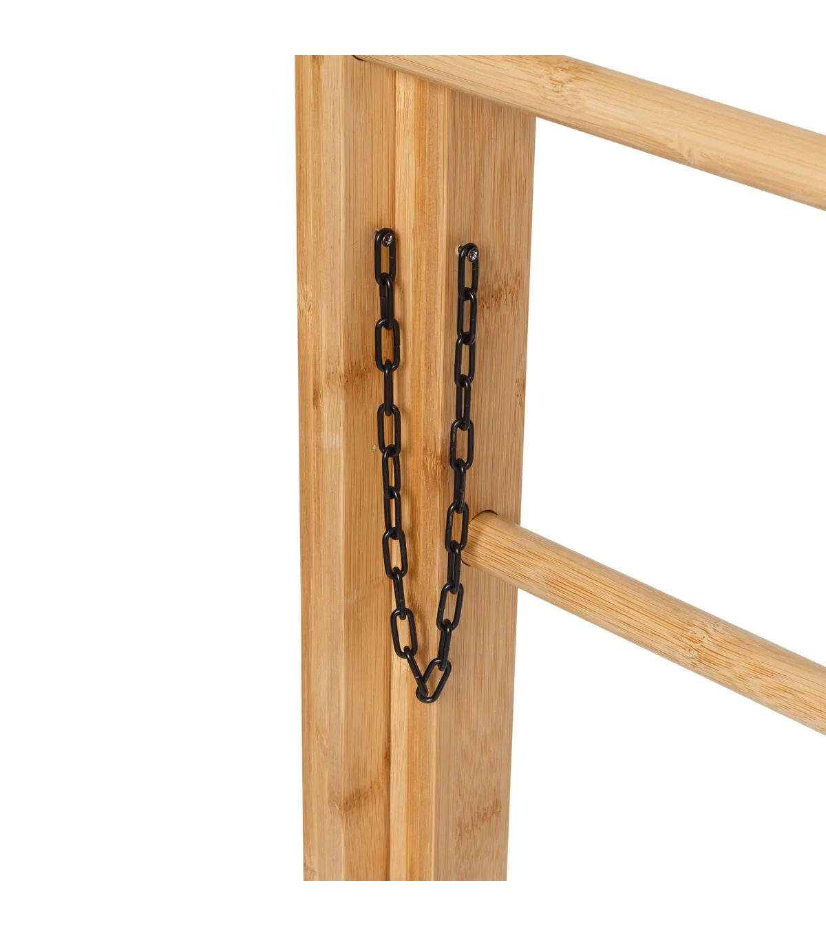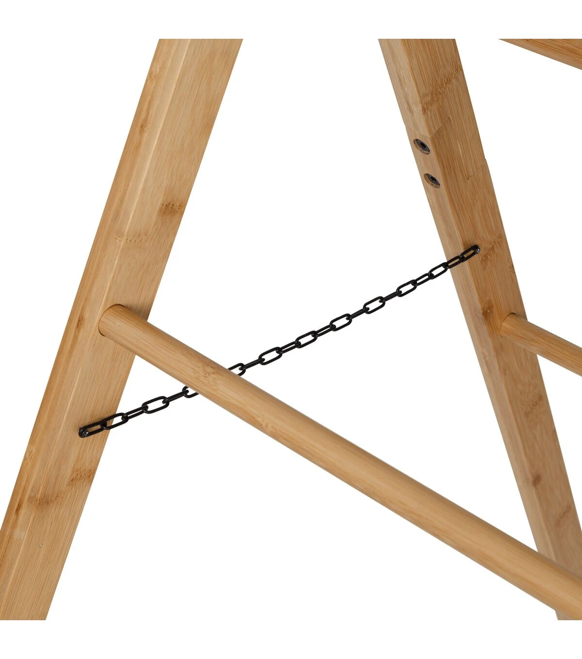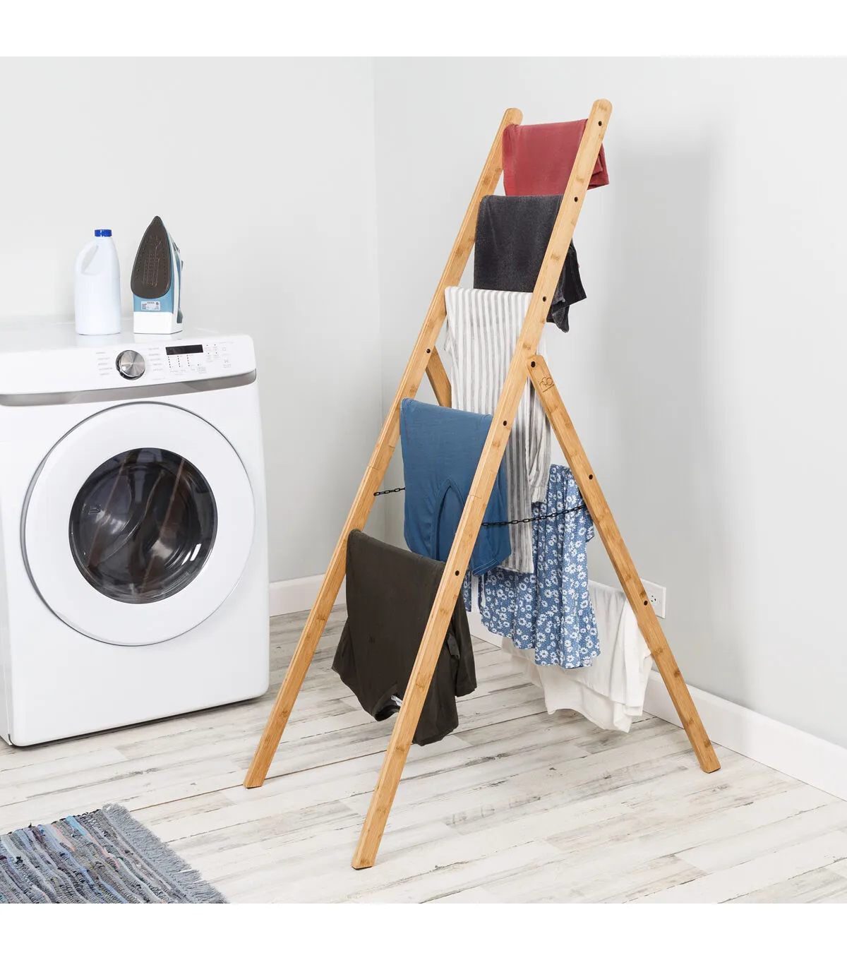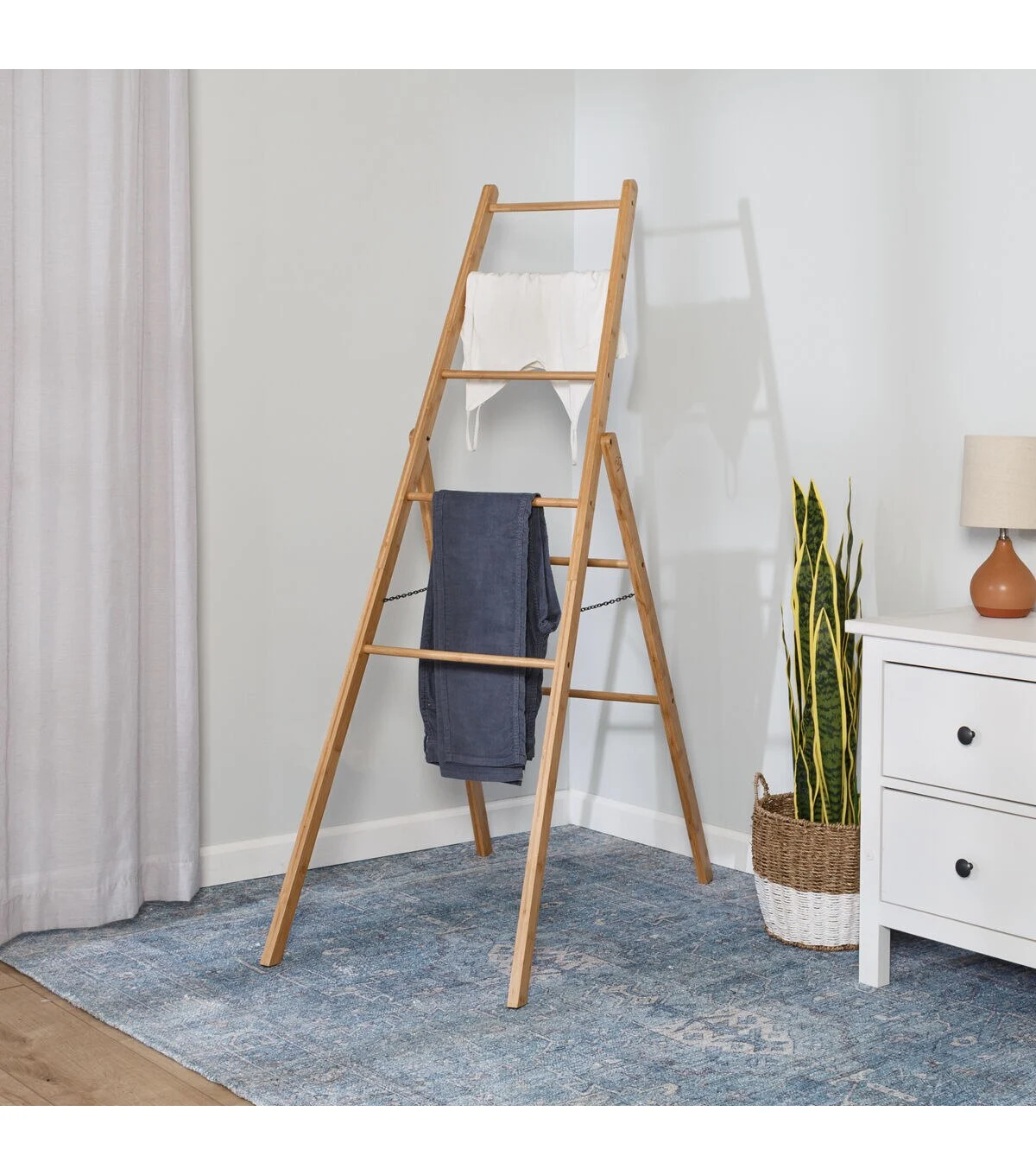 This ladder rack leans cleanly and is a welcome design and storage addition to any room. Air dry your clothes or simply keep throw blankets, towels or clothing accessories close while giving your space a fashionable decor accessory of its own. Versatility is paramount when it comes to clothes storage, and the bar spacing allows for easily storing varying garment sizes or a combination of clothes and accessories. An added bonus, the ladder rack's sustainable bamboo make-up and energy savings from not using your dryer give you double the points on your earth friendlness, and the safety chain allows for added functionality and angle adjustability, making this the perfect addition for your room.