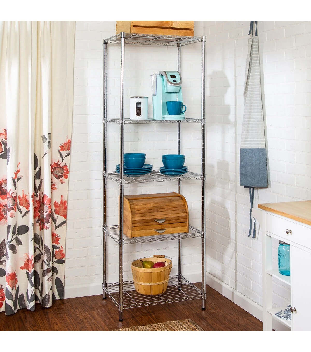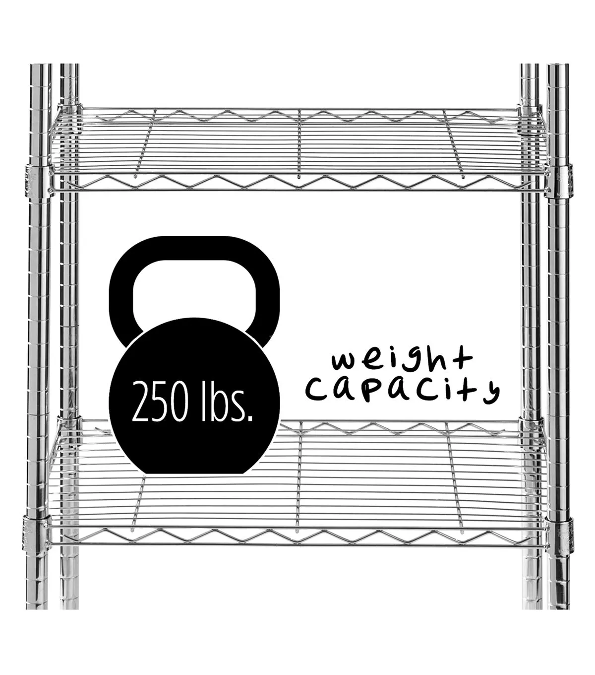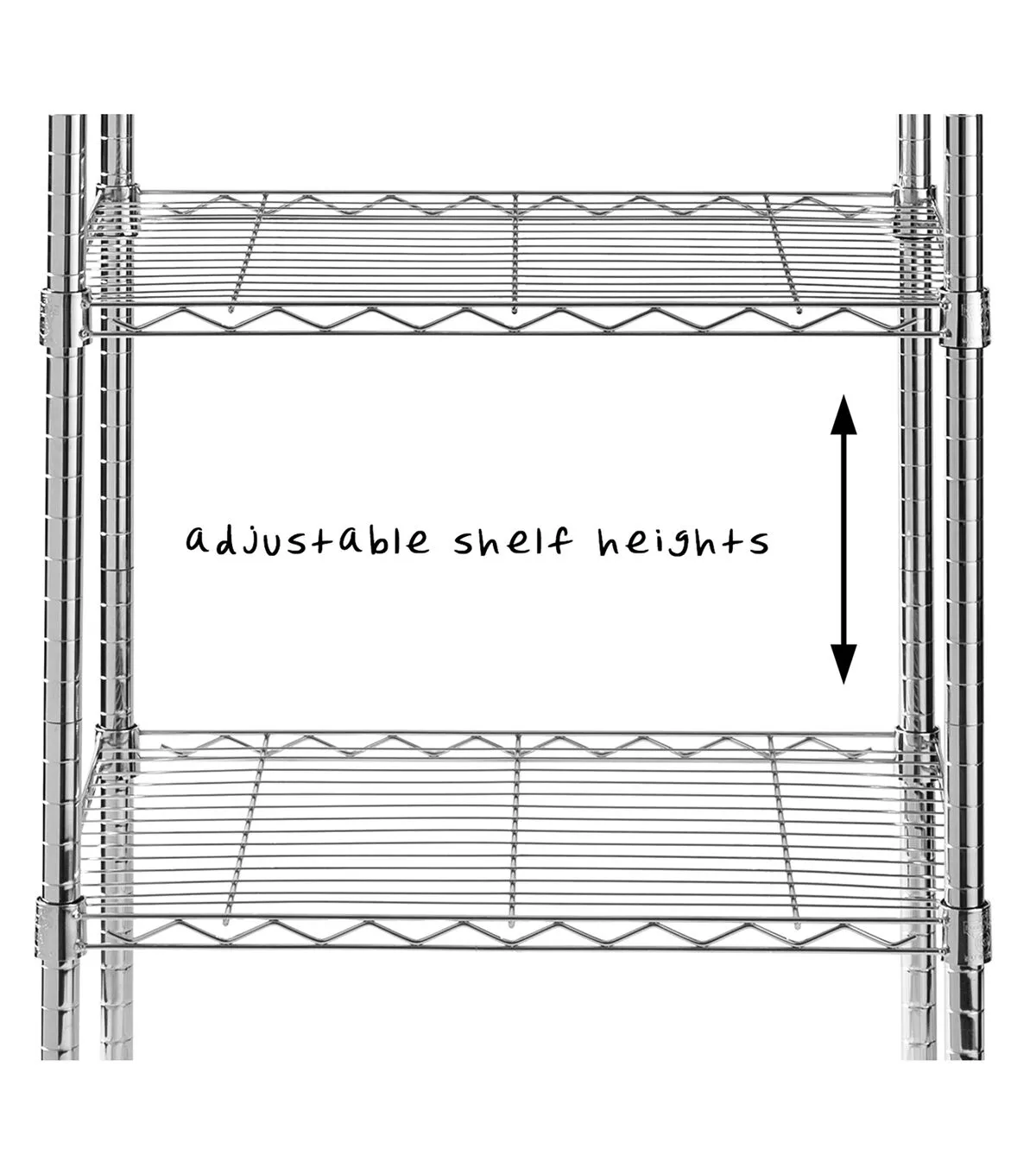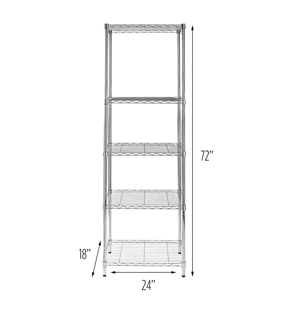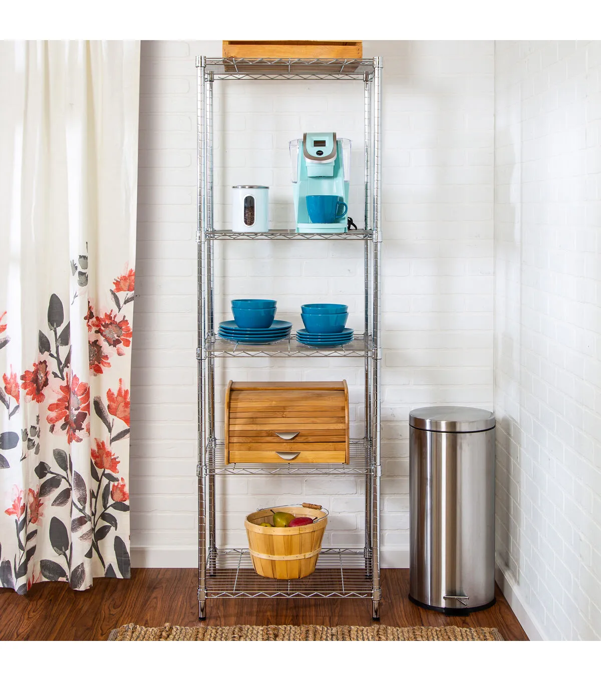 You are looking for a shelving unit that is versatile – that could serve as garage shelving or kitchen shelves. You need adjustable shelves for when your storage needs change or that oh-so-random item comes home and doesn’t fit on the shelves as-is. Well, your shelving ideas are just a click away. This 5-Tier Adjustable Chrome Storage Shelf is all that and more, with the ability to hold up to 250 pounds on each shelf and a steel frame construction that gives it industrial quality, making it the perfect kitchen, garage or closet shelving unit. And if you want to move it around, you can purchase wheels that will give you the portability you need, with the functionality and style you desire.