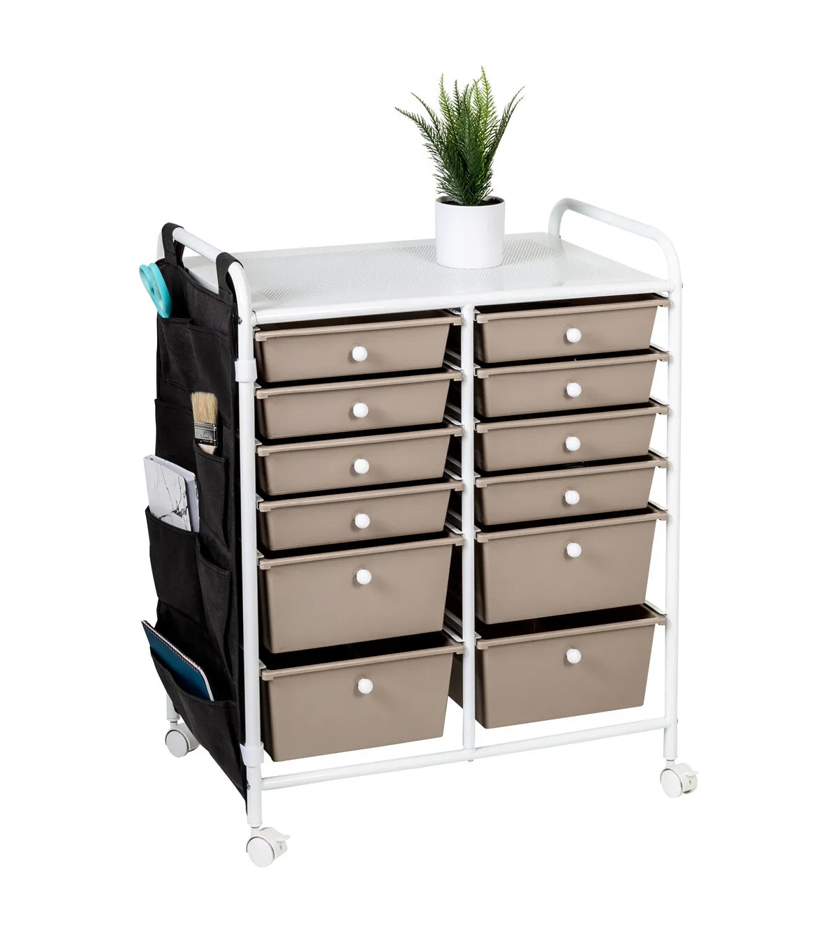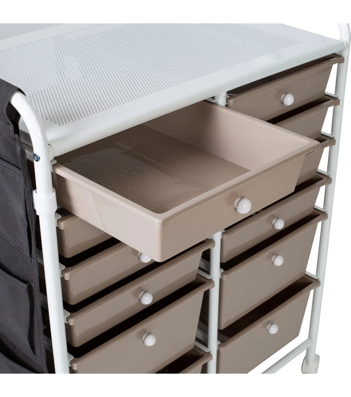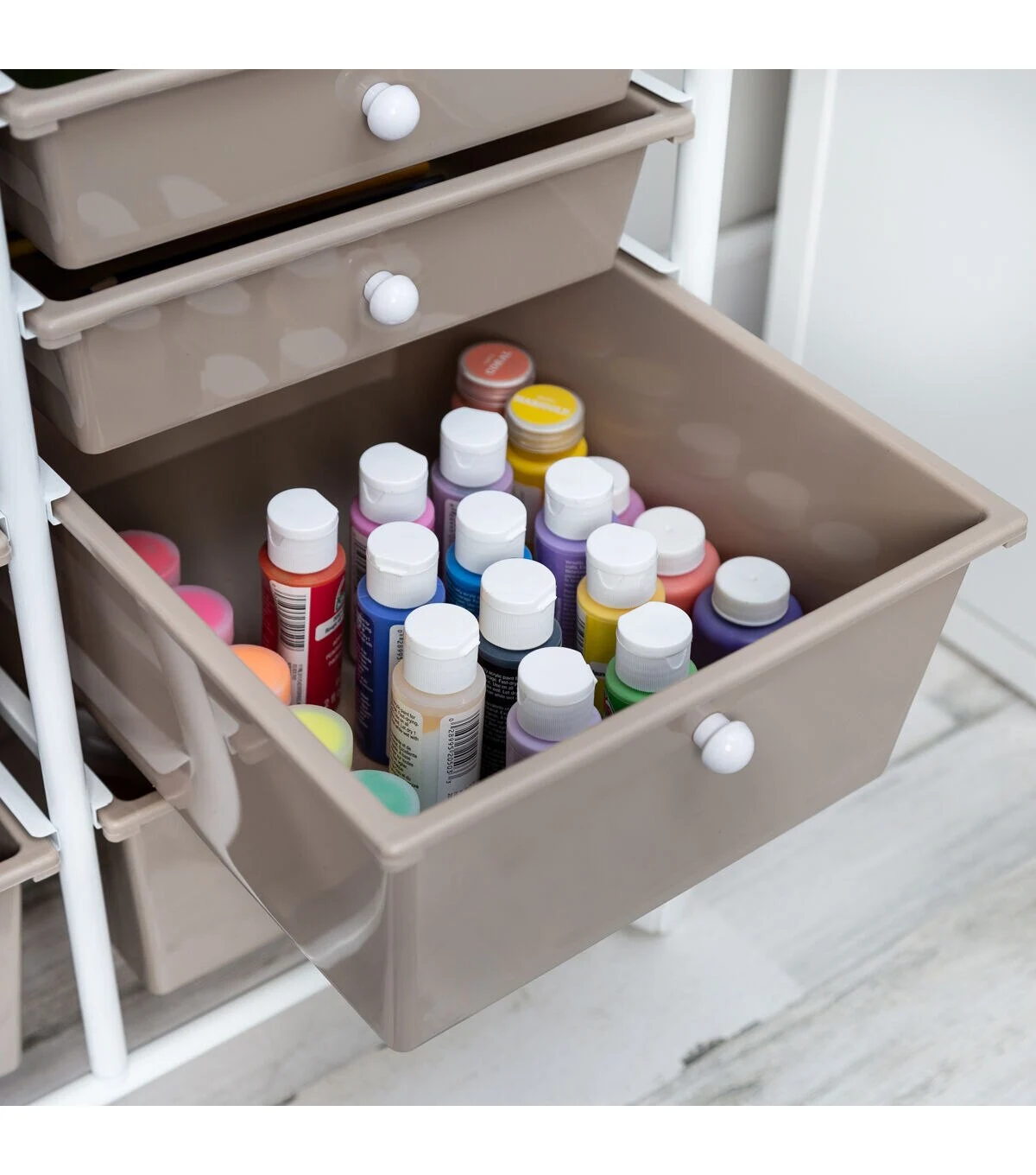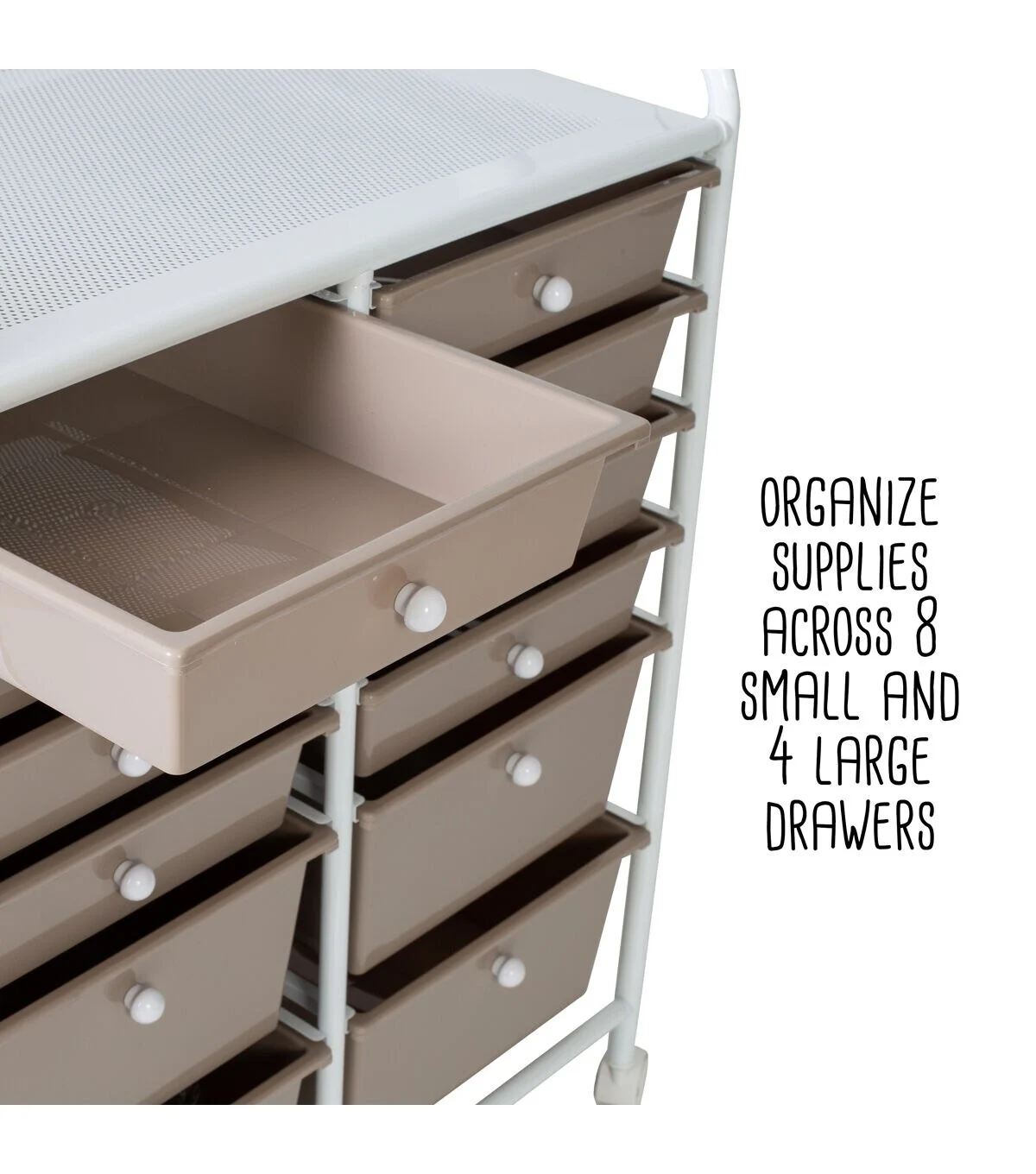 - Organize supplies across 8 small and 4 large beige drawers with white knobs