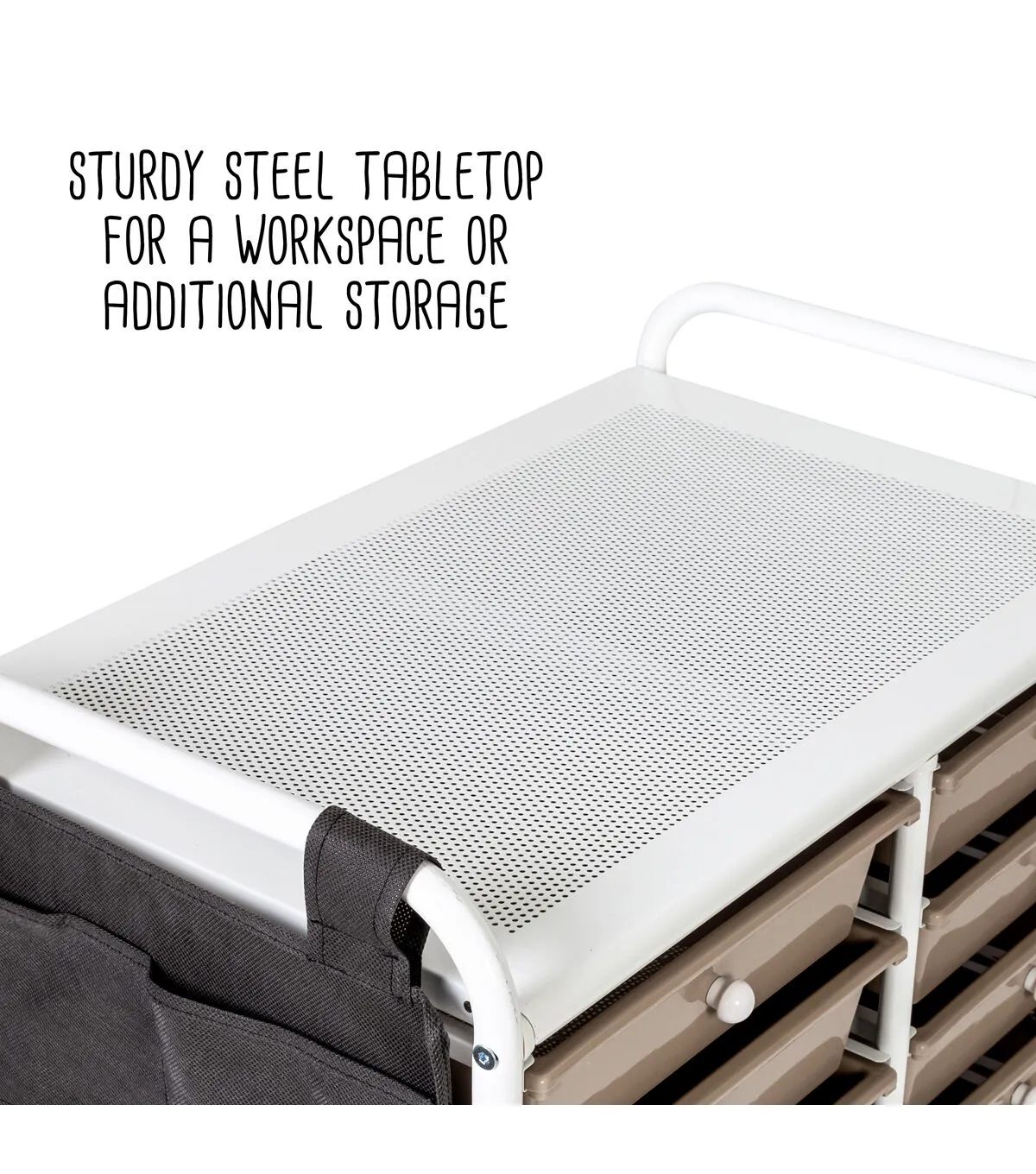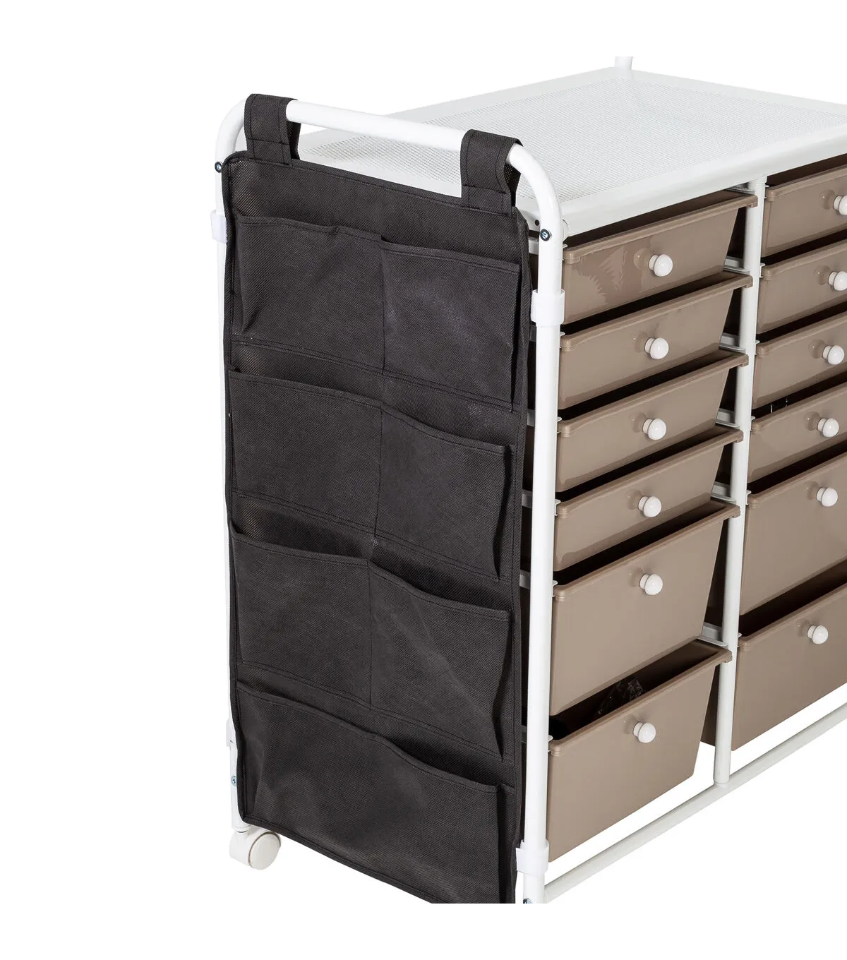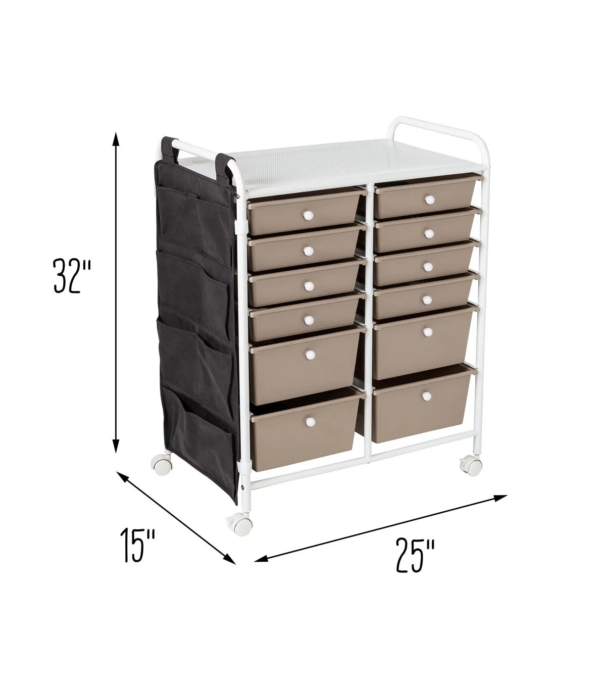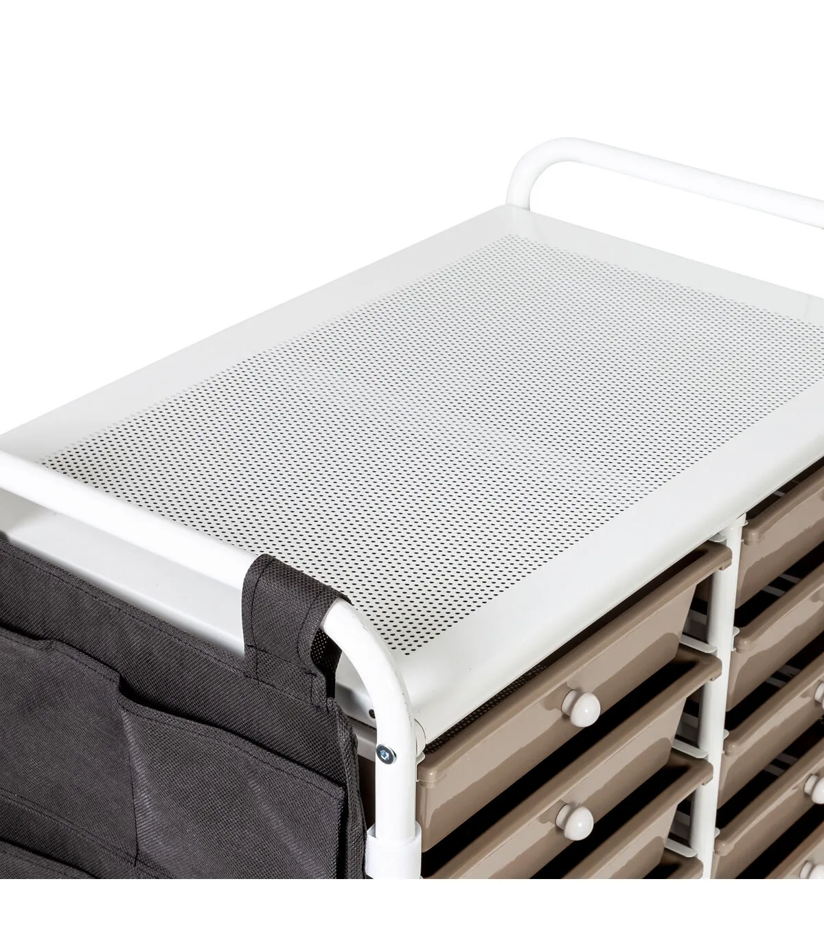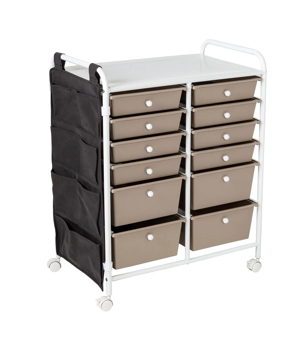 - Organize supplies across 8 small and 4 large beige drawers with white knobs