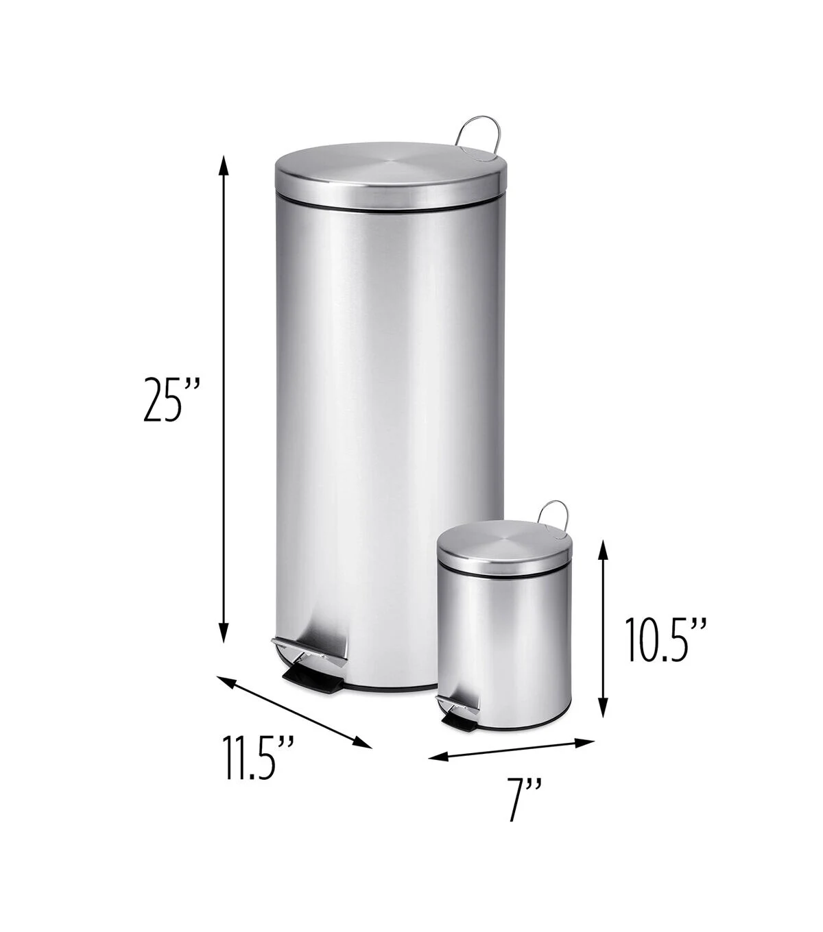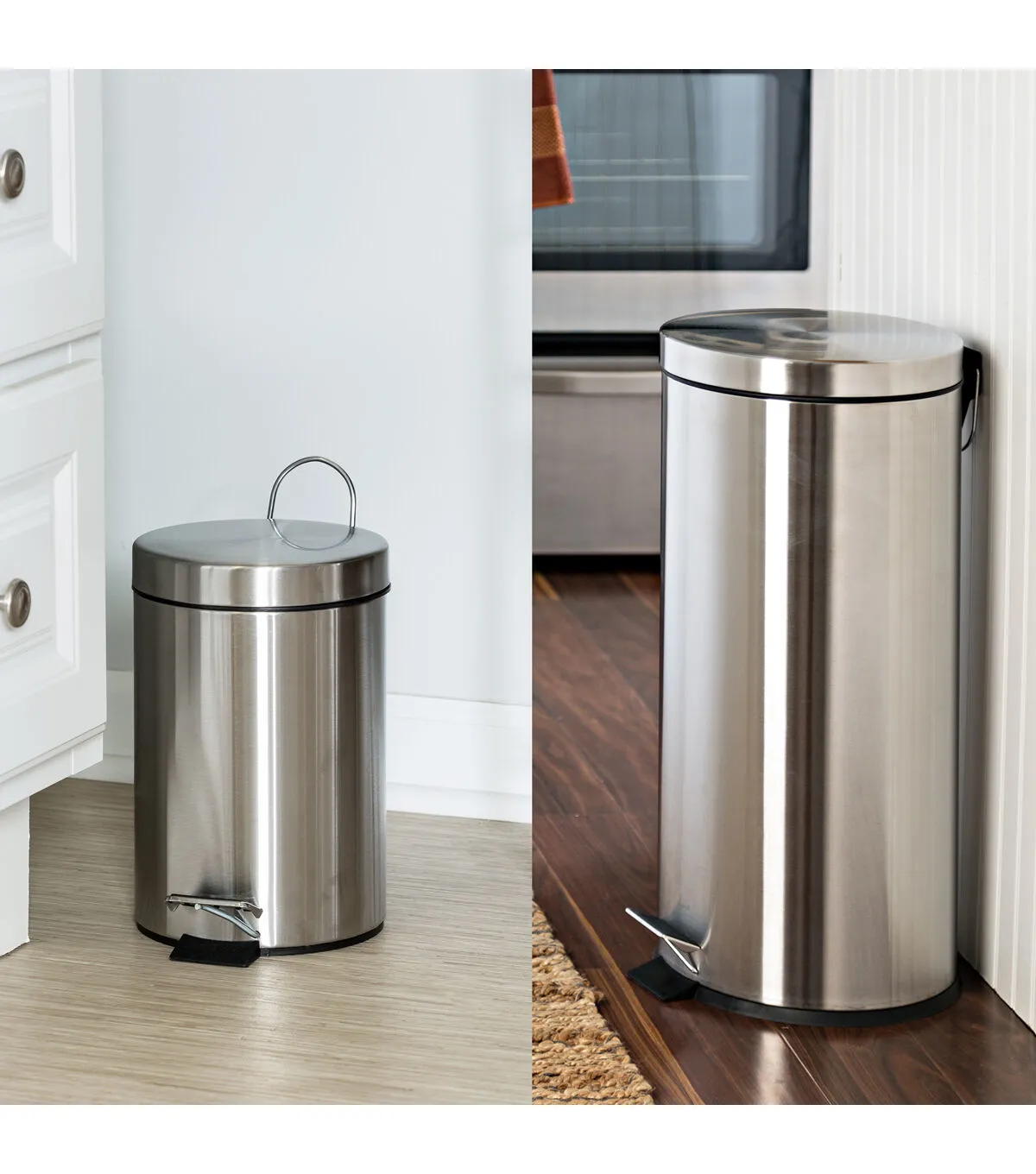 With this trash can set, the contemporary stainless steel brings a pop of style to any room. Let the large can set up shop in the kitchen, laundry room or basement while the 3L mans the garbage in the bathroom or office. Both cans feature a plastic inner trash bucket which is fully removable and allows for easy emptying and cleaning. And simply step down on the foot pedals to open and close smoothly.