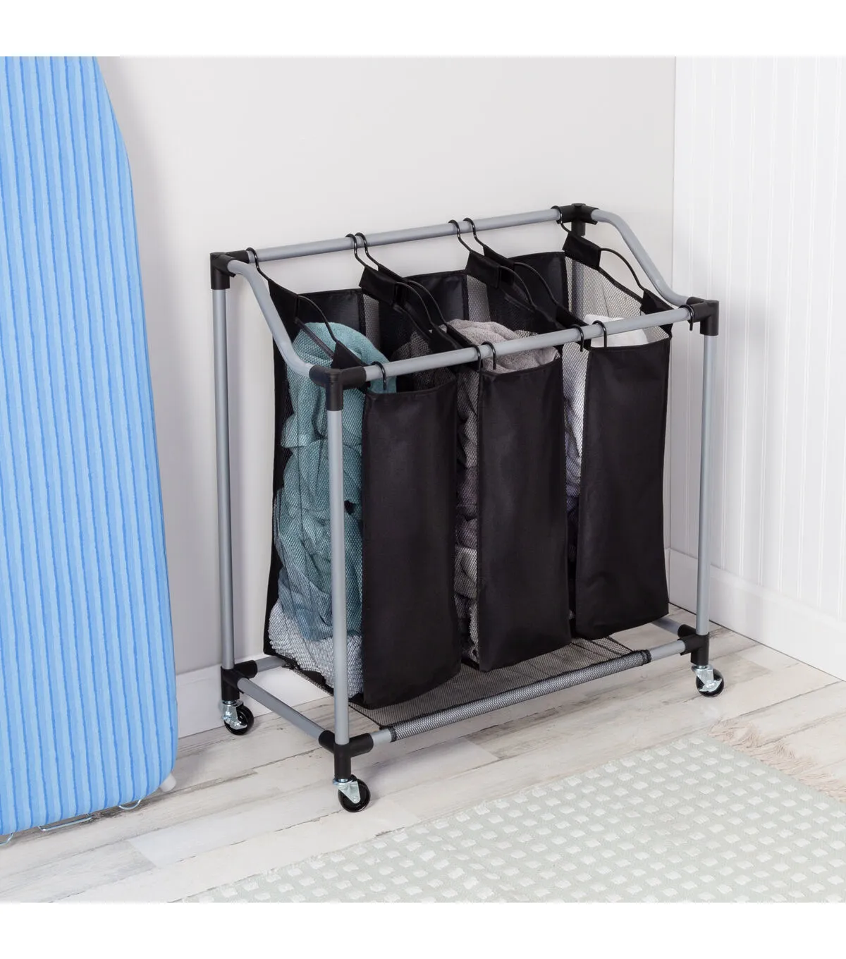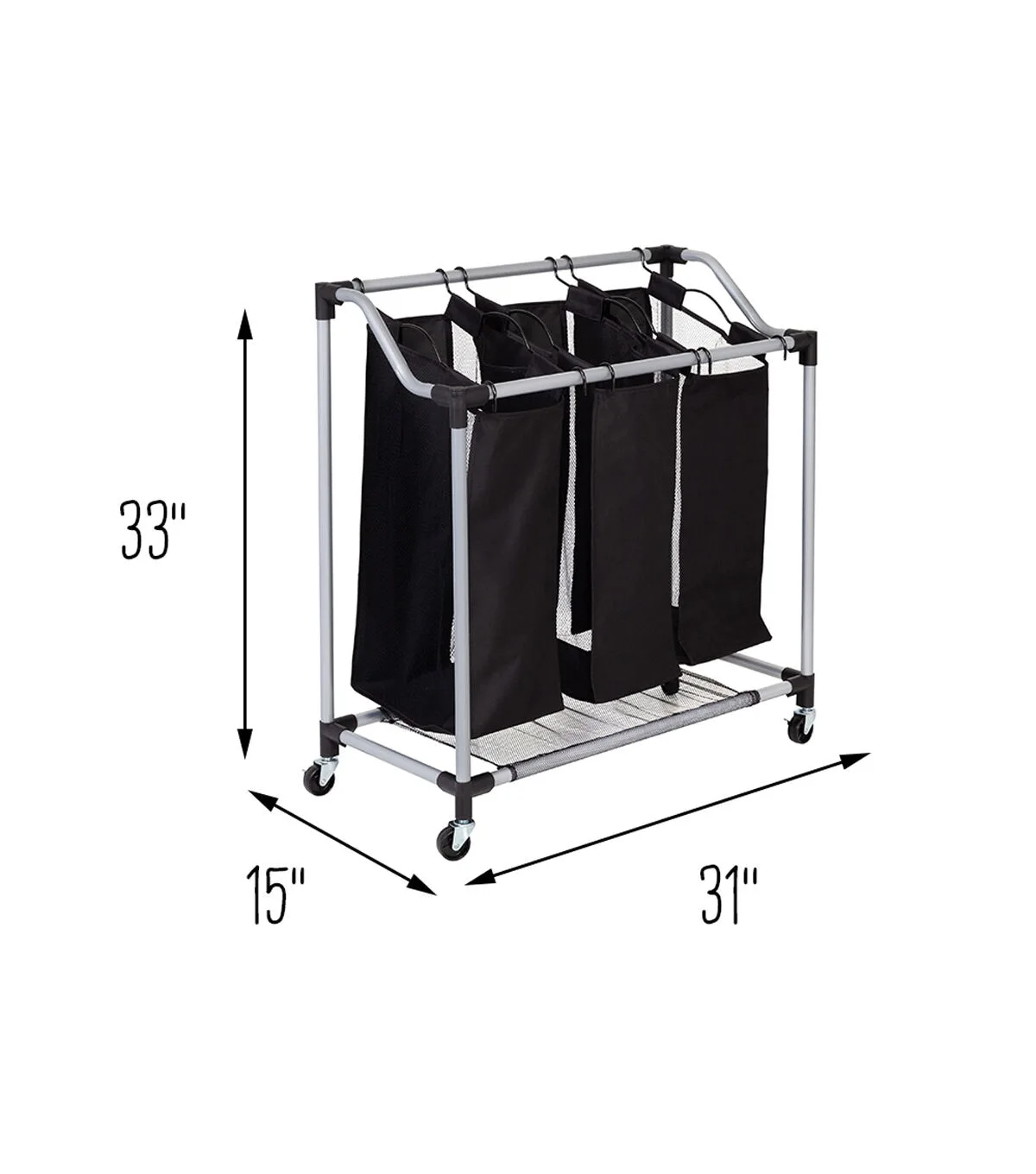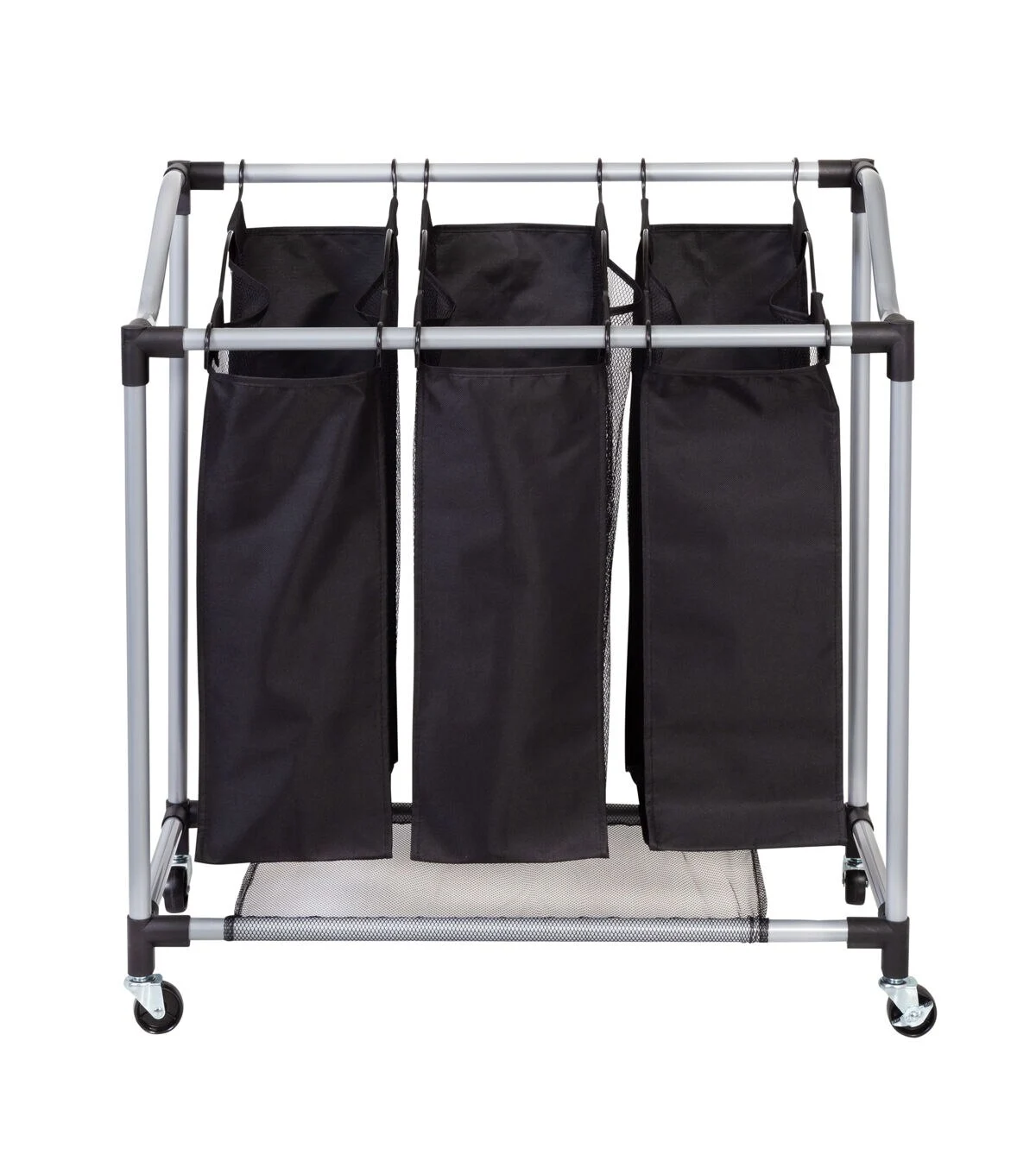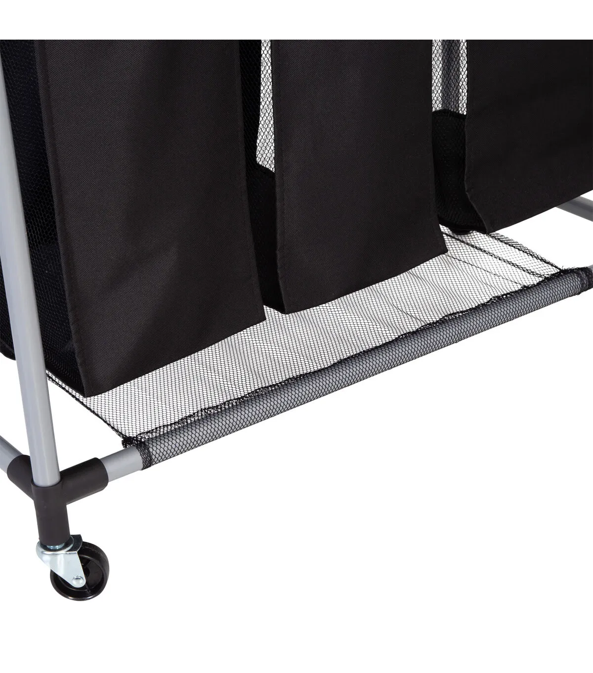You’ve got the fancy bar cart, the mid-century modern credenza—now you can shine up your laundry game too with this sleek Triple Laundry Sorter with black mesh bags. Glowing amid your dirty clothes like a beacon of style, this modern laundry hamper effortlessly glides from room to room while helping you separate your whites, darks and gold lamé loungewear. The breathable black mesh bags keep you breathing a little more fabulously on chore day. Both functional and fancy, this 3 bag laundry sorter has enough moxie to wear designer clothes and separate all the ones that need washing