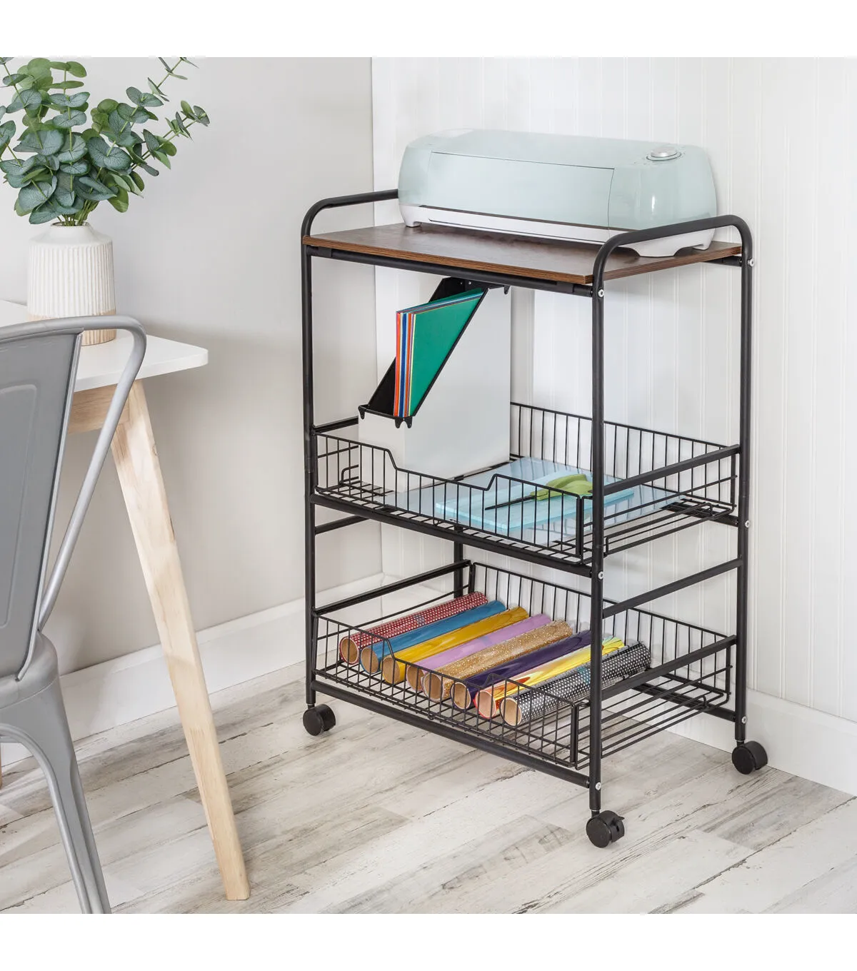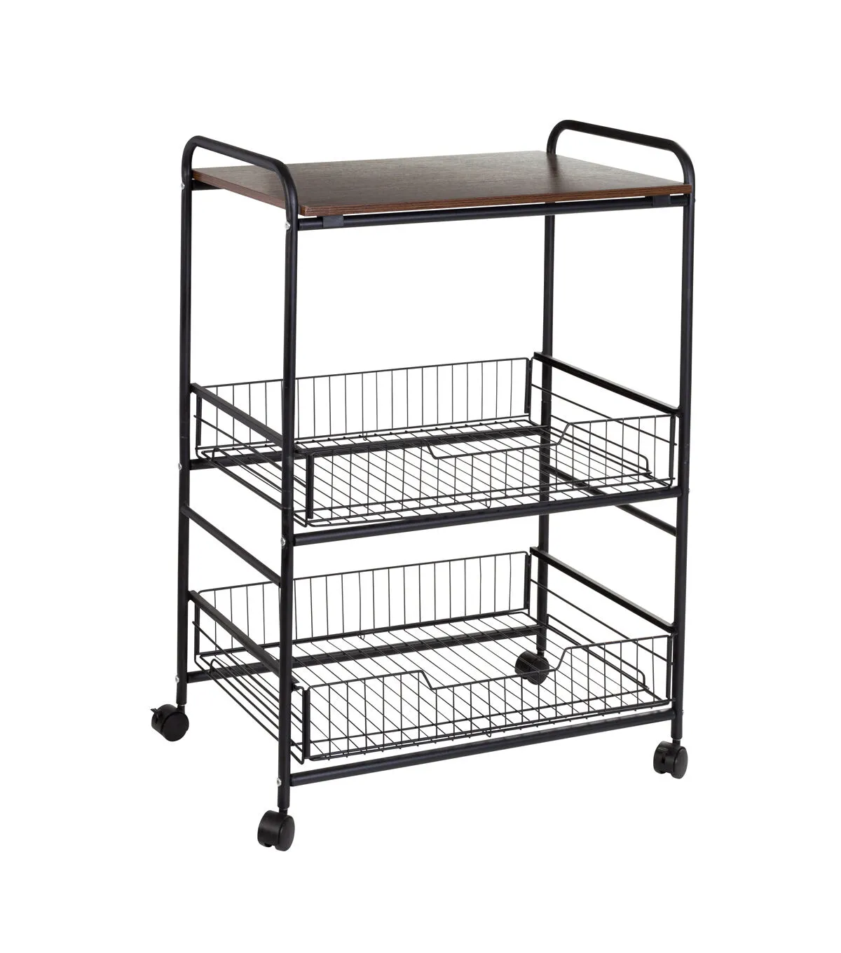 Whether used as a microwave stand or a farmhouse rolling cart, this 3-tier cart is crafted to organize your home in style! The top shelf finished in a warm natural tone can hold everything from plants to art supplies, while the pull-out baskets are ready to organize your clutter. The wire baskets will keep everything corralled while this cart is on the go. Once stationary, the open design and slide-out function allow you to see exactly what you have on hand and easily access it. Its simple wood and metal build offer a timeless feel that transcends trends, while its durability offers endless years of organization.