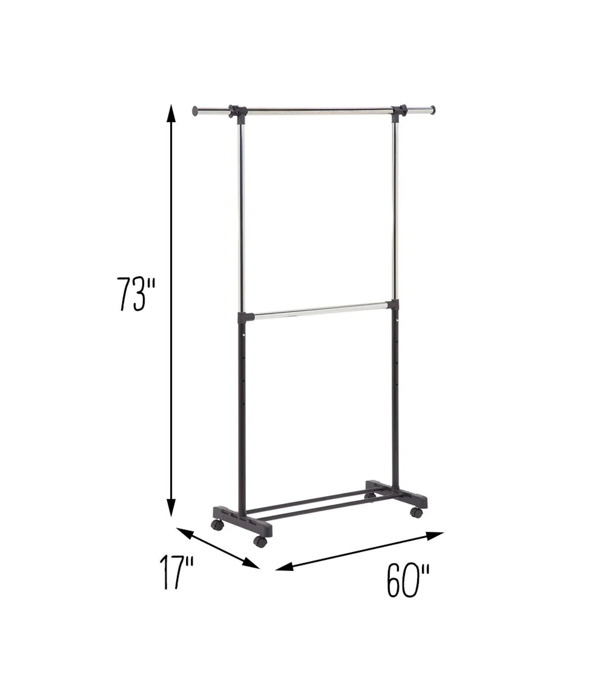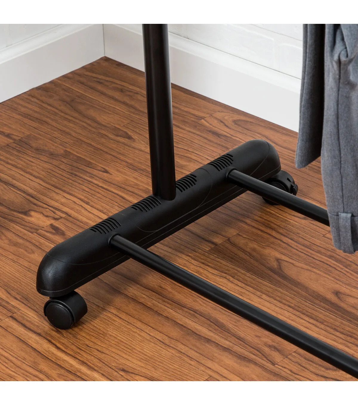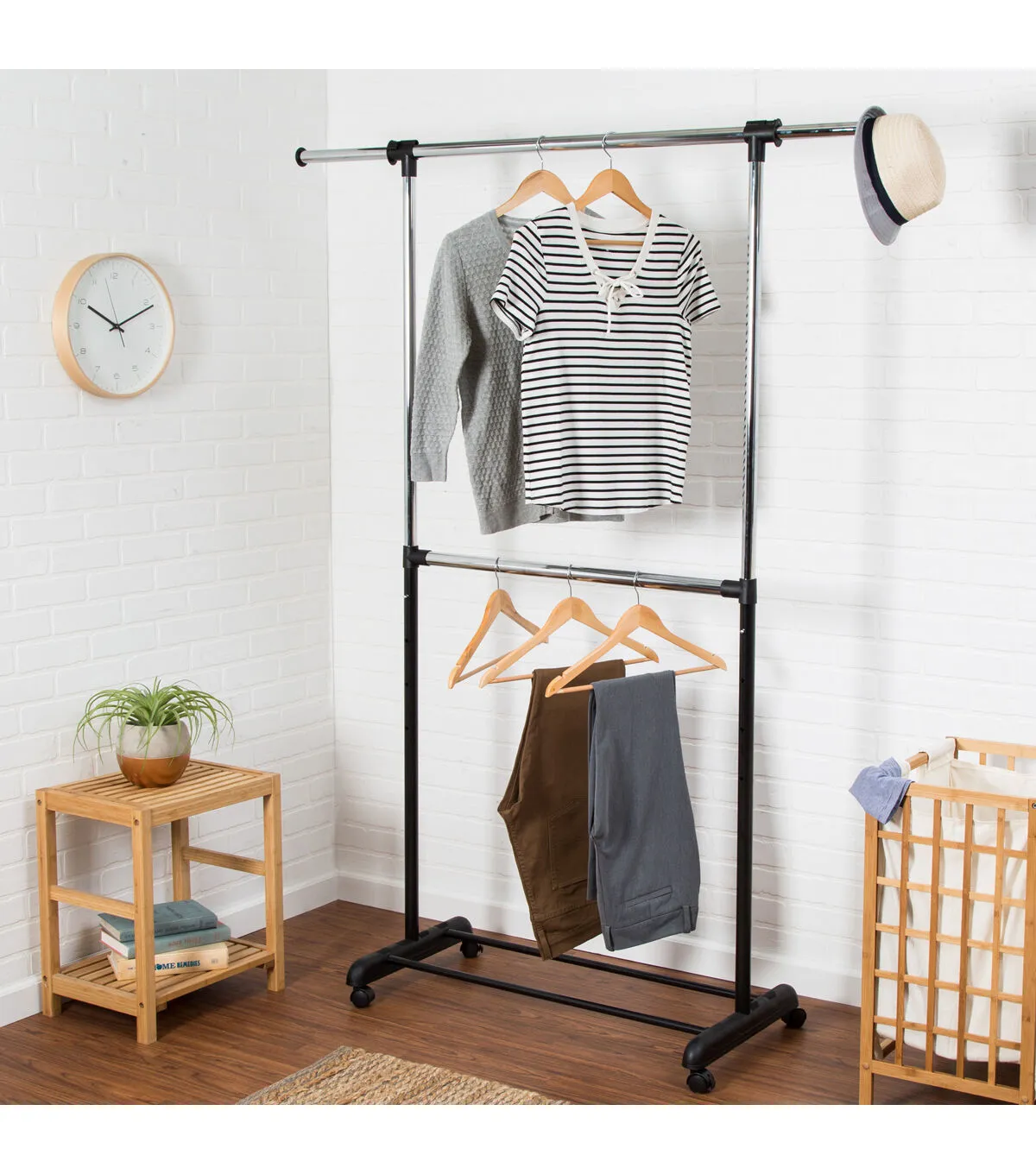 This clothes rack is adjustable in more ways than just sizing its rods up and down. Granted, that’s a handy feature. But we mostly appreciate how this portable clothes rack can adjust to many circumstances. With its locking caster wheels, we move this into the bedroom the night before a presentation to try out outfits. On laundry day, it’s rolled onto the patio for delicates to air-dry. When we’re entertaining, this double clothes rack is at the entryway for guests to hang their coats. And those are just a few of our faves. How will this garment rack adjust for you?