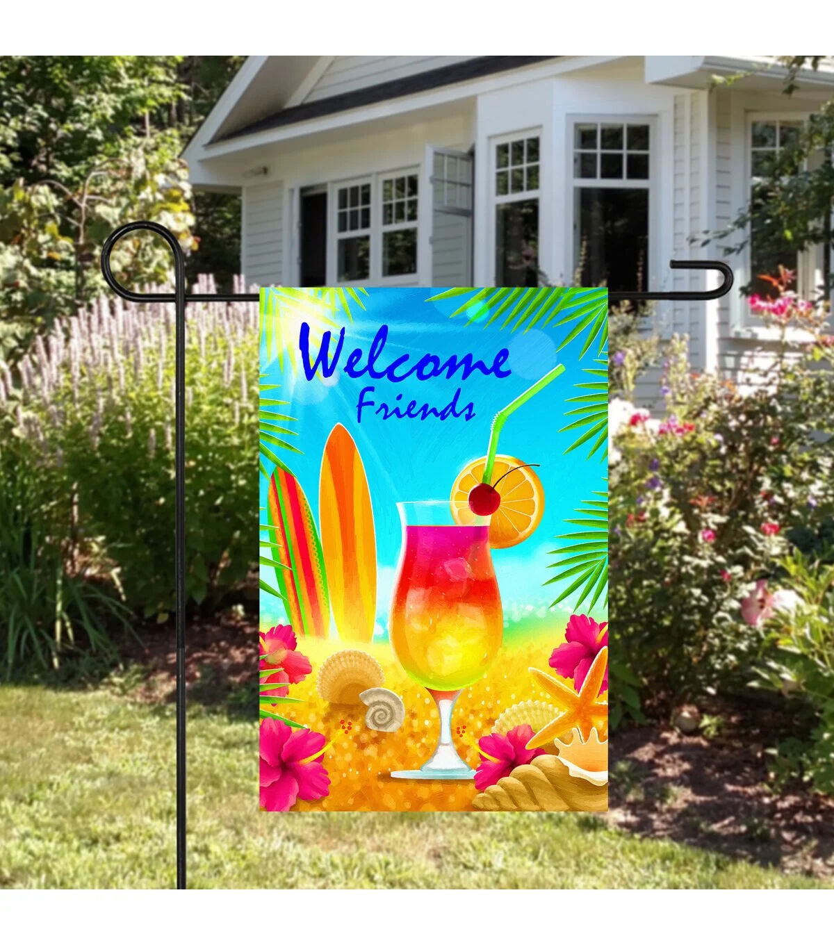 This fun flag will give you hot summer vibes. Designed with tropical leaves flowers and fruit it will add pops of color to your decor. Welcome friends while saying hello to summer.