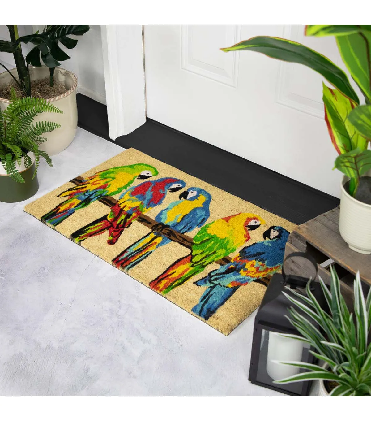 Toffee and Multicolor Parrots Coir Outdoor Doormat 18" x 30"