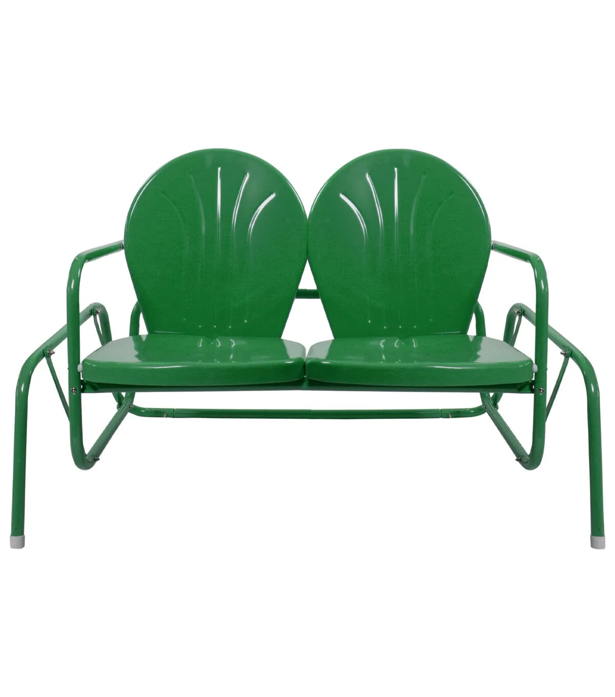 Bring a touch of the '50s to your yard or porch with our vintage-style metal lawn chair. With its weather-resistant powder-coated finish you will have years to enjoy this classic piece. Perfect for enjoying a glass of wine on the patio with family and friends or a good book by yourself. Pairs beautifully with our matching vintage style metal tulip tables. Features: Outdoor retro metal tulip double glider Color: green Long-lasting enamel paint Powder coated finish Plastic caps on legs to protect your surfaces 9-piece easy assembly For indoor or outdoor use Weight capacity: 450lbs Dimensions: Overall: 32"H x 48.25"W x 34"D Seat: 16"H x 39.75"W x 19"D Back: 20"H x 39"W Arm rest: 23.75"H Material(s): steel