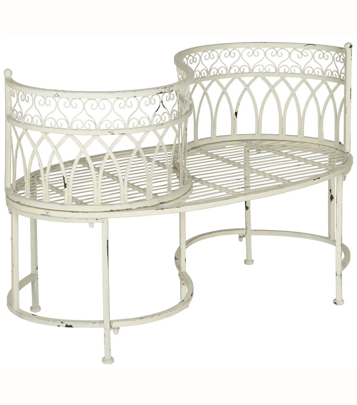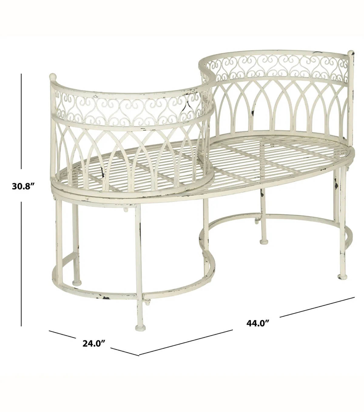 Designed after a Victorian garden staple, this Lara Kissing Bench overflows with vintage charm. Lara's romantic heart shaped details and flourishing scrolls in antique white iron lend any outdoor space an enchanting ambiance.