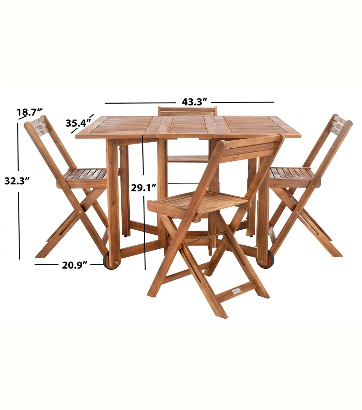 An ingenious space saver, Arvin outdoor dining table and chair set is designed for gracious outdoor living. Crafted of eco friendly acacia wood in natural, its 4 director style chairs fold and tuck under a foldable rectangular table for easy storage.