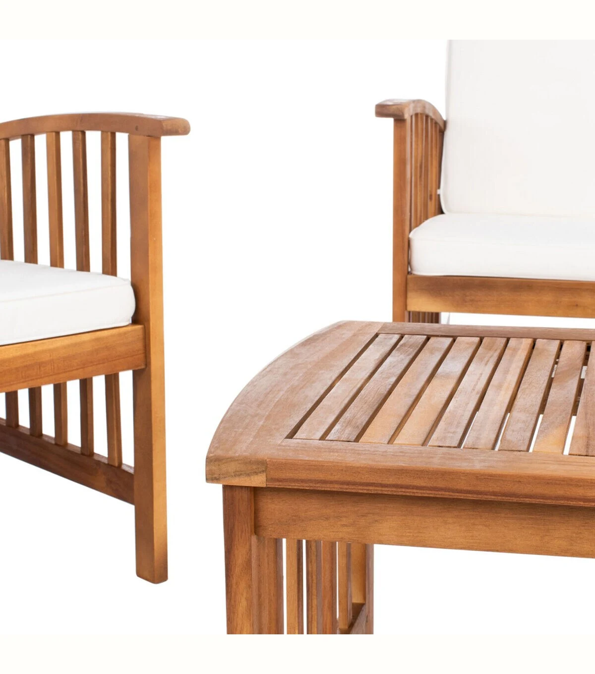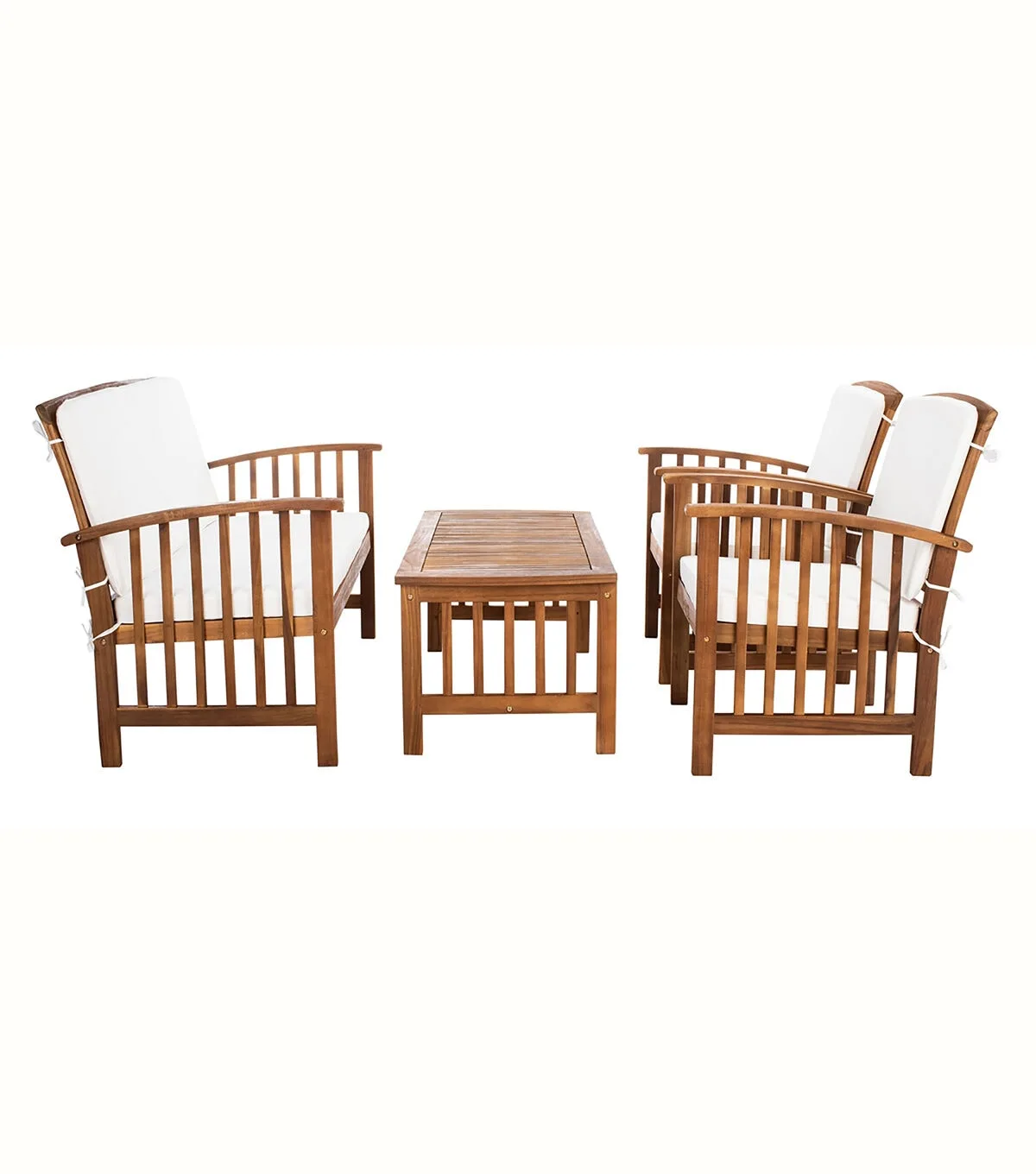 The open and airy design of the Rocklin 4 piece outdoor set combines form and function. The slatted silhouette aids rain drainage while creating chic contemporary forms. The set is crafted of acacia in a brown finish with beige all weather cushions.