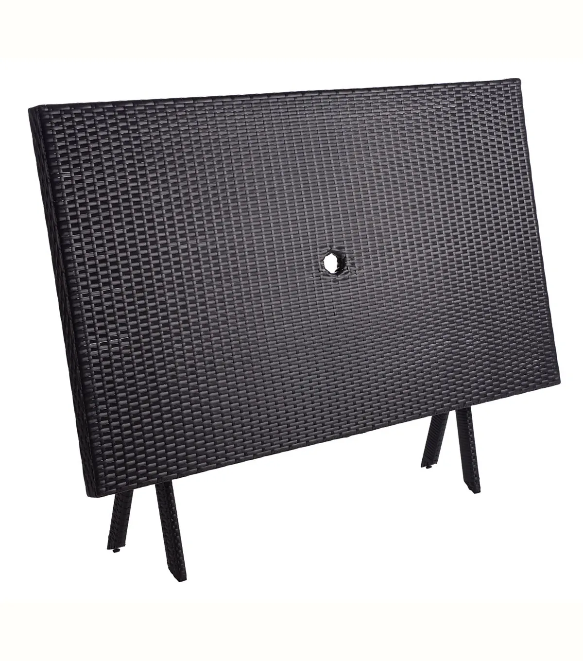 The Akita Table perfectly blends the functionality of a folding table with the high style needed for chic outdoor dining. Styled in forever fashionable black, Akita��s texture rich surface features a cut out in the center for umbrellas, allowing you stay protected from the sun��s harsh rays.
