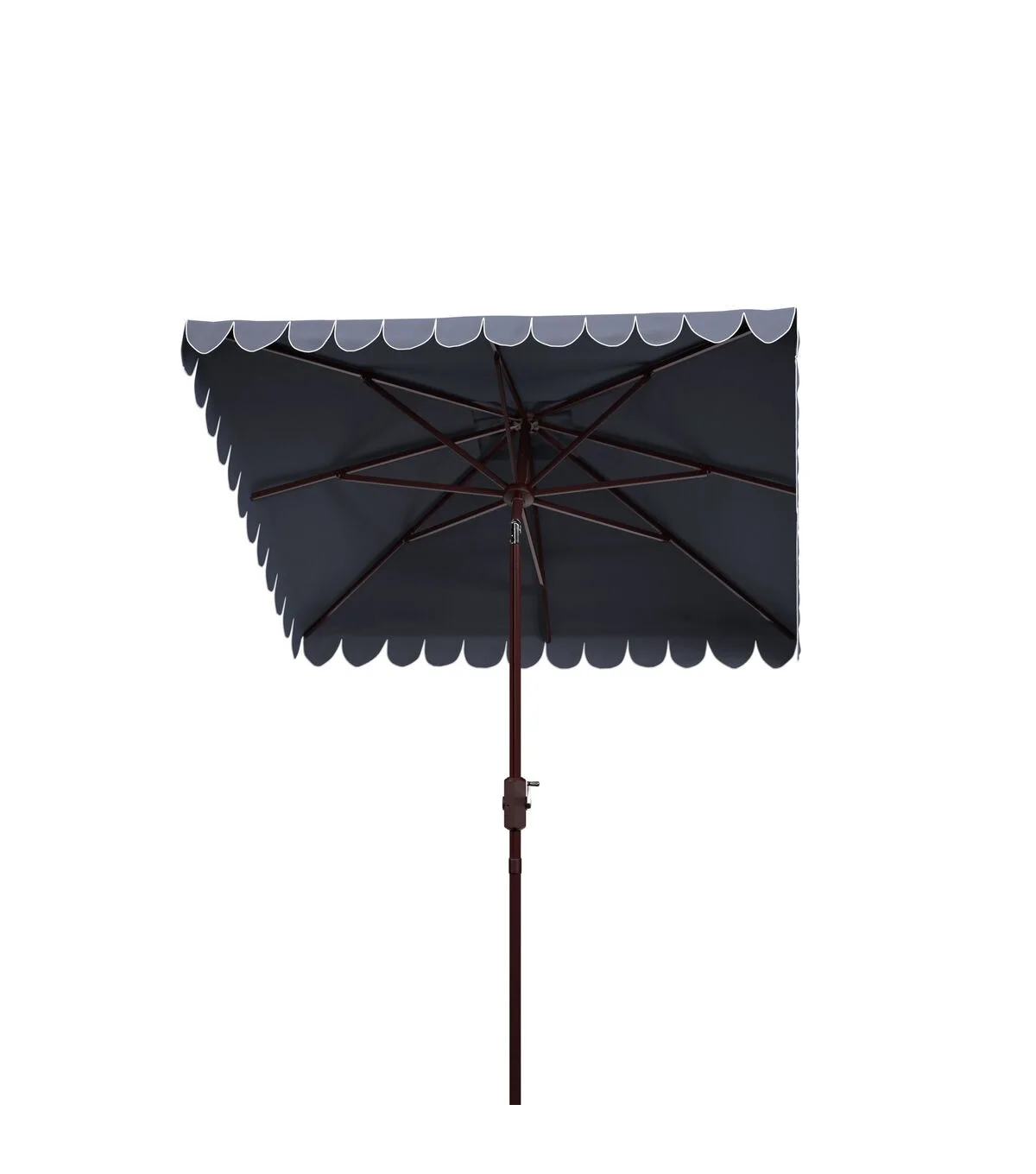 The signature white and blue coloration of Santorini��s lush legendary resort inspired this sensational square crank umbrella. Its sophisticated navy hue features a scalloped white trim to create an outdoor retreat for the modern tastemaker.