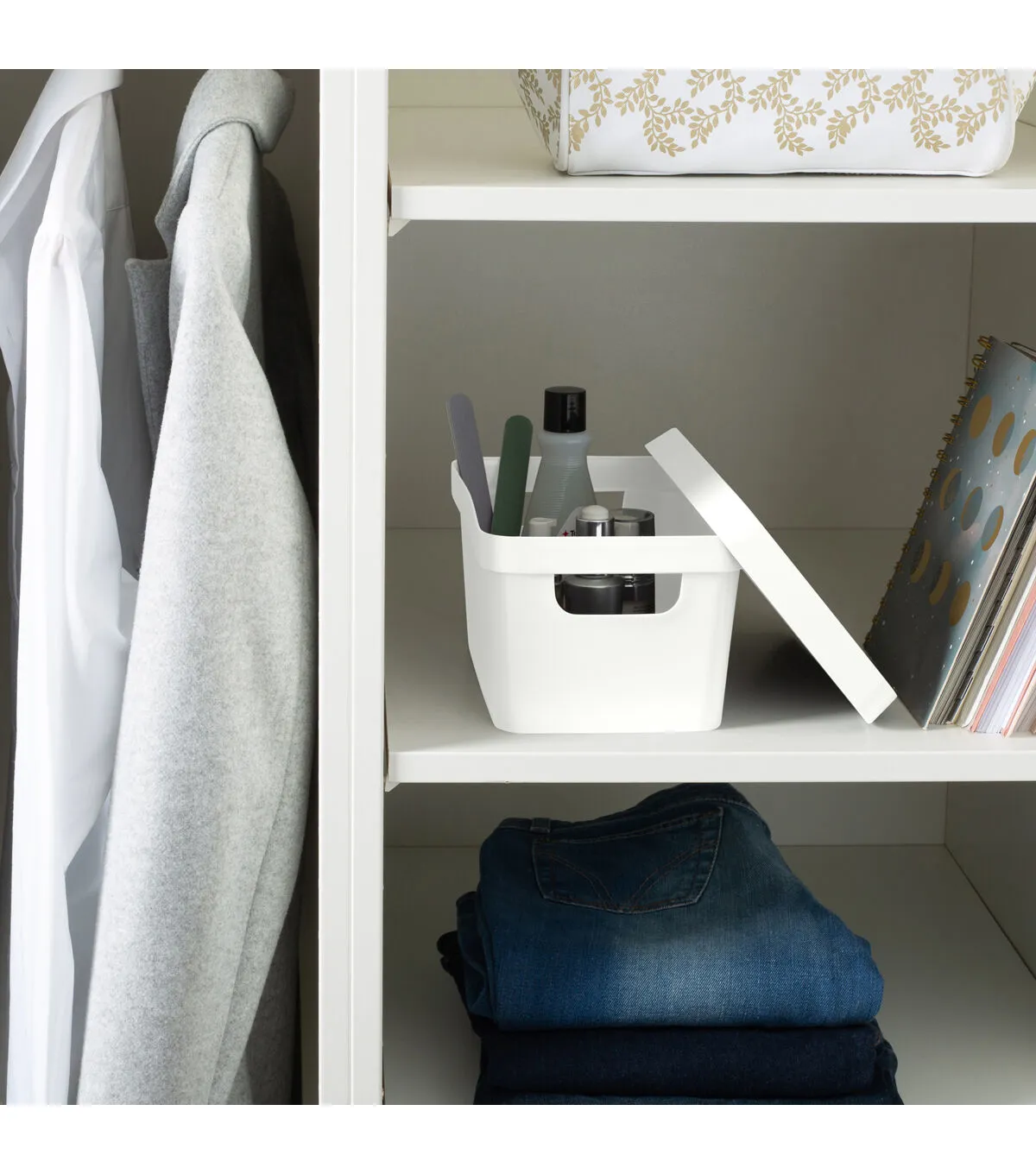 Keep any space organized with the Simplify Vinto storage boxes. The nest able and stackable design makes it convenient to store items in a sufficient space saving way. The click tight lid protects items from dust and odors and open handles makes the box easy to transport. The vinto storage boxes are perfect for toys, shoes, linens, seasonal, decor and more!