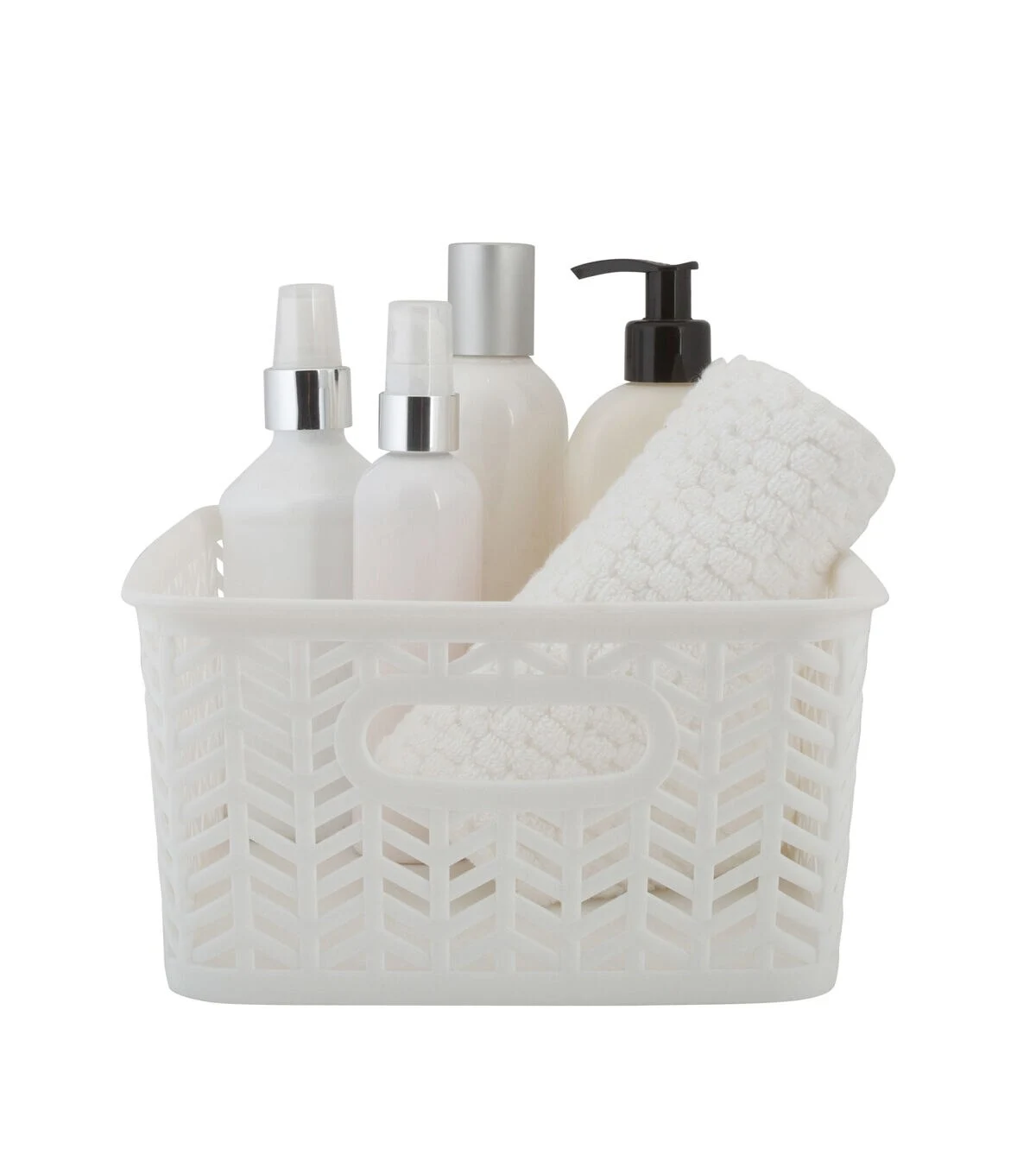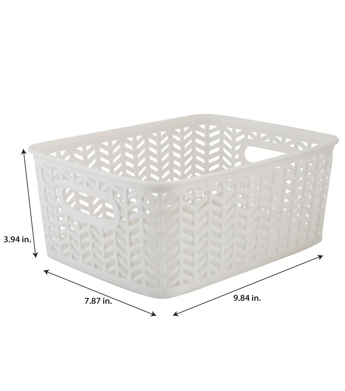Simplify's Herringbone Storage Bin has a unique wicker design and is made of sturdy polypropylene plastic. 2 sturdy open handles makes it easy to carry Bin around from one place to another. It has a lightweight design and holds a multitude of items, organizing and de-cluttering homes. Wide selection of colors to fit any setting.