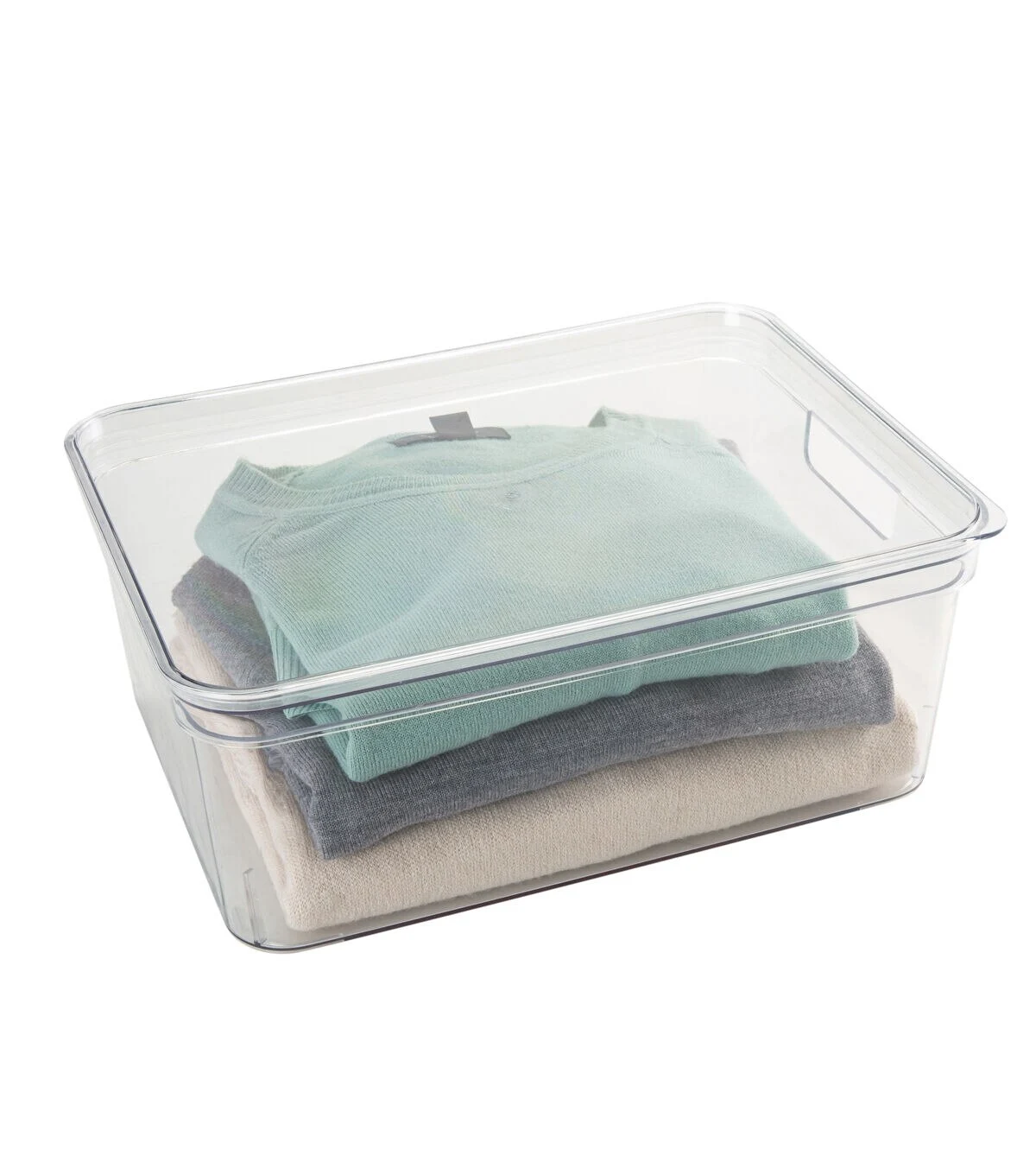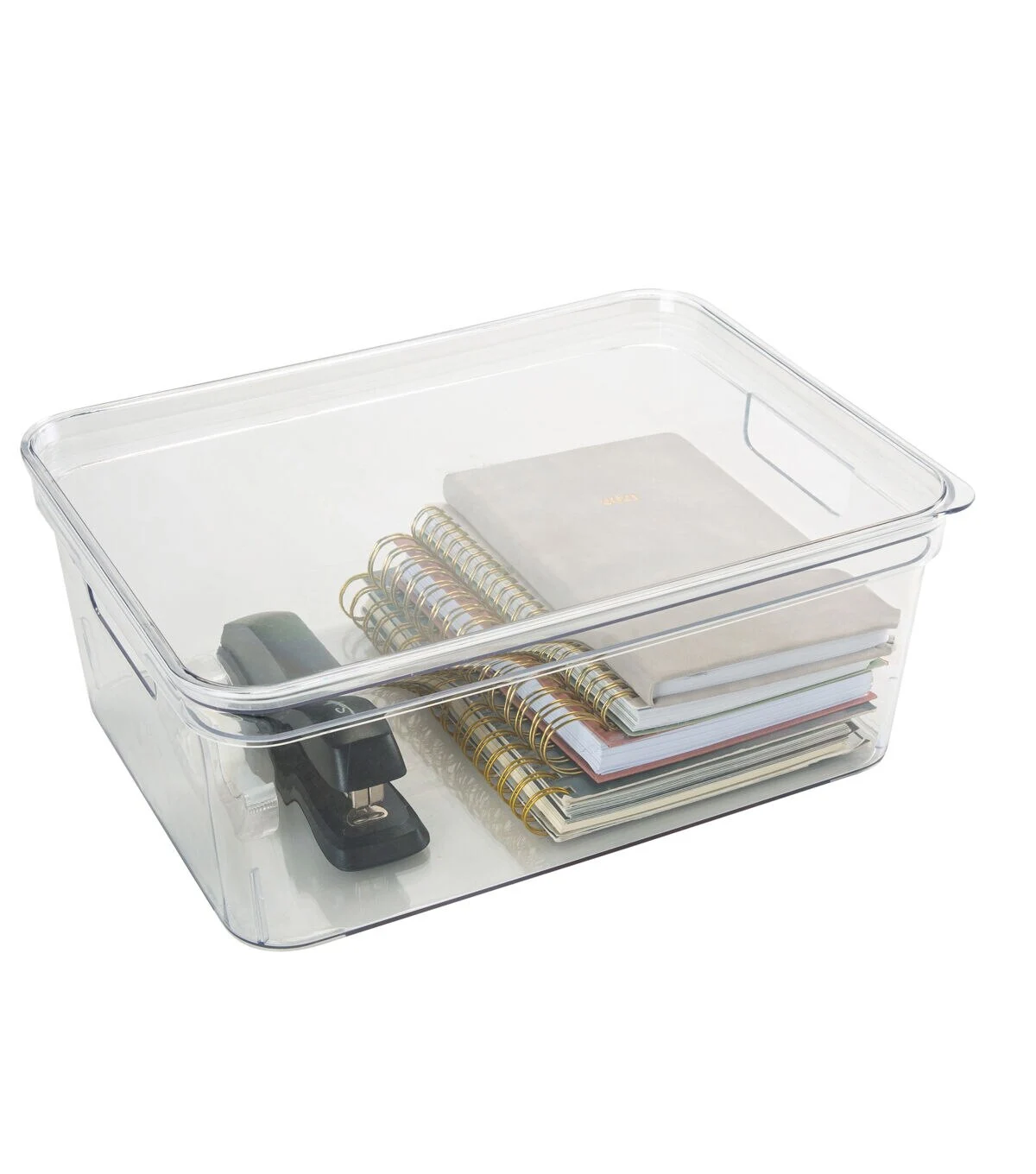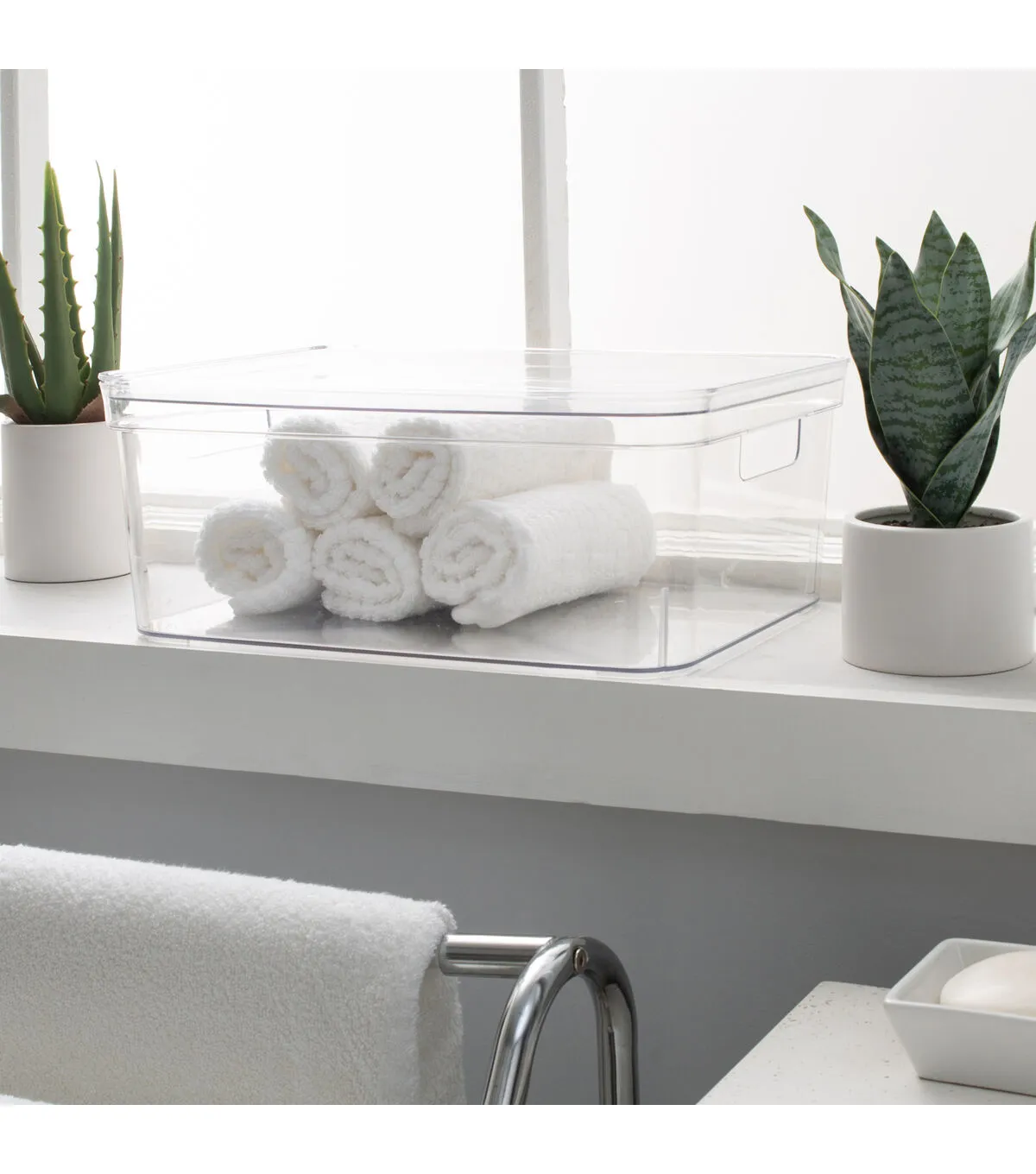 Keep your space organized with the Simplify Medium Lidded Storage Bin. It is the perfect size for desk accessories such as notebooks and staplers. It is also good for holding hand towels and washcloths, and it is the perfect size for holding folded shirts. The stackable design makes it convenient to store items in a sufficient space saving way. The lid protects items from dust and odors and open handles makes the box easy to transport. The clear design makes items inside visible and easy to find. You can keep this transparent storage bin on your desktop or countertop surface because it fits with any room’s décor. You need this bin to help you organize your home!