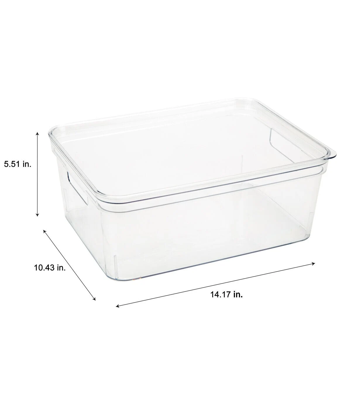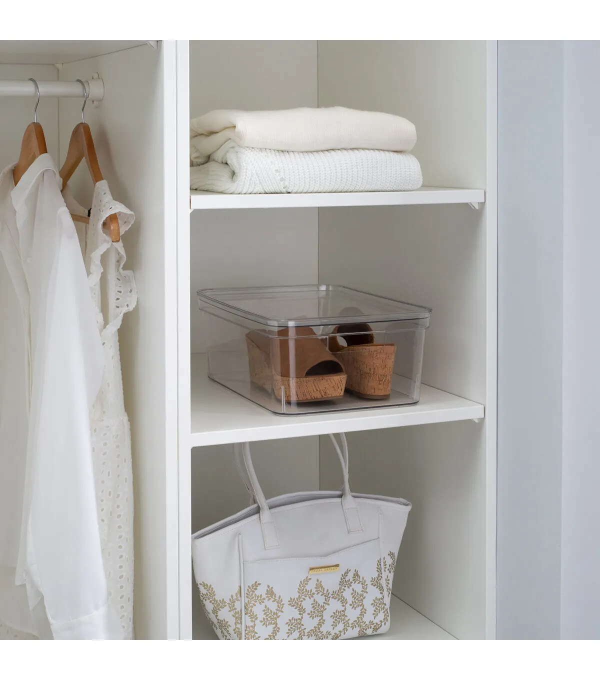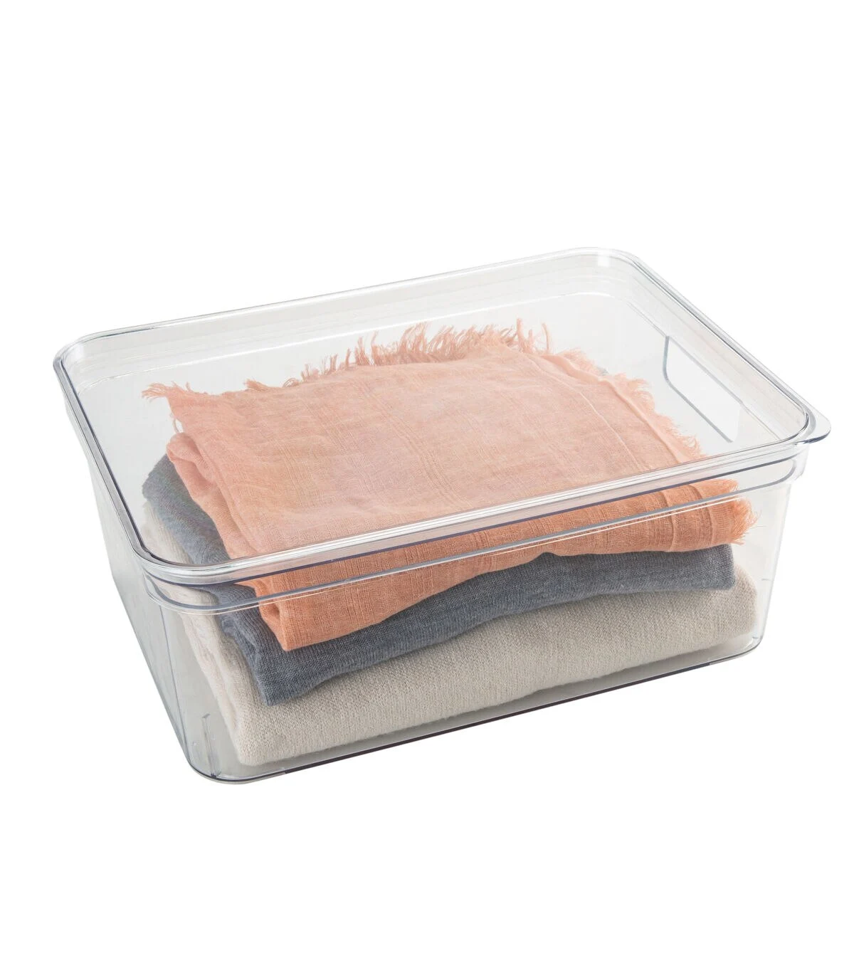 Keep your space organized with the Simplify Medium Lidded Storage Bin. It is the perfect size for desk accessories such as notebooks and staplers. It is also good for holding hand towels and washcloths, and it is the perfect size for holding folded shirts. The stackable design makes it convenient to store items in a sufficient space saving way. The lid protects items from dust and odors and open handles makes the box easy to transport. The clear design makes items inside visible and easy to find. You can keep this transparent storage bin on your desktop or countertop surface because it fits with any room’s décor. You need this bin to help you organize your home!
