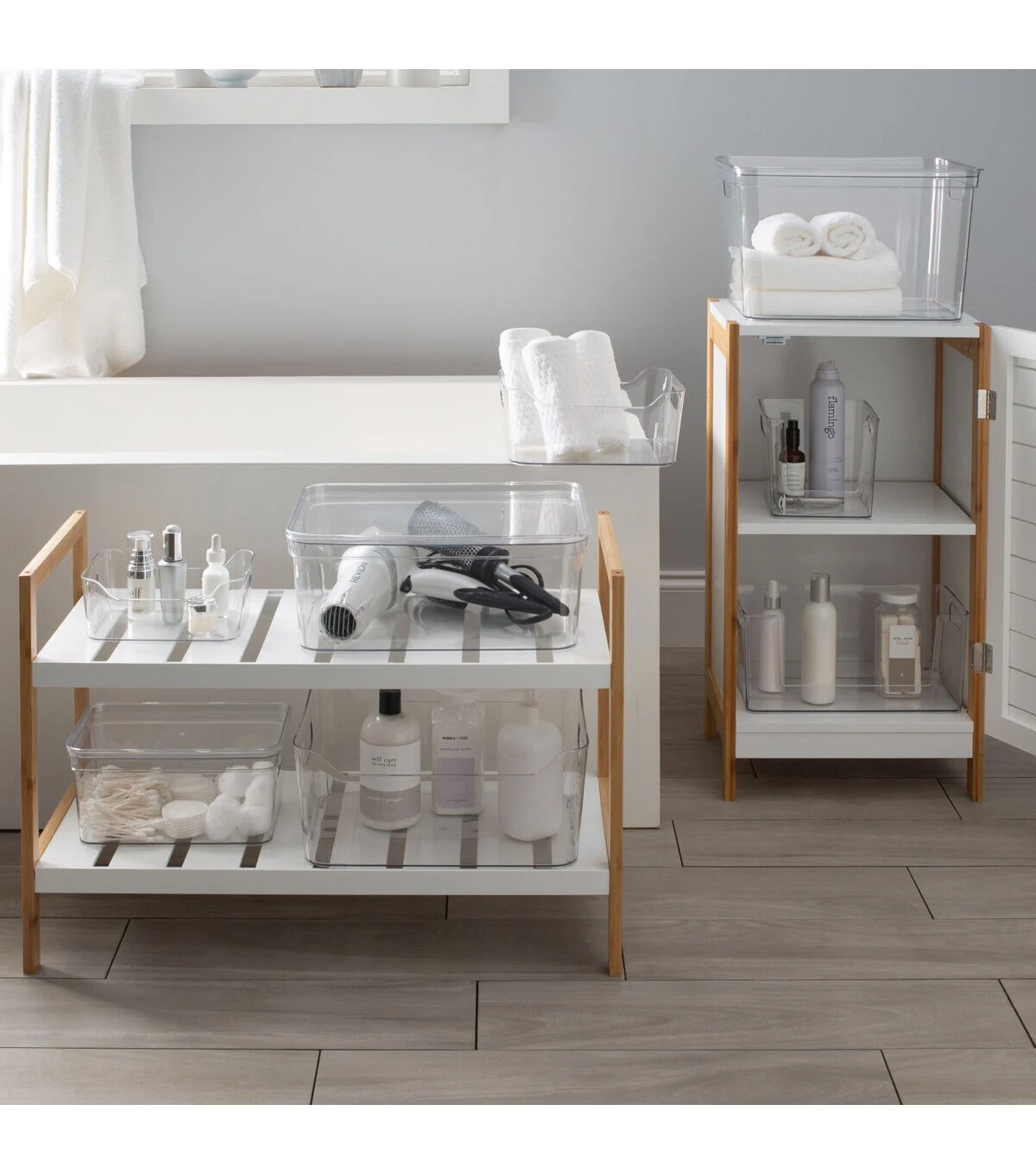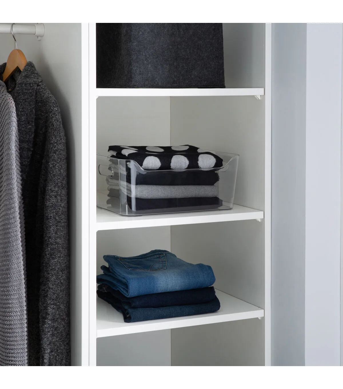 The Simplify Large Storage Tote Bin is the best storage and organization solution. It is the perfect size for desk accessories such as notebooks and staplers. It is also good for holding hand towels and washcloths. Keep it in your bathroom to help organize soaps or hair tools. The clear design makes items inside visible and easy to find. The handle cut outs make it easy to lift and slide the bin. You can keep this transparent storage bin on your desktop or countertop surface because it fits with any room’s décor. You need this bin to help you organize your home!