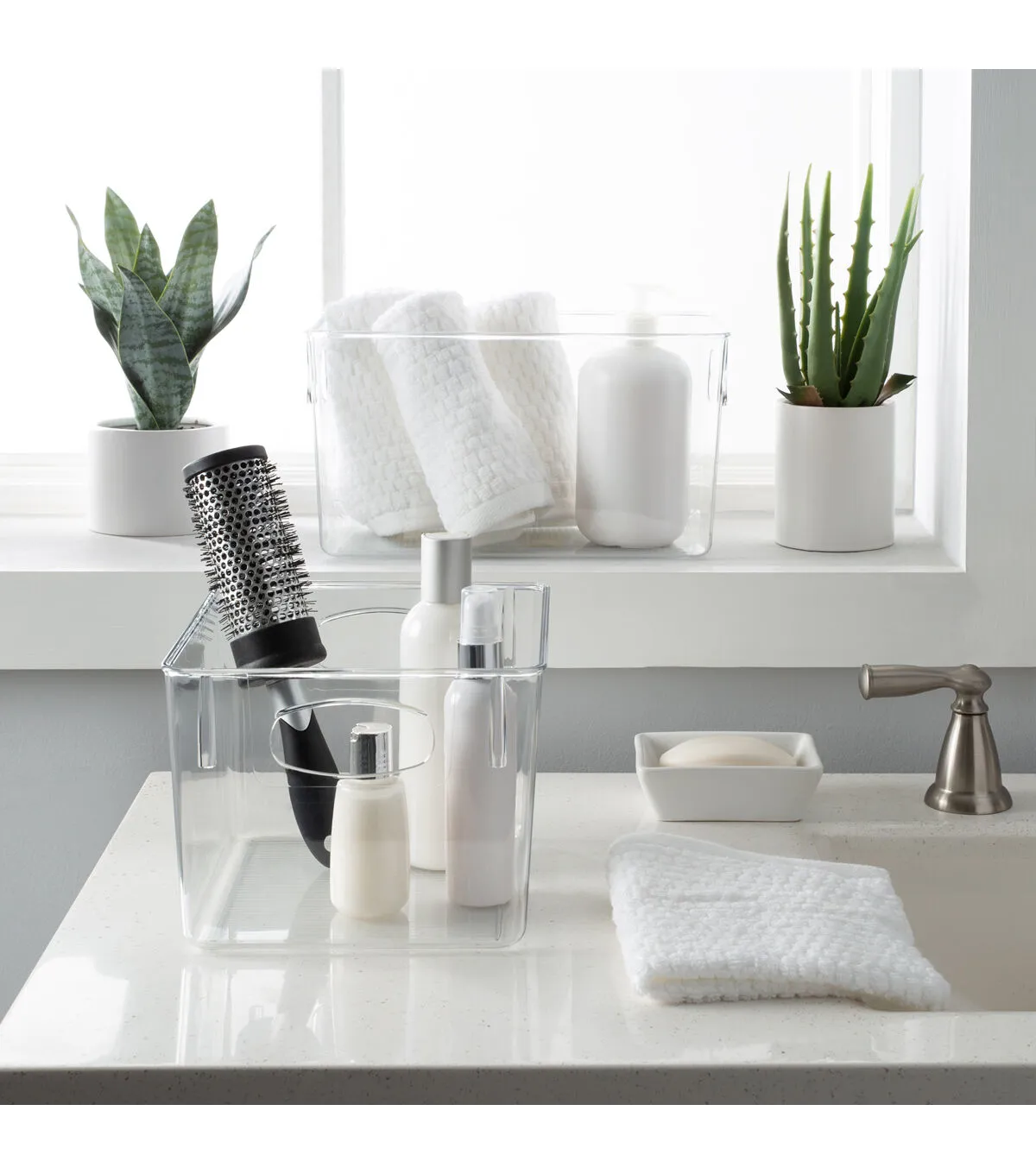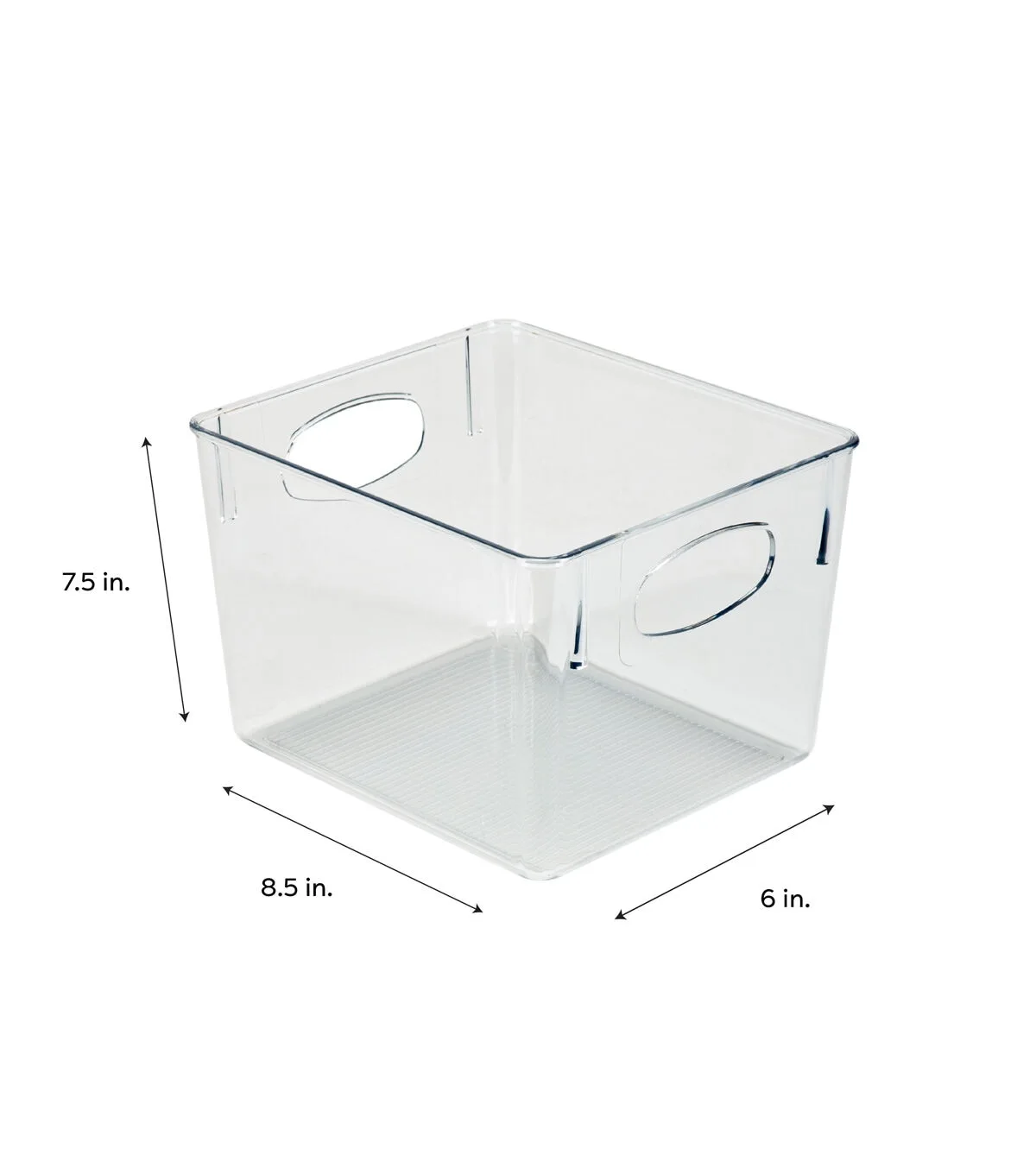 The Simplify Medium Horizontal Storage Bin is the best storage and organization solution. It the perfect size for your kitchen, bathroom, and bedroom. Keep in your office to store desk supplies or use it in the bathroom to hold soaps and washcloths. Or you can store food and pantry items in it and keep it in your cabinets or fridge. The clear design makes items inside visible and easy to find. The handle cut outs make it easy to lift and slide the bin. You can keep this transparent storage bin on your desktop or countertop surface because it fits with any room’s décor. You need this bin to help you organize your home!