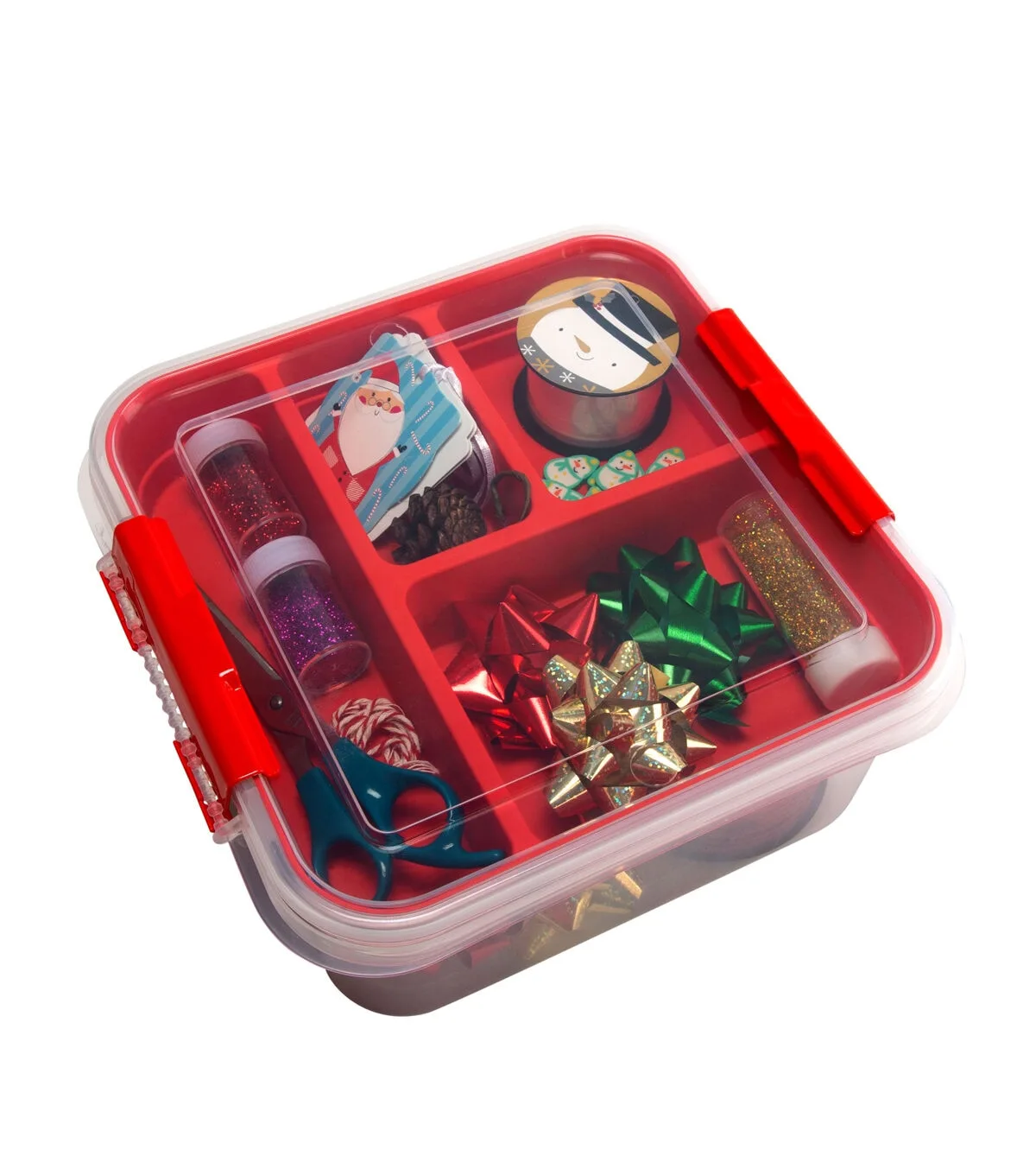 Keep all those ribbons, bows and wrapping little accessories neatly organized this holiday season in the Simplify 5 Compartment Storage Box. The 2 tier storage box and 5 individual compartments, keeps all of your holiday gift supplies neatly organized. The clear top lid allows you to easily see what is inside without having to open the box, the snap tight lid keeps everything securely in place. Stay organized this holiday season with the much needed 5 compartment storage box!