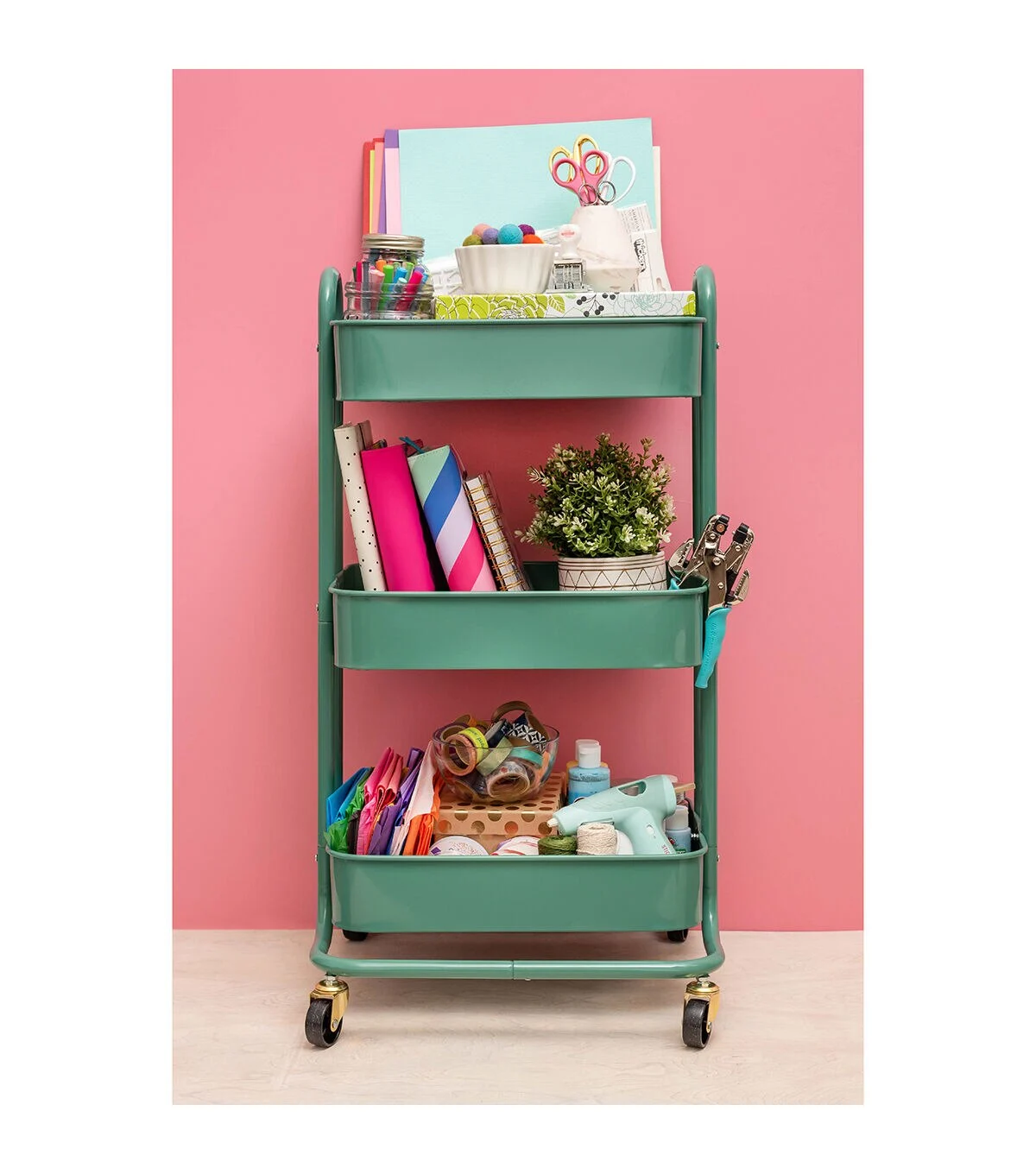 The choice is yours with A La Cart by We R Memory Keepers! This sturdy crafting cart is the perfect addition to your creative space. It features multi-directional wheels for easy transportation and movement, three convenient storage and work shelves.