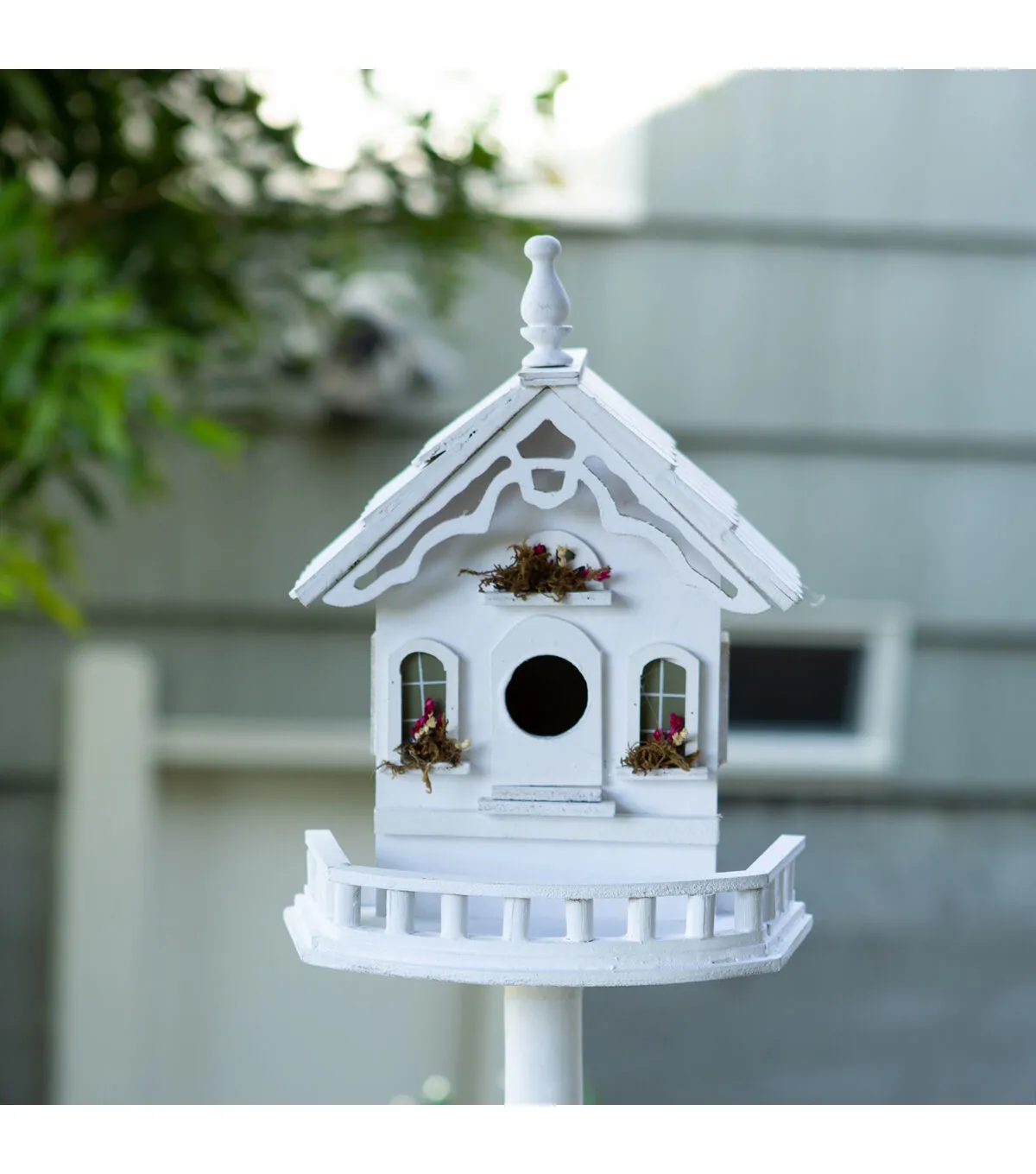 - Lovely little luxury villa with flower boxes and detailed wooden trim for feathered flyers overflows with Old World charm! Sturdy freestanding pole and base included.